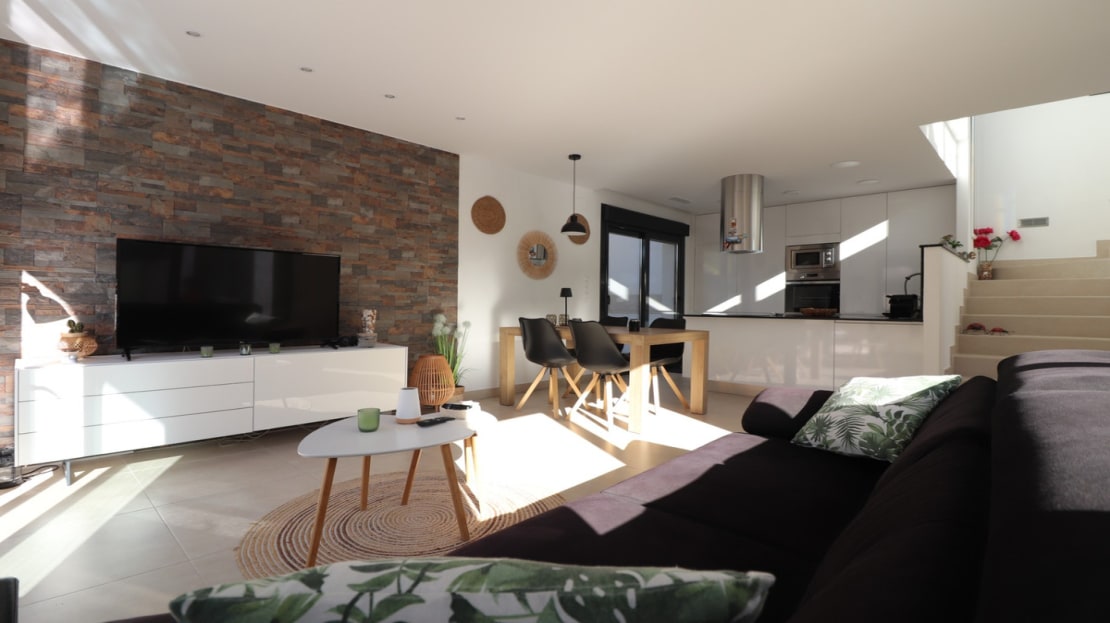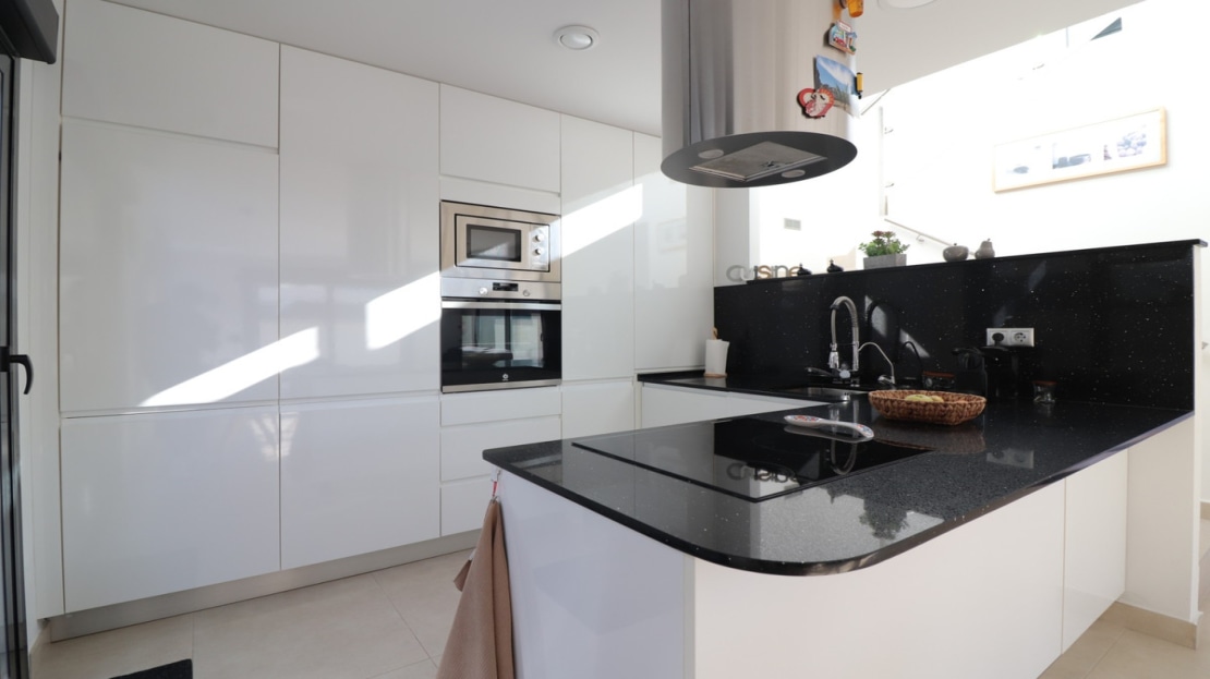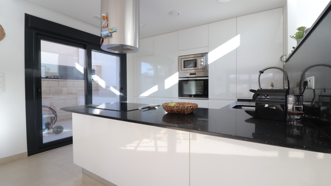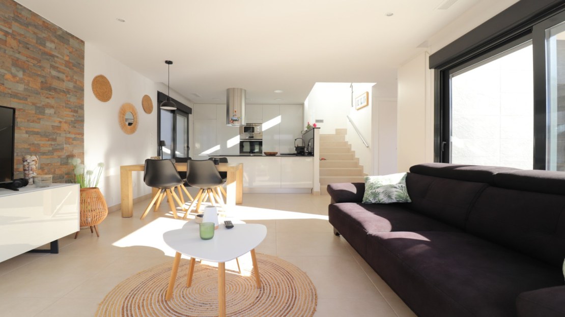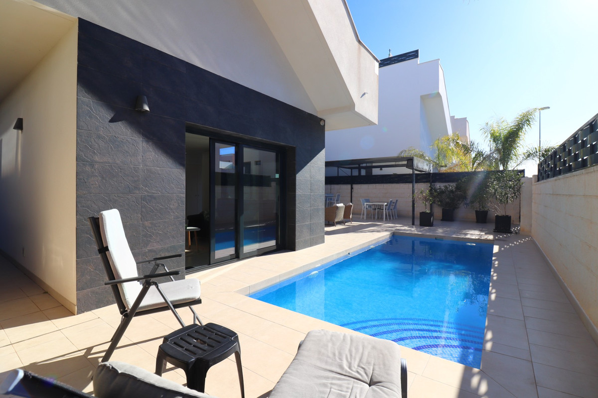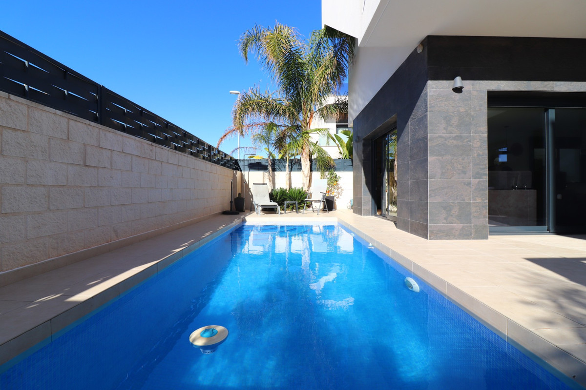 This As New, South West Facing, Detached Villa in Benijofar, is located on the edge of this popular town, within just a 10-minute walk to a wide range of amenities, including a commercial centre, bars, restaurants, a bank, supermarket, shops, pharmacy, school, medical centre, and bakeries. La Marquesa Golf Course is just a 10-minute drive away, while the beautiful beaches of the Costa Blanca can be reached in approximately 15 minutes. Built in 2018 to an exceptionally high standard, this stunning villa offers an open-plan living area with a stylish feature wall in the lounge and large double sliding glazed doors that lead directly out to the pool area. A modern white fitted kitchen, also open-plan, includes additional sliding glazed doors opening out to an outdoor kitchen area. A utility room, a double bedroom with access to the exterior, a cloakroom, and a family bathroom complete the ground floor layout. On the first floor, there are two further double bedrooms, both with access to a terrace, and a stylish family shower room. External stairs lead up to a fantastic solarium, where you can enjoy mountain views and stunning sunsets, as well as an additional family shower room. The low-maintenance tiled garden features off-road parking and a private 6 x 2.8 heated pool, perfect for year-round enjoyment. Additional features include air conditioning throughout, an aluminium storage room, and solar panels for energy efficiency. A beautifully presented home in a sought-after location, perfect for both permanent living and holiday escapes in Costa Blanca South!
