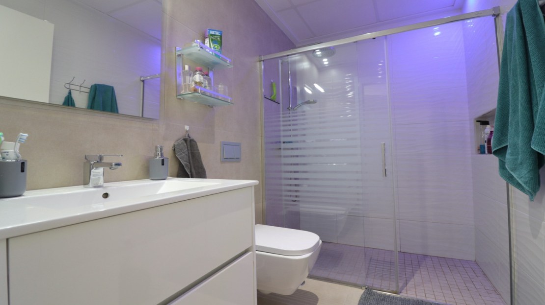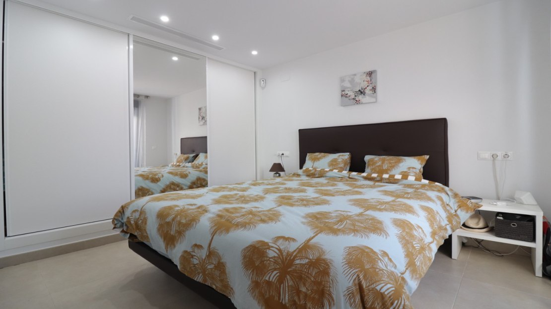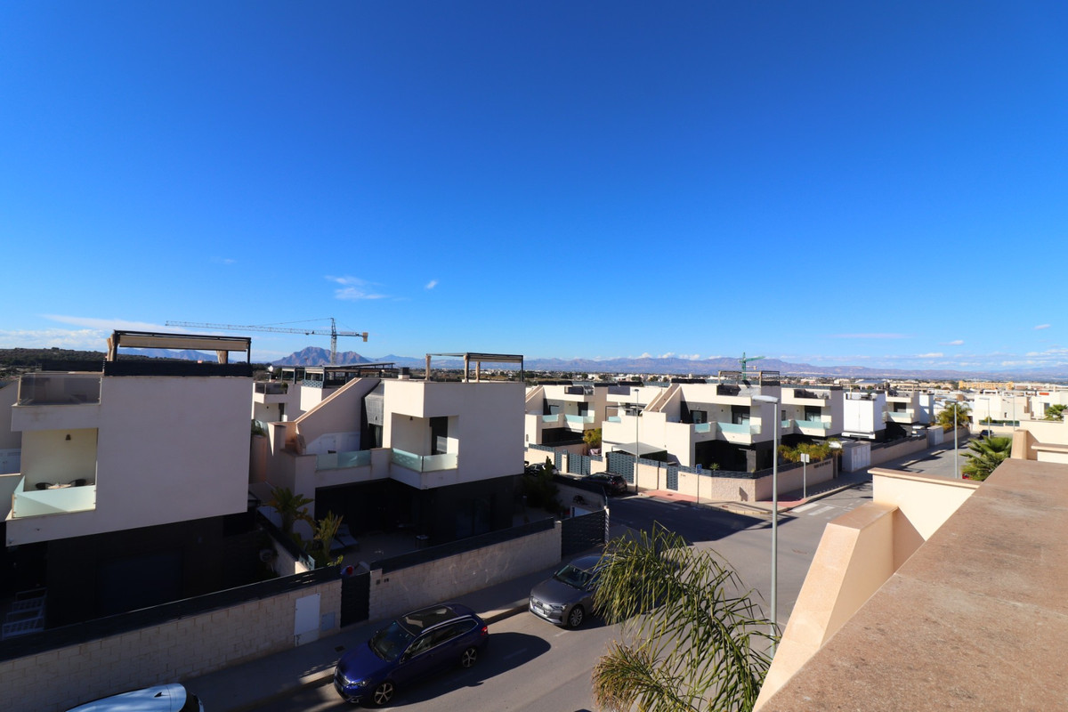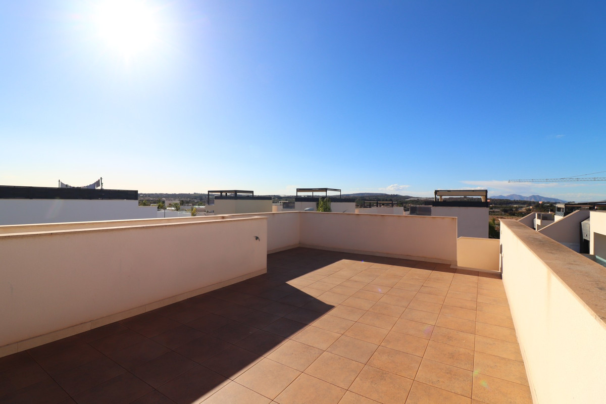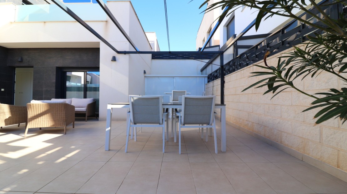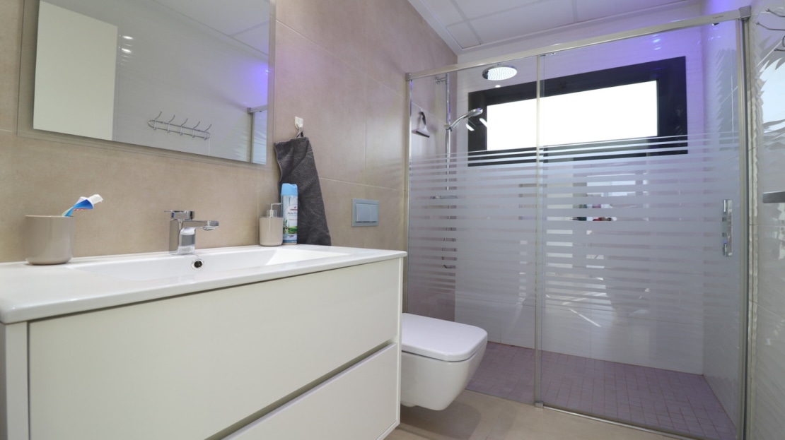 This As New, South West Facing, Detached Villa in Benijofar, is located on the edge of this popular town, within just a 10-minute walk to a wide range of amenities, including a commercial centre, bars, restaurants, a bank, supermarket, shops, pharmacy, school, medical centre, and bakeries. La Marquesa Golf Course is just a 10-minute drive away, while the beautiful beaches of the Costa Blanca can be reached in approximately 15 minutes. Built in 2018 to an exceptionally high standard, this stunning villa offers an open-plan living area with a stylish feature wall in the lounge and large double sliding glazed doors that lead directly out to the pool area. A modern white fitted kitchen, also open-plan, includes additional sliding glazed doors opening out to an outdoor kitchen area. A utility room, a double bedroom with access to the exterior, a cloakroom, and a family bathroom complete the ground floor layout. On the first floor, there are two further double bedrooms, both with access to a terrace, and a stylish family shower room. External stairs lead up to a fantastic solarium, where you can enjoy mountain views and stunning sunsets, as well as an additional family shower room. The low-maintenance tiled garden features off-road parking and a private 6 x 2.8 heated pool, perfect for year-round enjoyment. Additional features include air conditioning throughout, an aluminium storage room, and solar panels for energy efficiency. A beautifully presented home in a sought-after location, perfect for both permanent living and holiday escapes in Costa Blanca South!