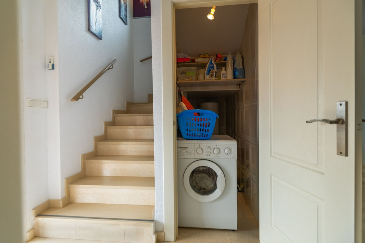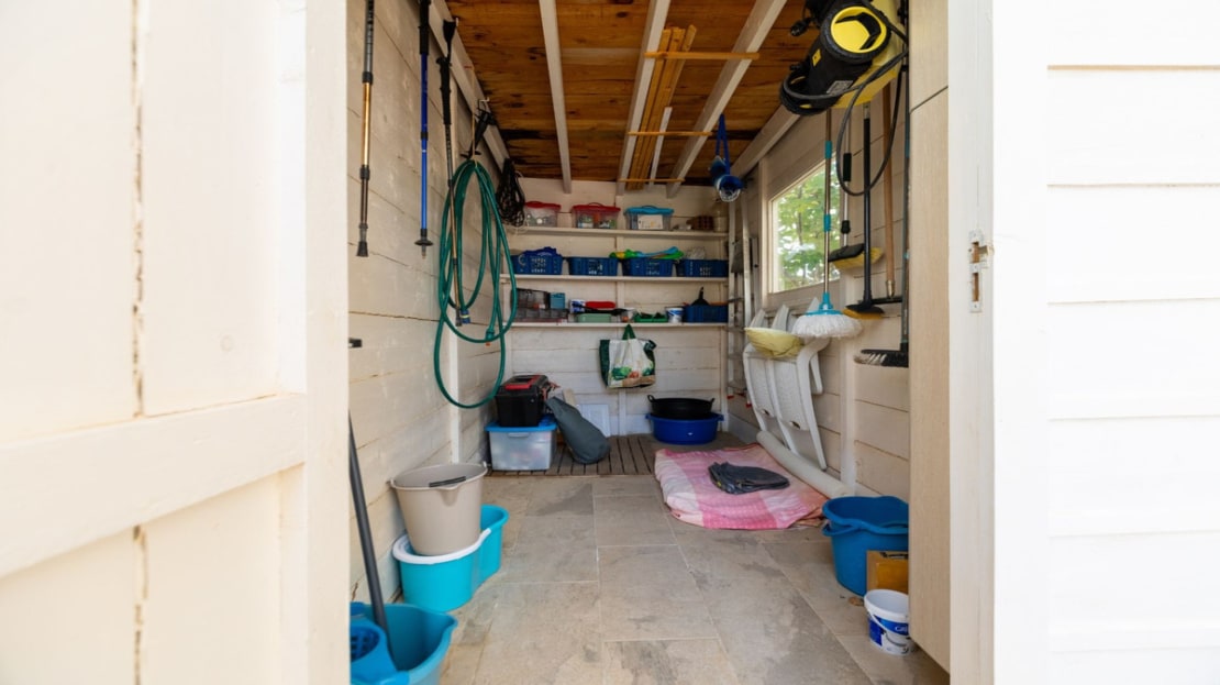 <p>Situated on a quiet, private road, this villa offers tranquility and privacy. Upon arrival, you can park your vehicle on your private gated property. Entering through the front door, you’ll find a spacious hallway with a large guest toilet, a coat closet, and a storage room under the stairs with a water heater.</p>