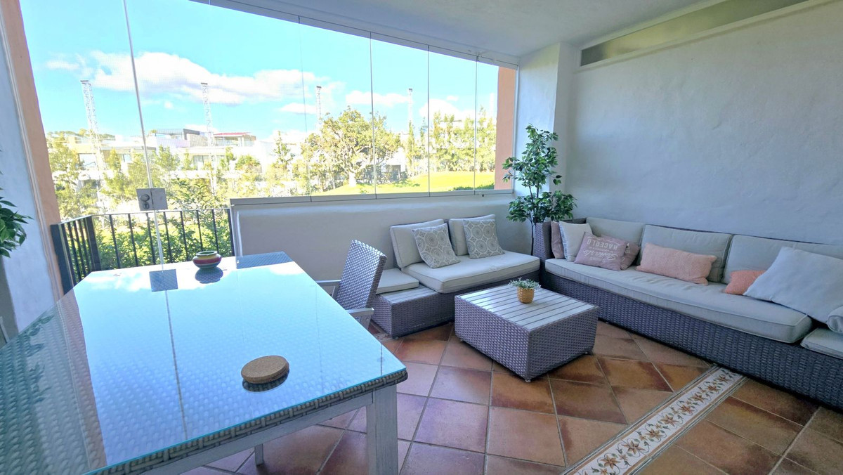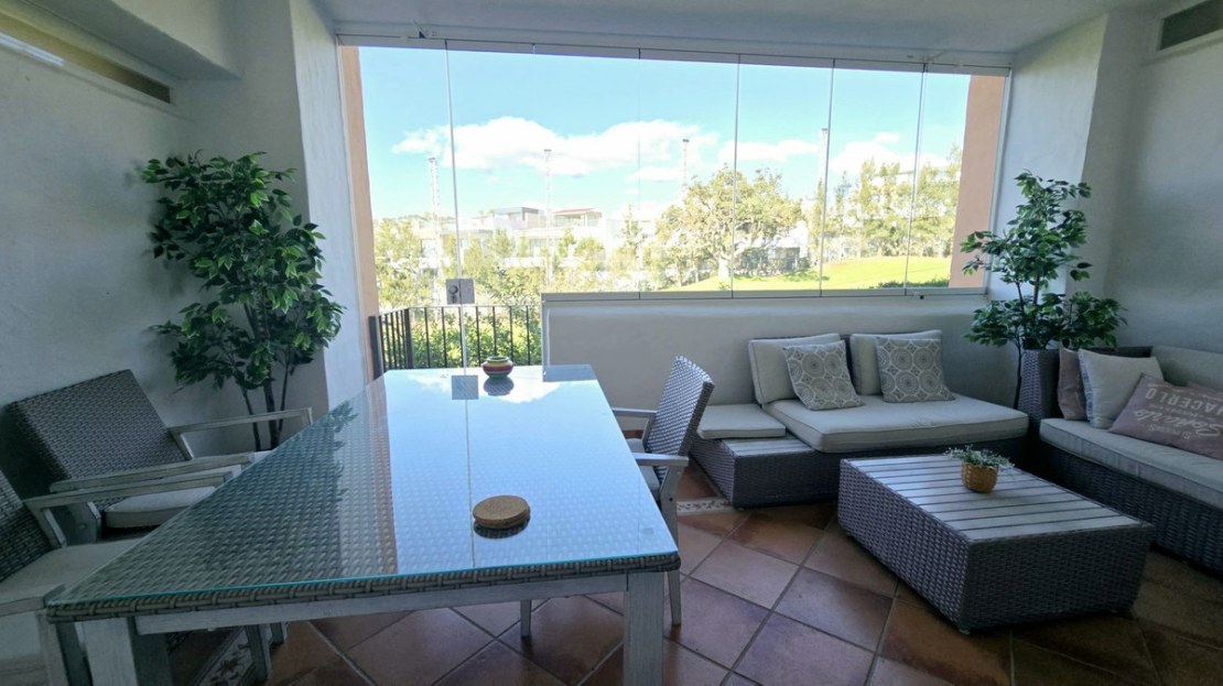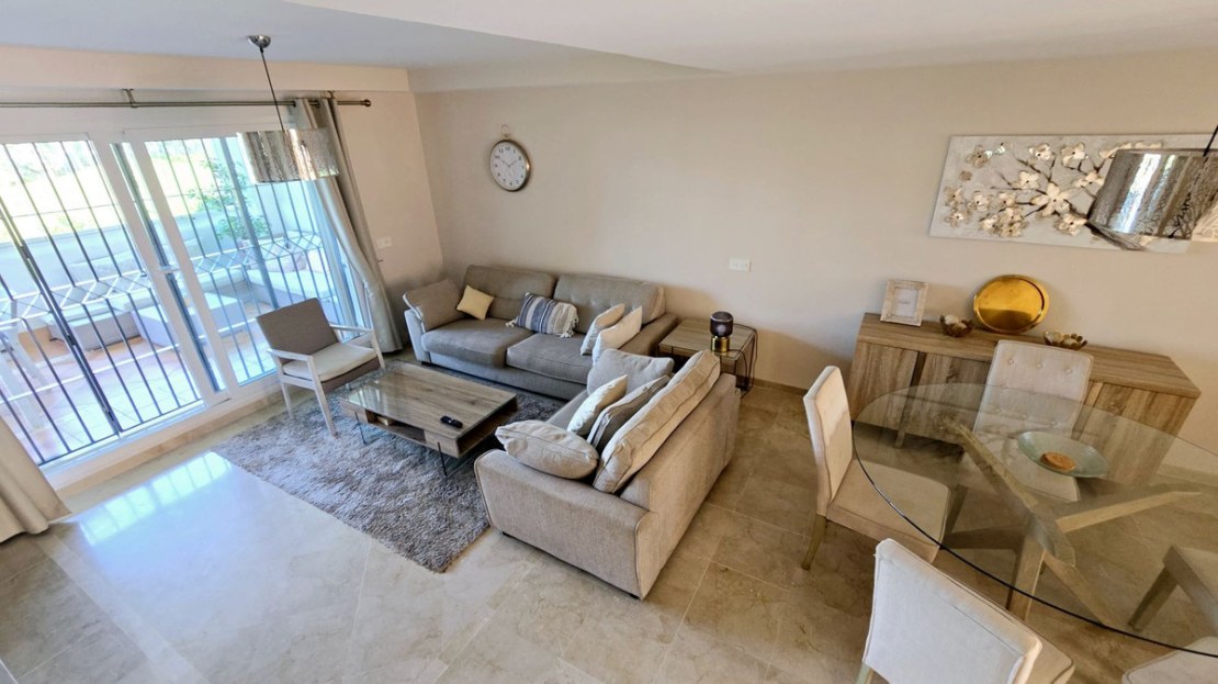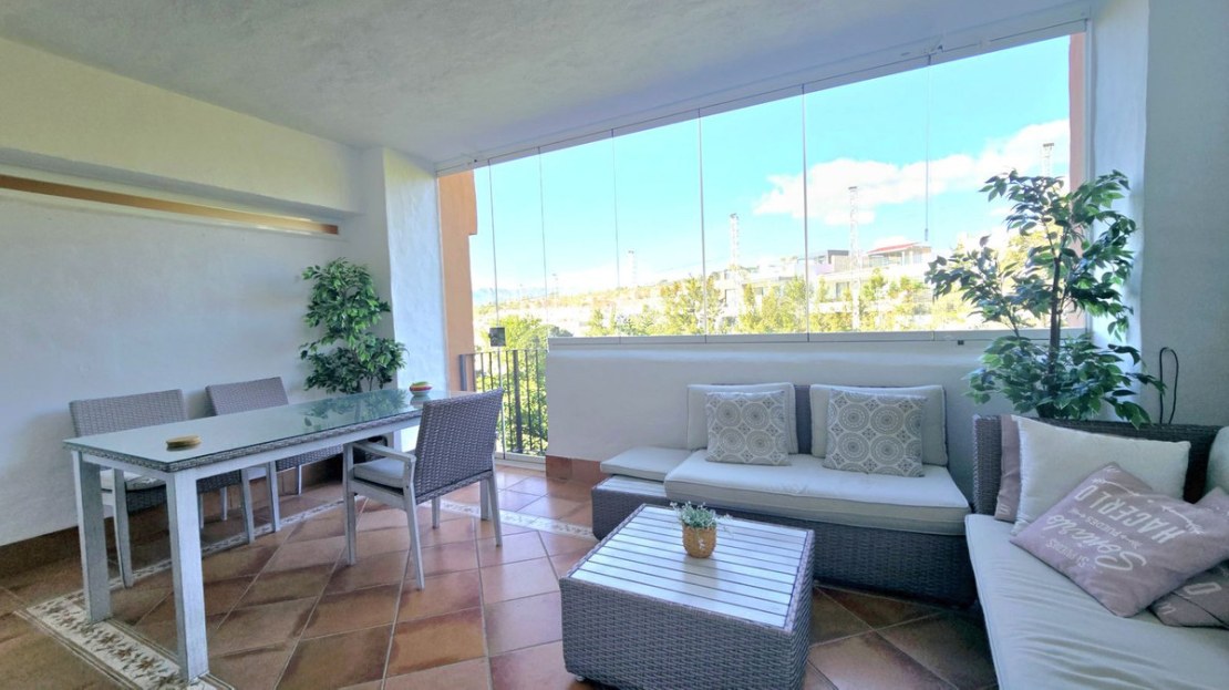 The living room is bright and spacious, with polished marble floors throughout. Boasting a working fireplace and tastefully furnished and decorated. Large patio doors lead to a glass curtained covered terrace, facing south with views of the front line golf, a small gate leads to mature gardens and comunial swimming pool, The property is fitted with security gates