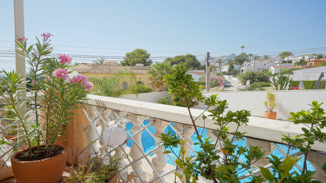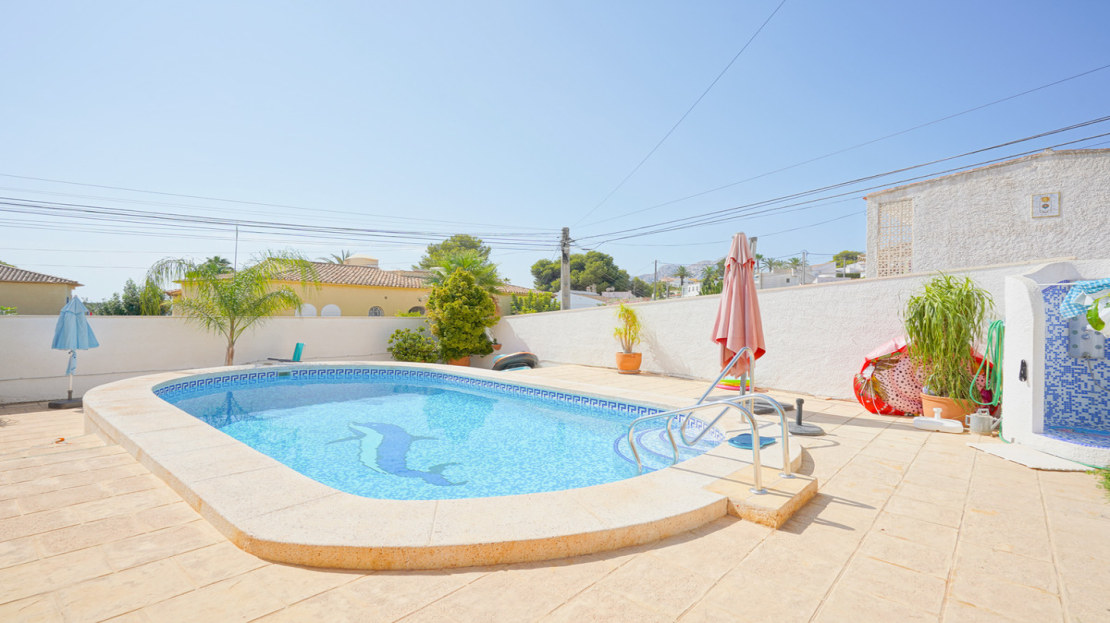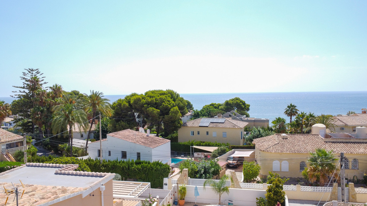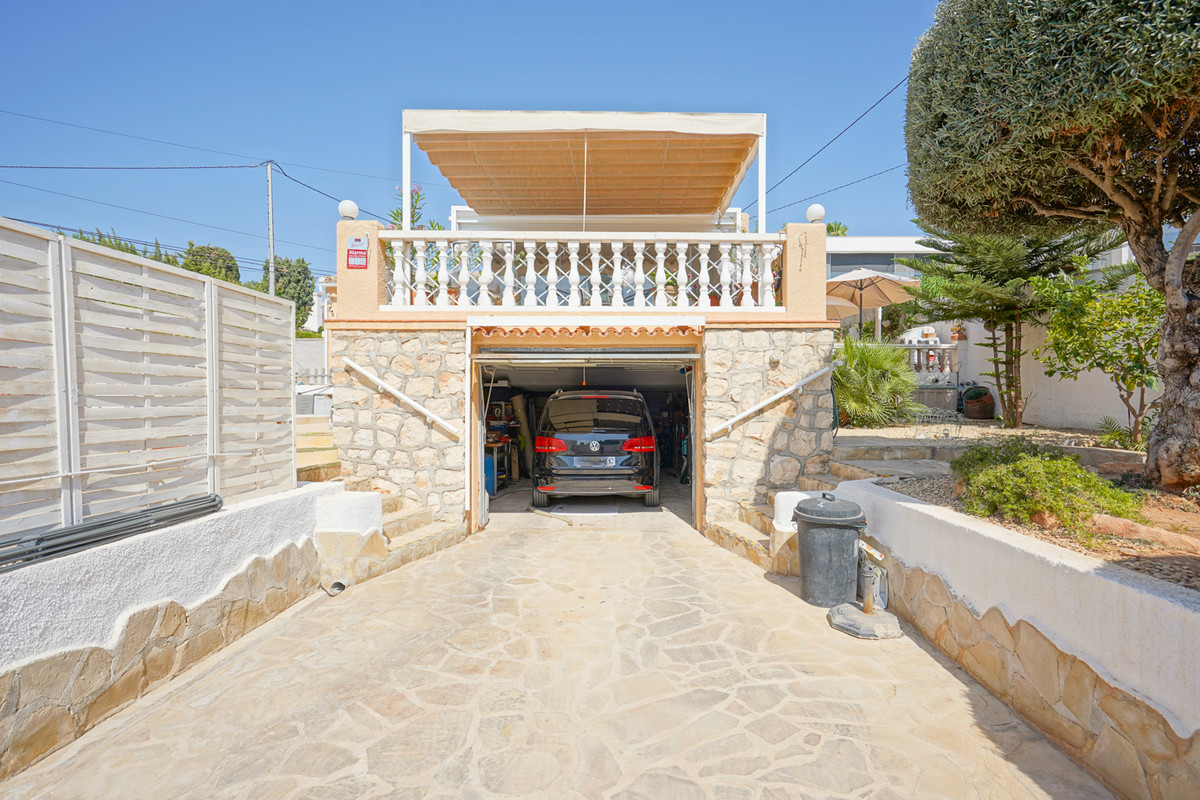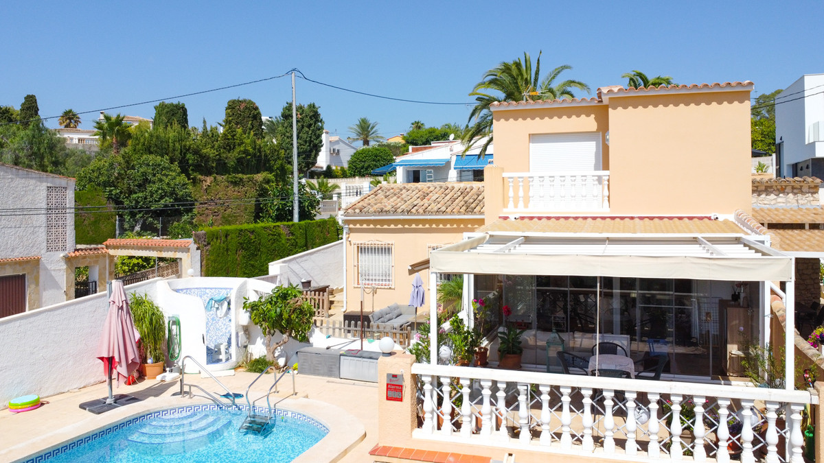This traditional villa is located in a quiet urbanisation on the idyllic coast of Benissa, a stone's throw from lively Calpe. Thanks to its unique location, you will enjoy breathtaking views of the azure sea and the iconic Peñón de Ifach here. Spread over two floors and with an additional garage in the basement, this villa offers everything you need. The spacious ground floor comprises a bright living room, a modern kitchen, a stylish glazed-in naya, two comfortable bedrooms, two bathrooms, a dressing room and a multi-purpose storage room. The upper floor, accessed via an external staircase, features a quadruple bedroom with an en suite bathroom and a balcony, ideal for guests. Soak up the sun on the various terraces at different elevations, or take a refreshing dip in the large oval-shaped pool with hot outdoor shower. With underfloor heating on the ground floor and infrared heating upstairs, plus air conditioning on both floors, you will experience ultimate comfort all year round. Less than five minutes' walk will take you to the picturesque beach of Mallorquí, where a scenic coastal footpath starts and takes you in one direction to Calpe and in the other along the crystal-clear coves of Benissa to the popular sandy beach of La Fustera.