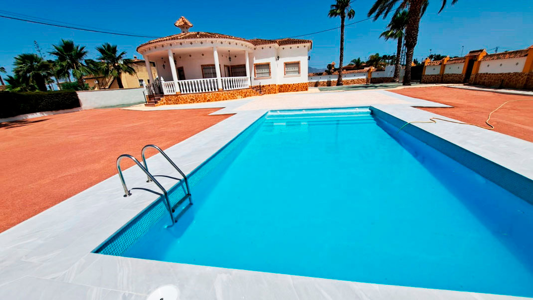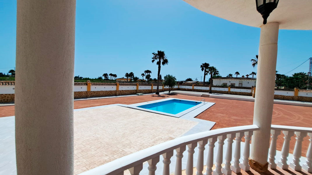 Modern finished villa in the Catral countryside.There is a living area of 147 m2, comprising three bedrooms with fitted wardrobes, two bathrooms , one of which is ensuite, a spacious living/dining room and a modern kitchen.At the front of the property there is a covered terrace and to the side a storage room located under the stairs leading to the roof terrace with views of the countryside.There is also a beautiful modern 10 X 5 swimming pool.The property has pre-installation of air conditiong and the entrance gate can be connected to an electric motor.Located on a walled plot of 2048 m2 landscaped with gravel for easy maintenance.Only minutes from the centre of Catral , 15 minutes drive to the beautiful sandy beaches of La Marina and 30 minutes to Alicante airport.