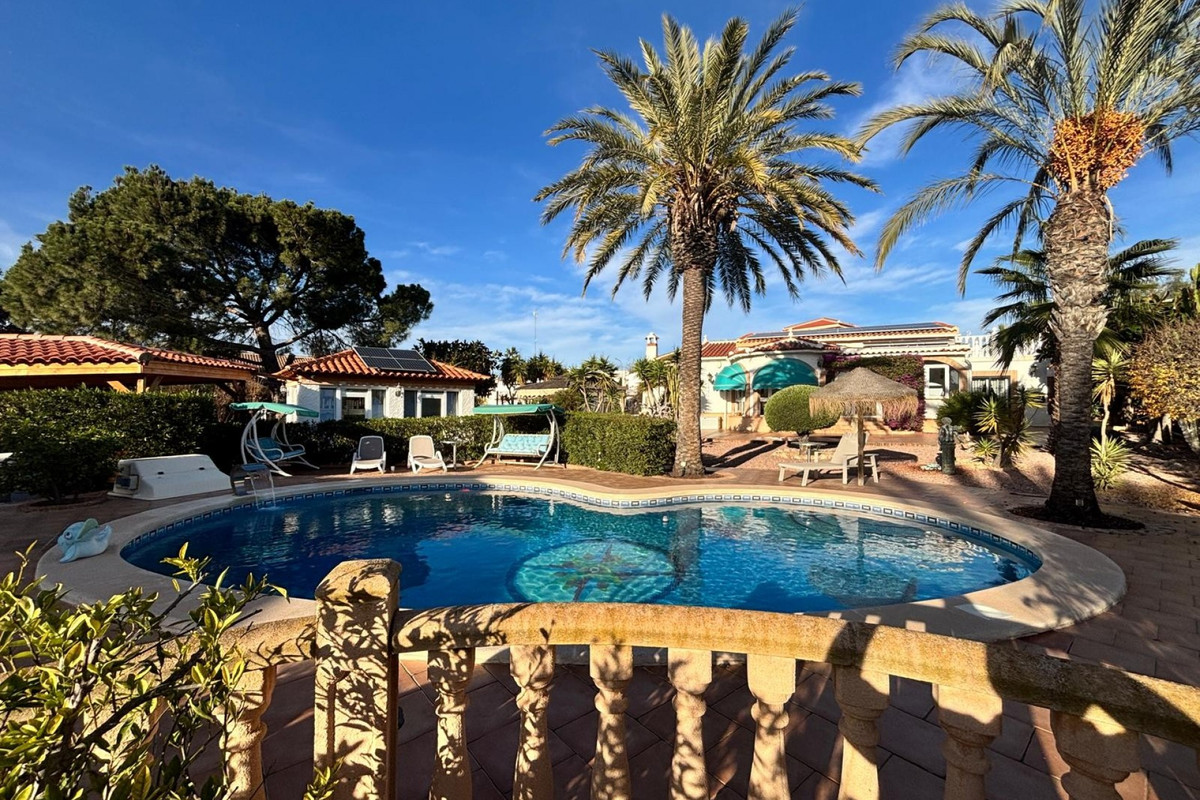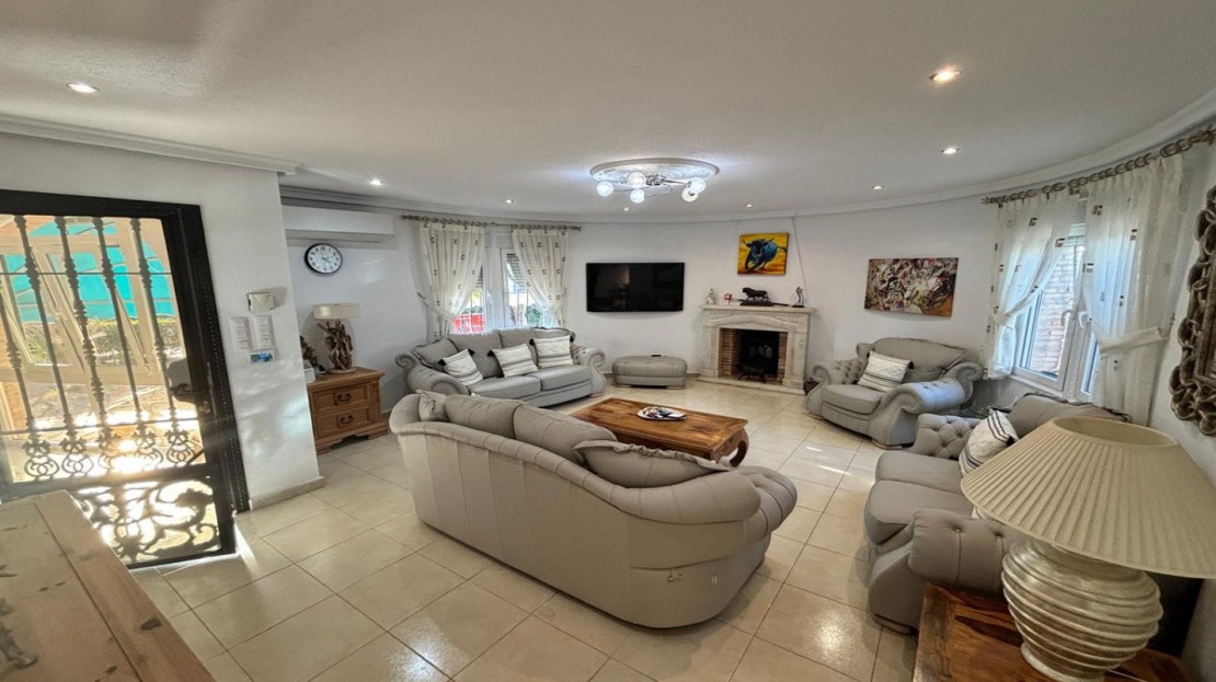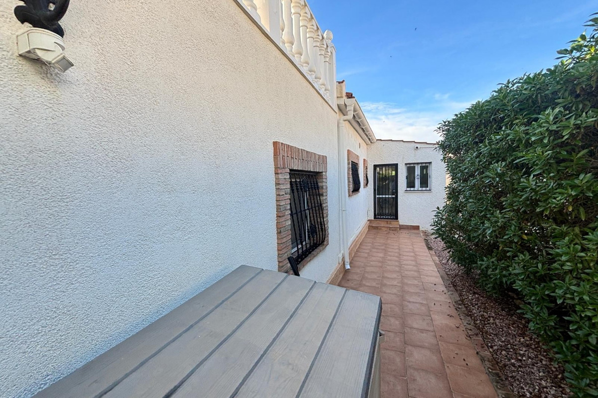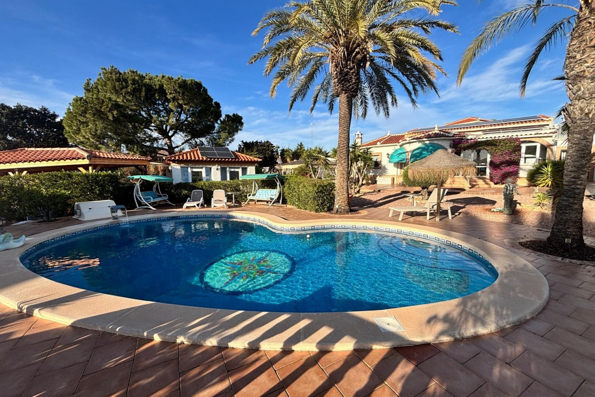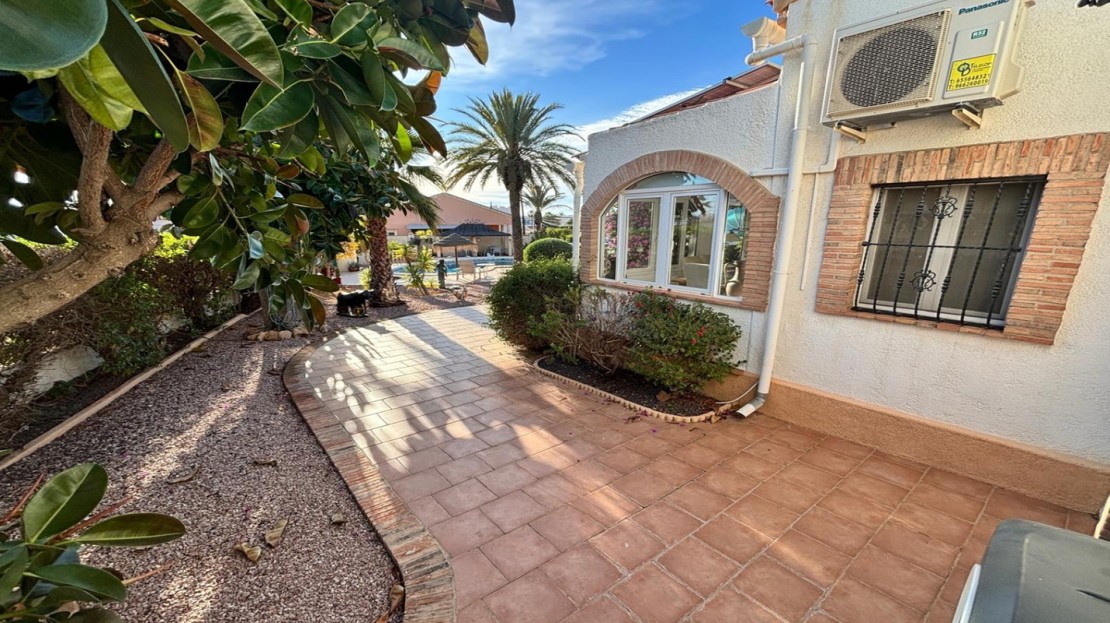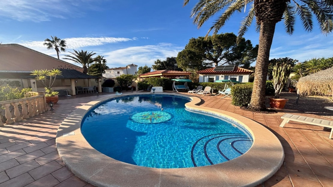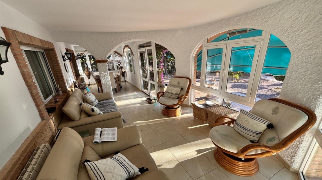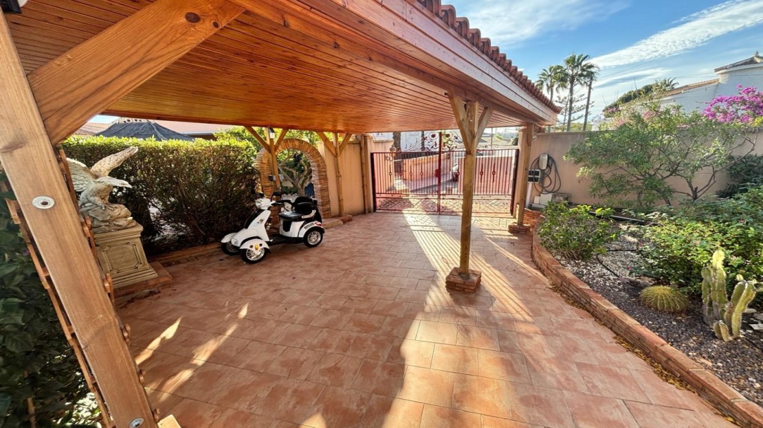 Here we have this stunning detached Villa in Central Quesada. The villa is set on a plot of around 1200m and has a large build area of around 190m. There are 3 bedrooms and 2 bathrooms in the main house with large lounge open plan kitchen and dining room and a separate large utility area all brand new and very modern. There is central heating and air-con through out and double glazed tilt and turn windows. There is a large glazed Naya which is alo a dining area stroke sitting room with views to the garden and pool. Outside the landscaped plot with large kidney shaped pool has an outside kitchen and bbq area shower for the pool and plenty of sitting areas. There is also a smaller building which houses an office and a further shower and and toilet with changing room. The property has 21 solar panels, large car port , 300 litre immersion heater, gas boiler, Alarm and cctv cameras. Overall and stunning fully furnished property just 3 minutes walk to town.