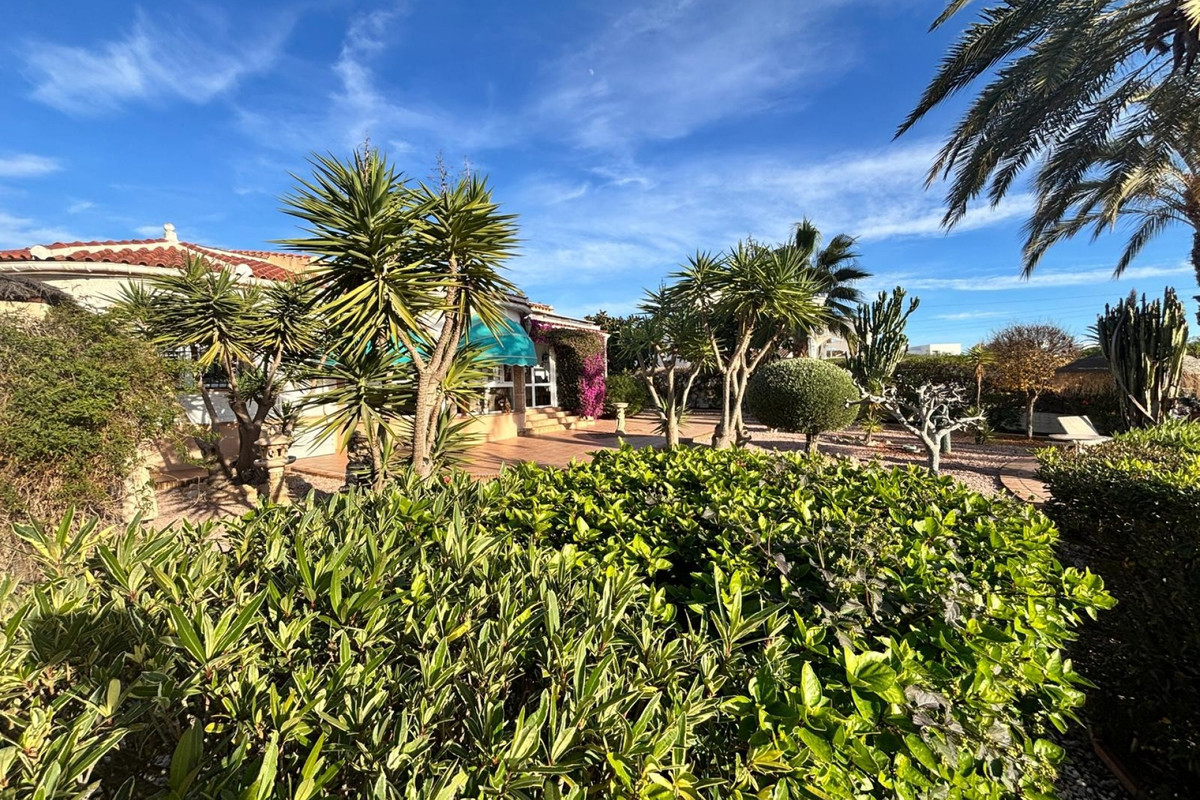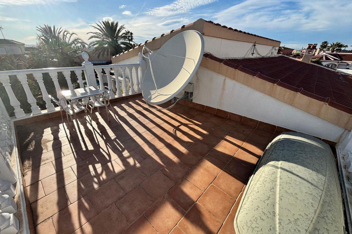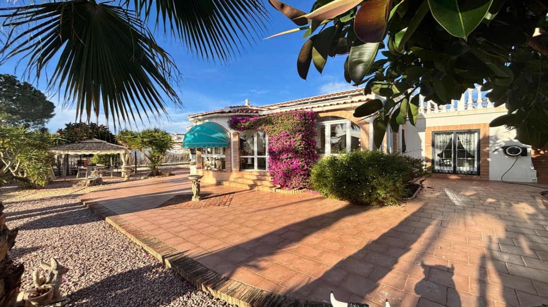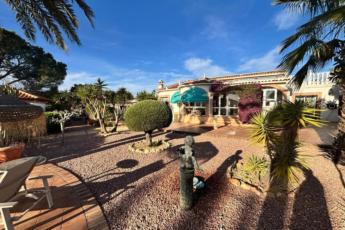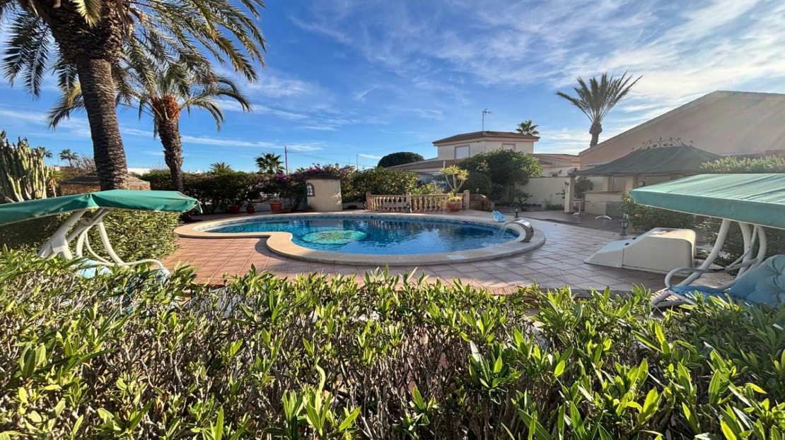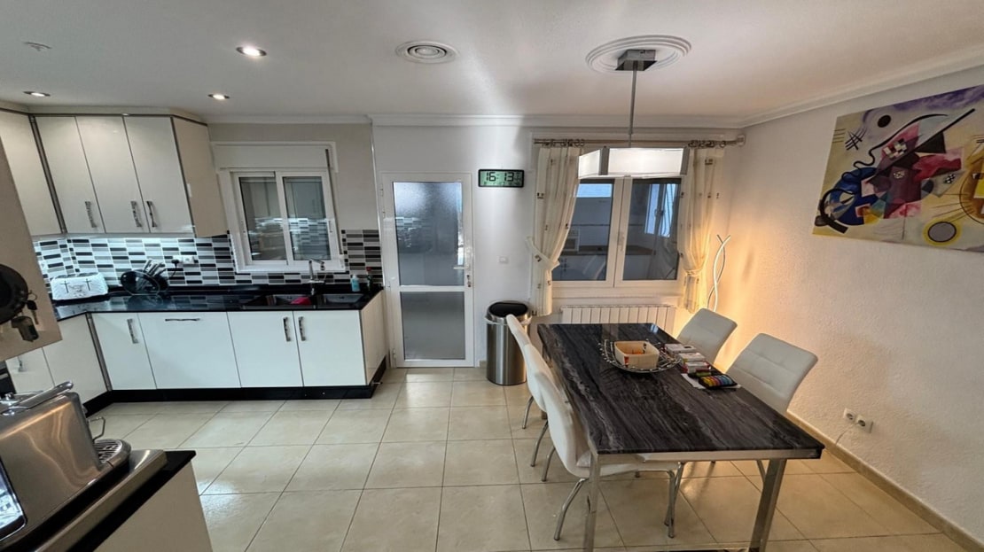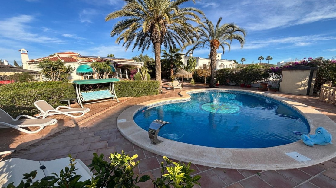 Here we have this stunning detached Villa in Central Quesada. The villa is set on a plot of around 1200m and has a large build area of around 190m. There are 3 bedrooms and 2 bathrooms in the main house with large lounge open plan kitchen and dining room and a separate large utility area all brand new and very modern. There is central heating and air-con through out and double glazed tilt and turn windows. There is a large glazed Naya which is alo a dining area stroke sitting room with views to the garden and pool. Outside the landscaped plot with large kidney shaped pool has an outside kitchen and bbq area shower for the pool and plenty of sitting areas. There is also a smaller building which houses an office and a further shower and and toilet with changing room. The property has 21 solar panels, large car port , 300 litre immersion heater, gas boiler, Alarm and cctv cameras. Overall and stunning fully furnished property just 3 minutes walk to town.