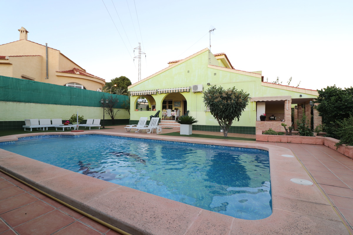 This Quality, Personally Designed Detached Villa in Ciudad Quesada is located centrally in this bustling and highly popular town, within a 5 to 10 minutes walk of a wide variety of bars and restaurants, shops, supermarkets, tobacconist, pharmacy, banks, medical centre, optician, travel agents, fitness gym, hairdressers, bowling, mini golf and more… Whilst the nearest beaches are situated at Guardamar del Segura in just a 12 minute drive. This lovely, well maintained property comprises on the extremely spacious ground floor of a beautiful curved entrance; opening in to the large lounge with feature wooden beams; open plan fully fitted kitchen with a huge dining table and a feature double sided fireplace, heating the whole living area; a wide hallway currently offering a desk space; with two more than double sized bedrooms off; and a family bathroom. From the kitchen there are double doors out to the rear, covered terrace, perfect to dine outdoors whilst overlooking the beautiful garden and private swimming pool. External stairs lead to the totally independent first floor; where there is a separate apartment or guest quarters, comprising of an open plan fully fitted kitchen with dining space, settee and access out to the surrounding terrace; a wide hallway currently with bunk bed; leading through to the magnificent sized double bedroom, with walk in wardrobe and double doors out to a private terrace space. Both 1st floor terraces with panoramic views across the area and salt lakes beyond. Outside is a kitchen, shower room and toilet, plenty of outdoors dining and sunbathing areas, different fruit trees, garden shed and a long driveway, being the only connection to the road, making this property quite private! Extras include A/C in the living room, kitchen and master, grilles across the ground floor, water softener and more…<br /