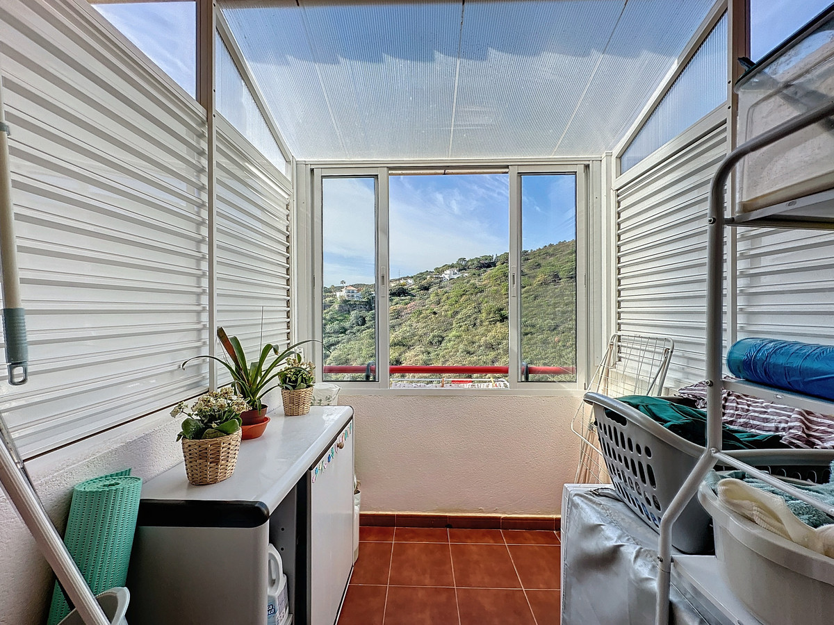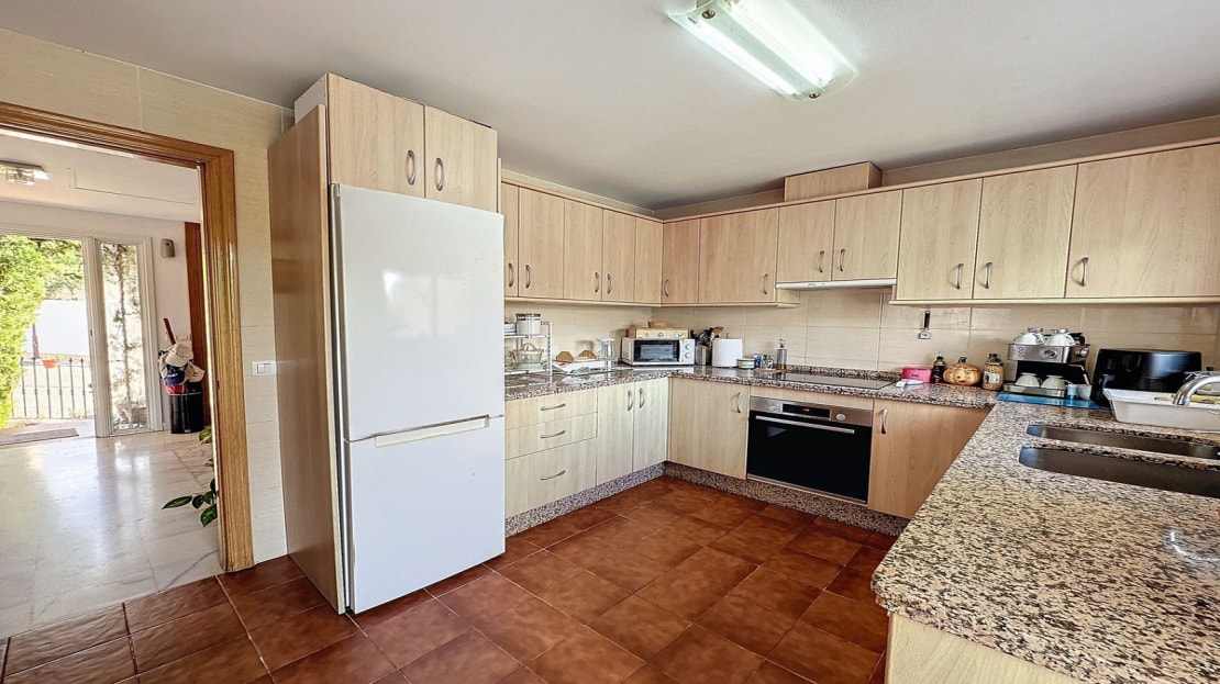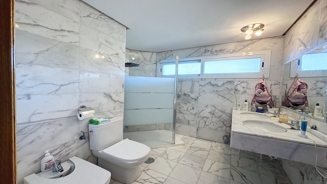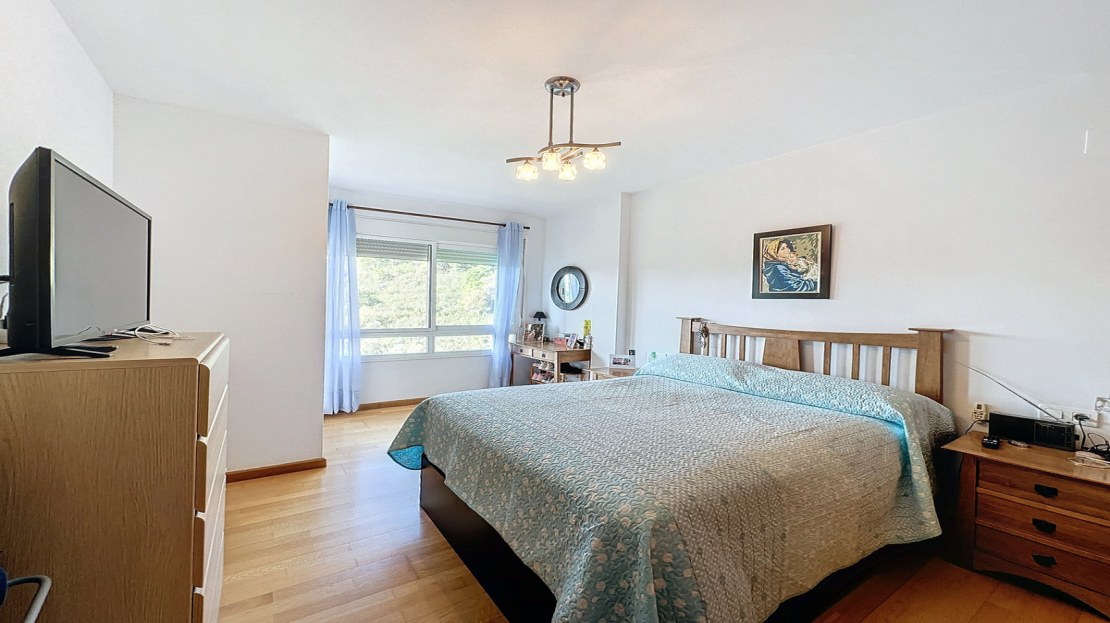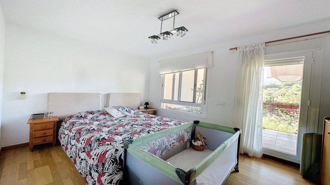 Downstairs, are displayed the 3 bedrooms with fitted wardrobes and 2 bathrooms. The master bedroom has an en-suite bathroom and access to another terrace with the same open views of the surrounding mountains and vegetation. On this floor, there is a utility room providing additional storage.