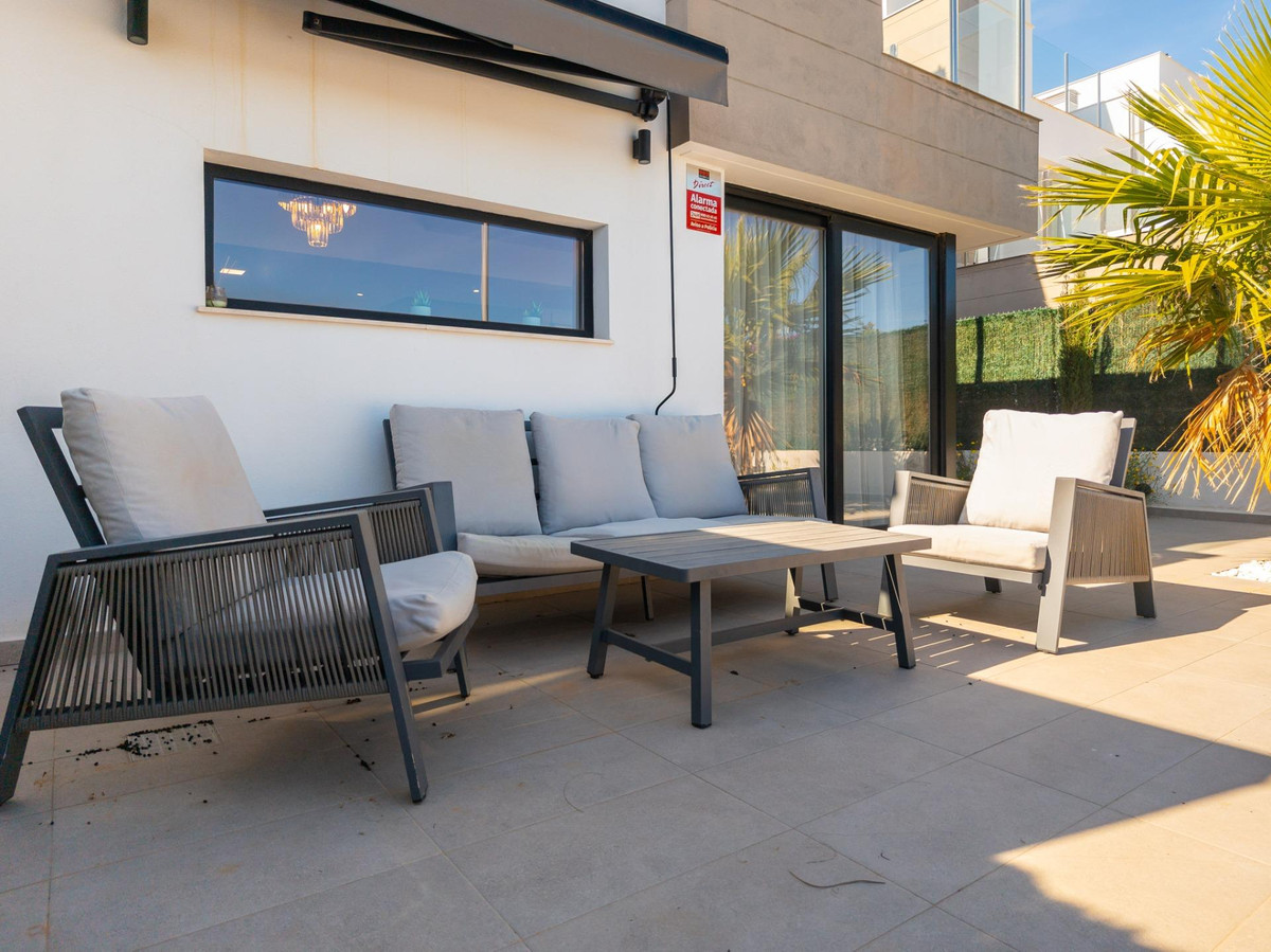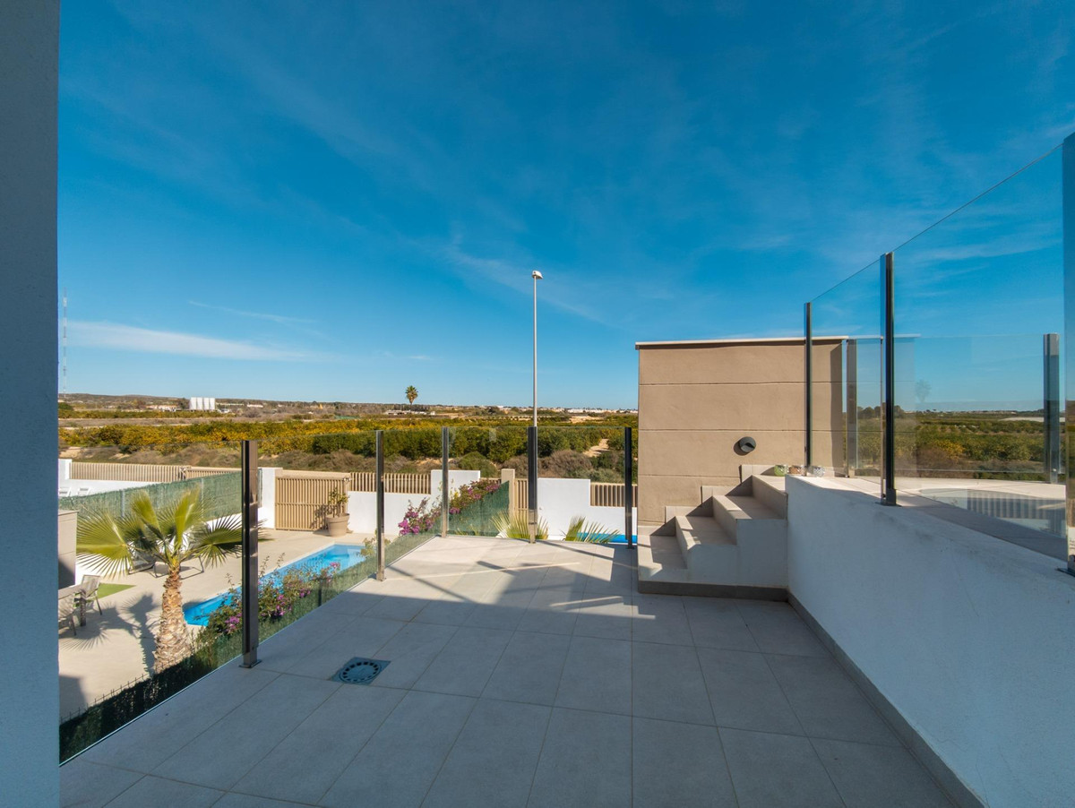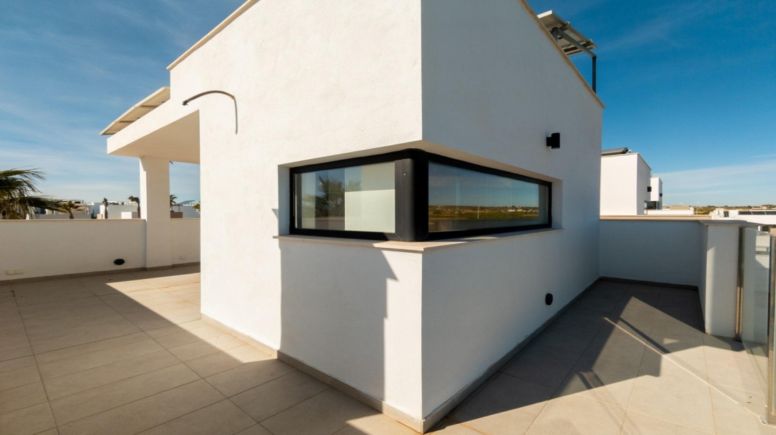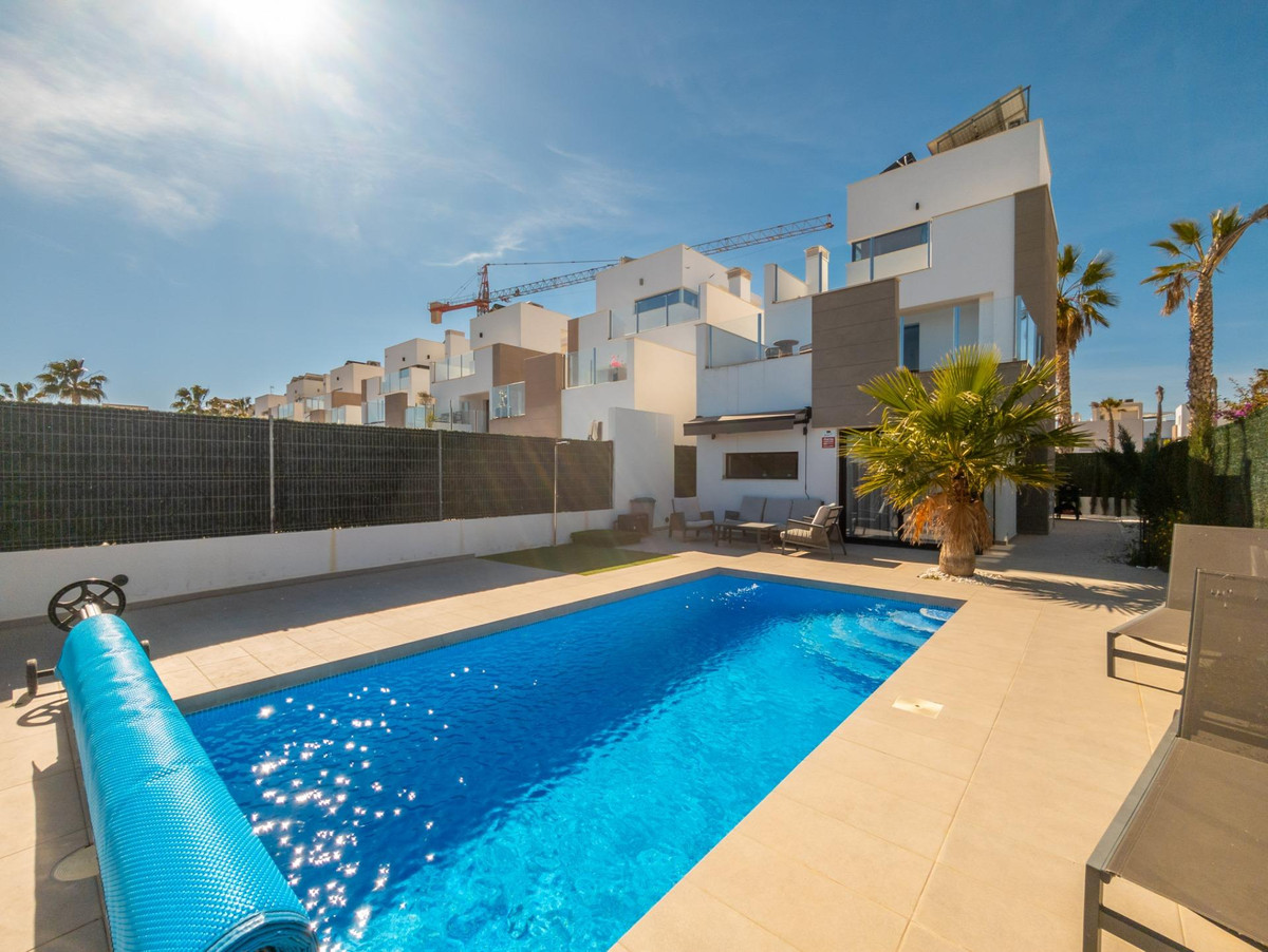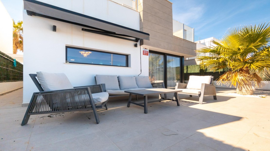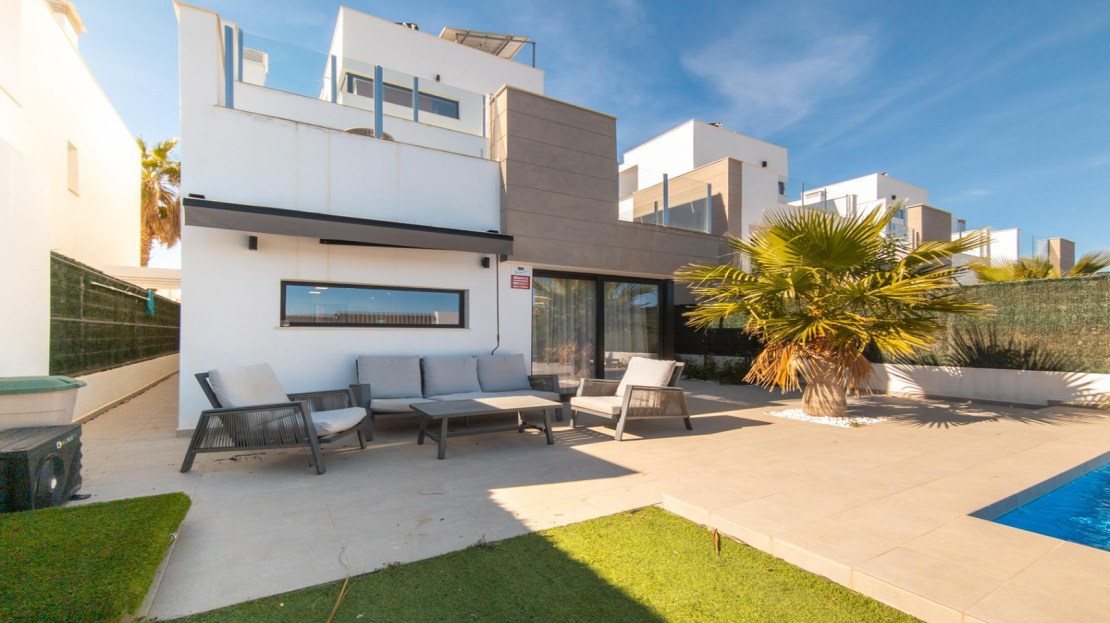 “An exceptional contemporary style detached villa built over three floors and just 2 years old is immaculately presented. You enter the garden onto a large tiled terrace surrounding the private heated pool with Roman steps, with ample space for sun loungers plus off road parking. It is a private space with a dining/seating area complete with sun awnings and patio doors leading into the lounge.