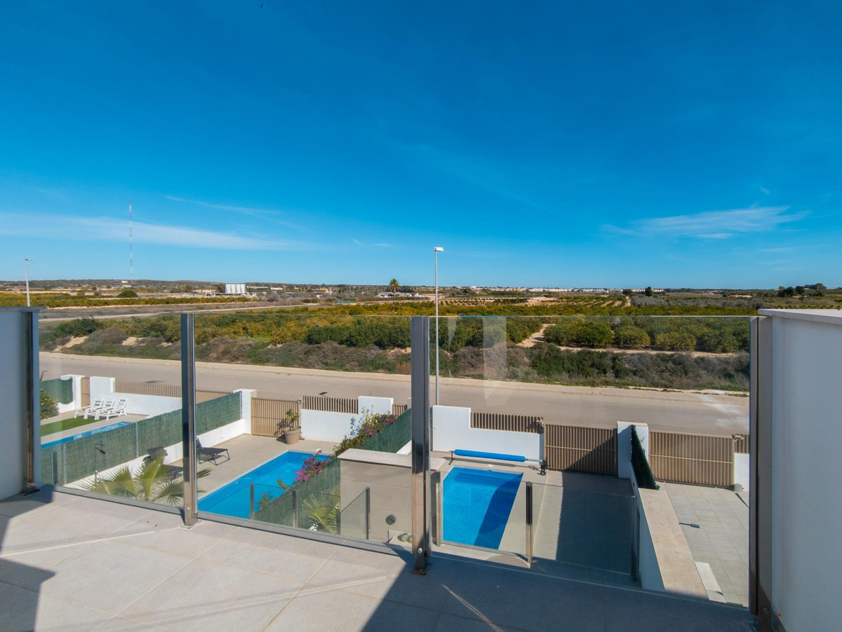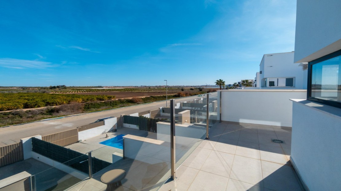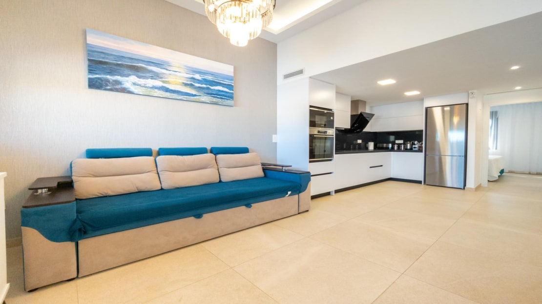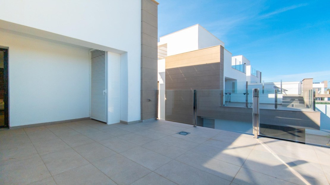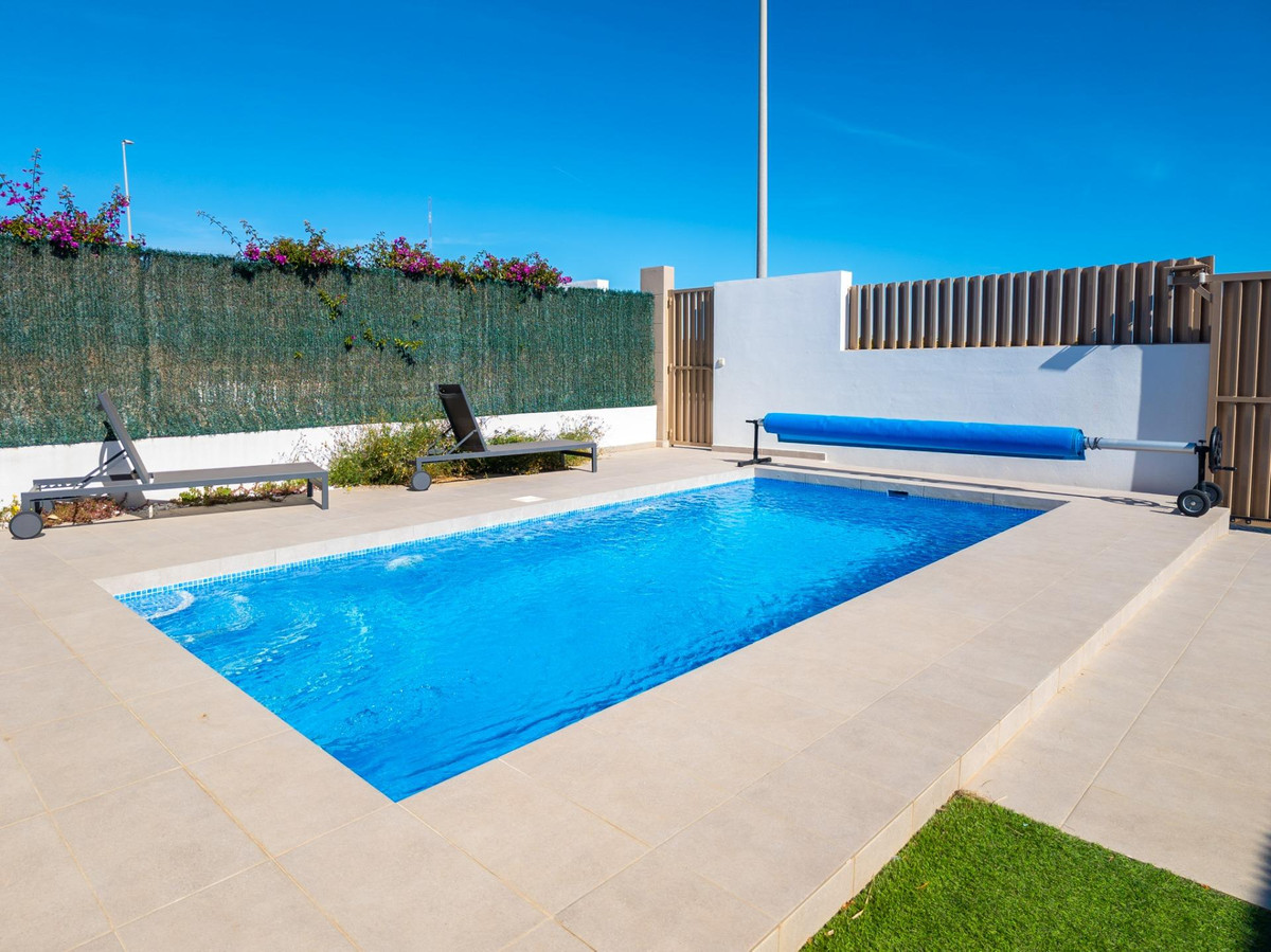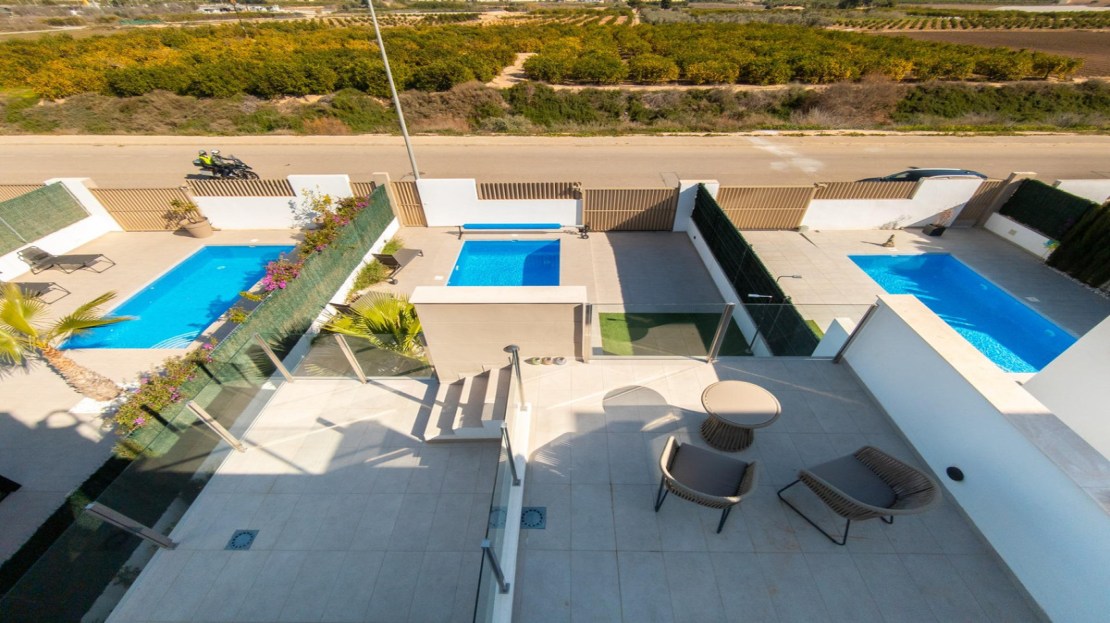 “An exceptional contemporary style detached villa built over three floors and just 2 years old is immaculately presented. You enter the garden onto a large tiled terrace surrounding the private heated pool with Roman steps, with ample space for sun loungers plus off road parking. It is a private space with a dining/seating area complete with sun awnings and patio doors leading into the lounge.