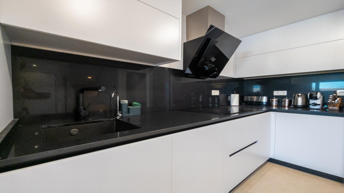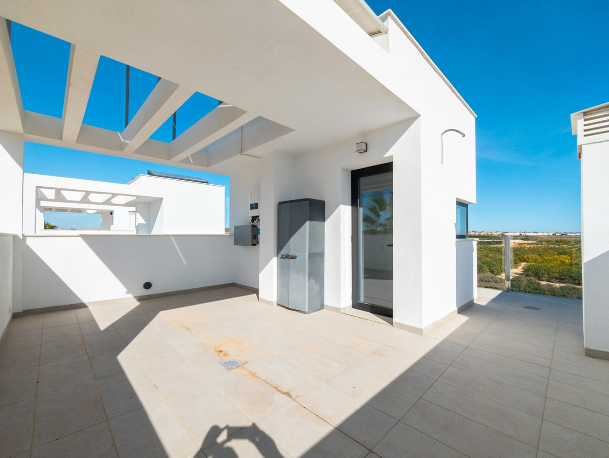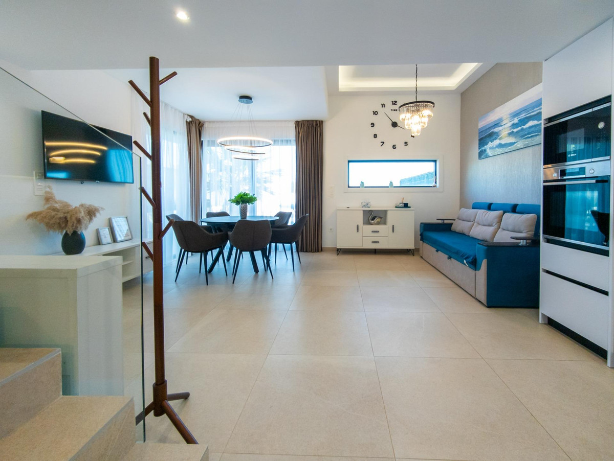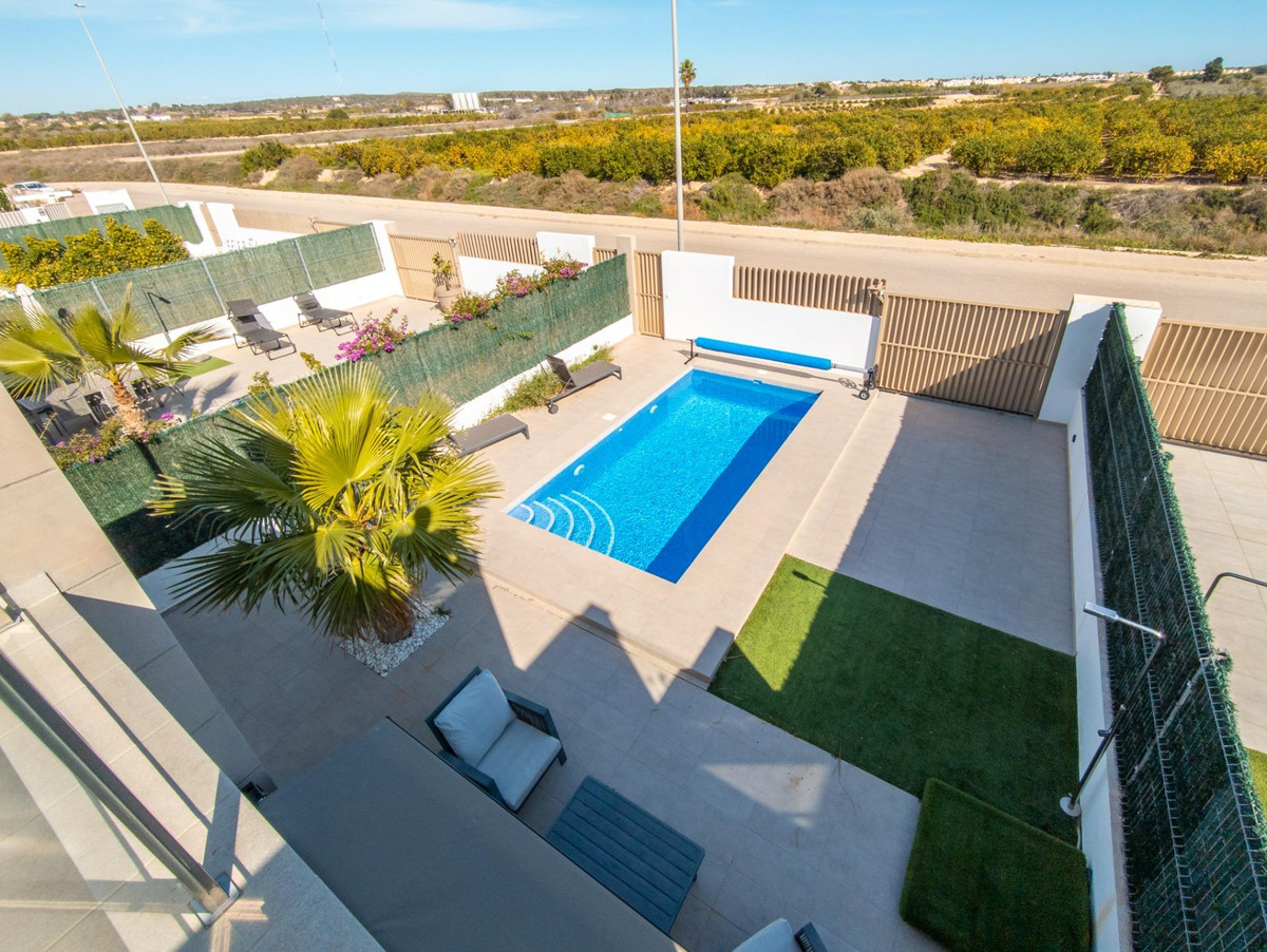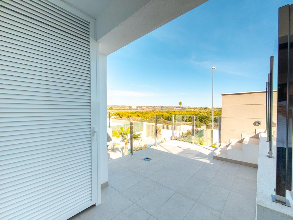 “An exceptional contemporary style detached villa built over three floors and just 2 years old is immaculately presented. You enter the garden onto a large tiled terrace surrounding the private heated pool with Roman steps, with ample space for sun loungers plus off road parking. It is a private space with a dining/seating area complete with sun awnings and patio doors leading into the lounge.