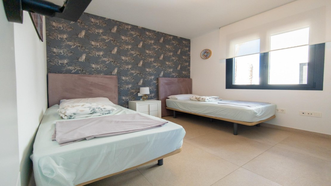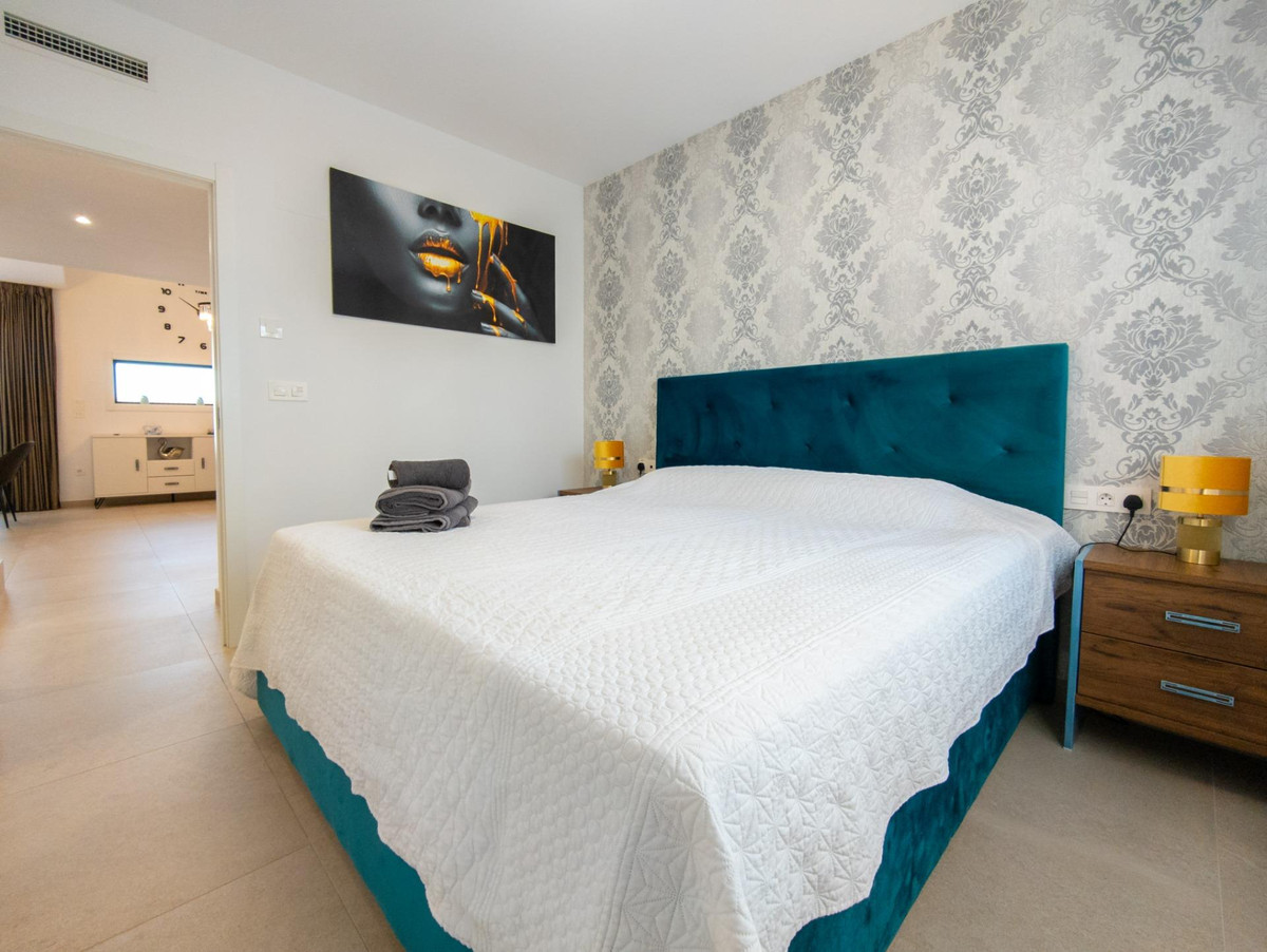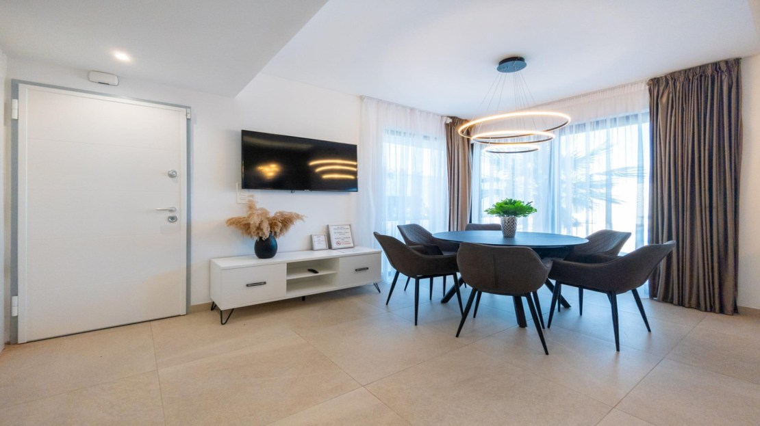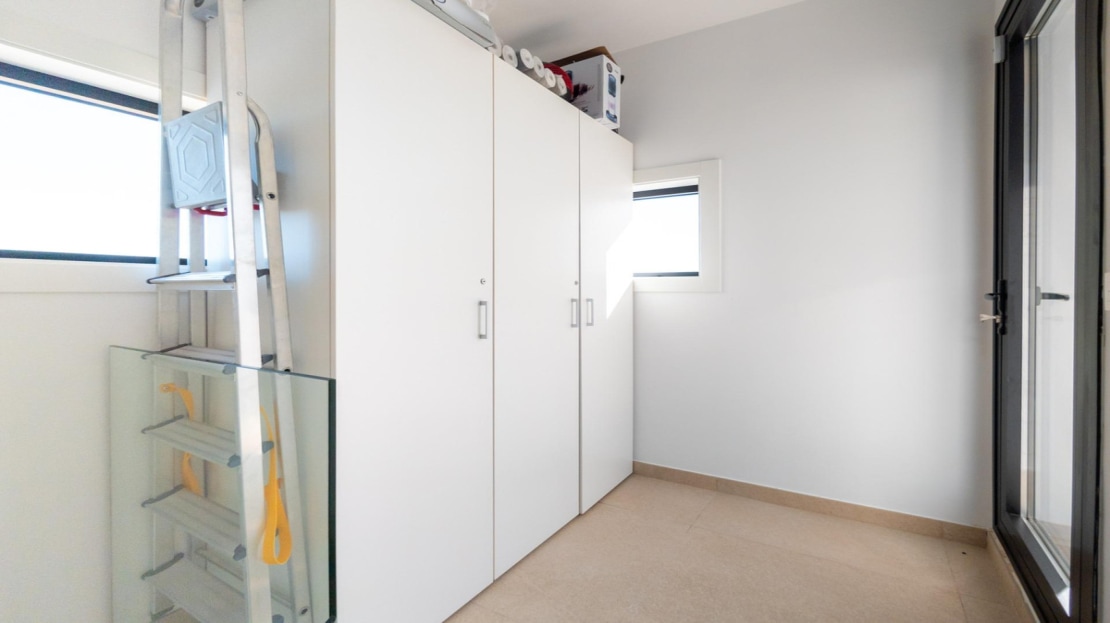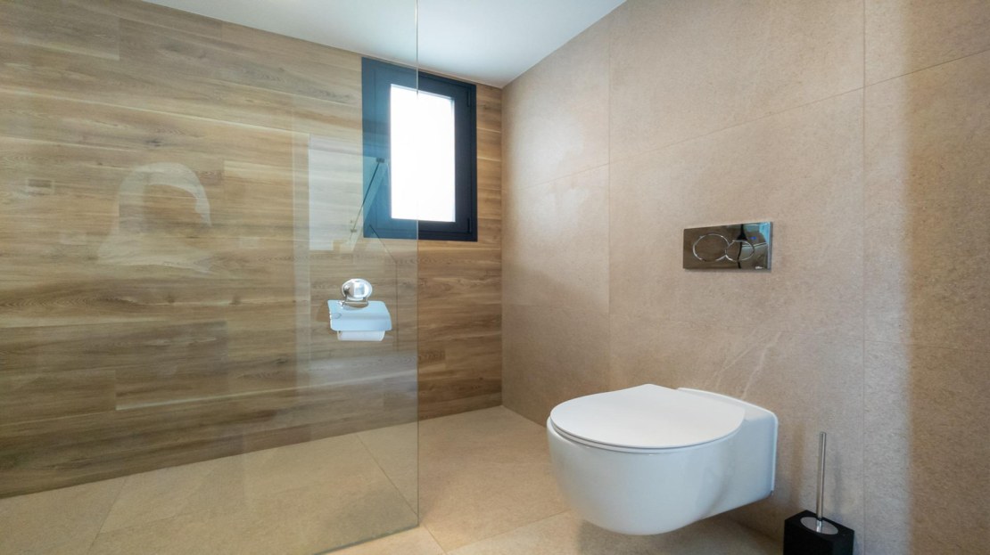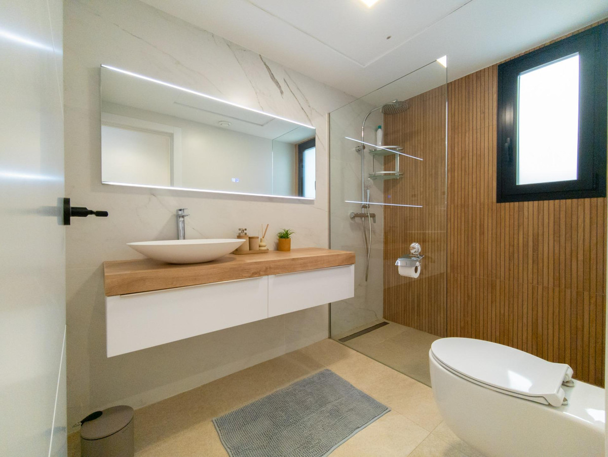 On entering the villa itself you are met with a very spacious and open plan living area with high ceilings and lots of natural sunlight. There is a lounge with patio doors out to the swimming pool, a dining area and fully fitted kitchen.Also on this floor there is a guest cloakroom, and the master bedroom with an en-suite shower and dressing room area with large fitted wardrobes.