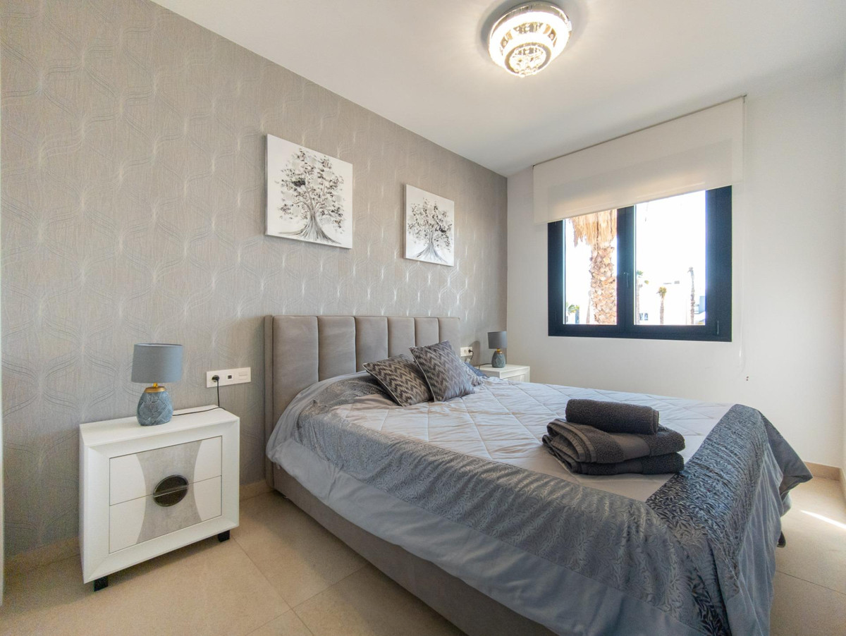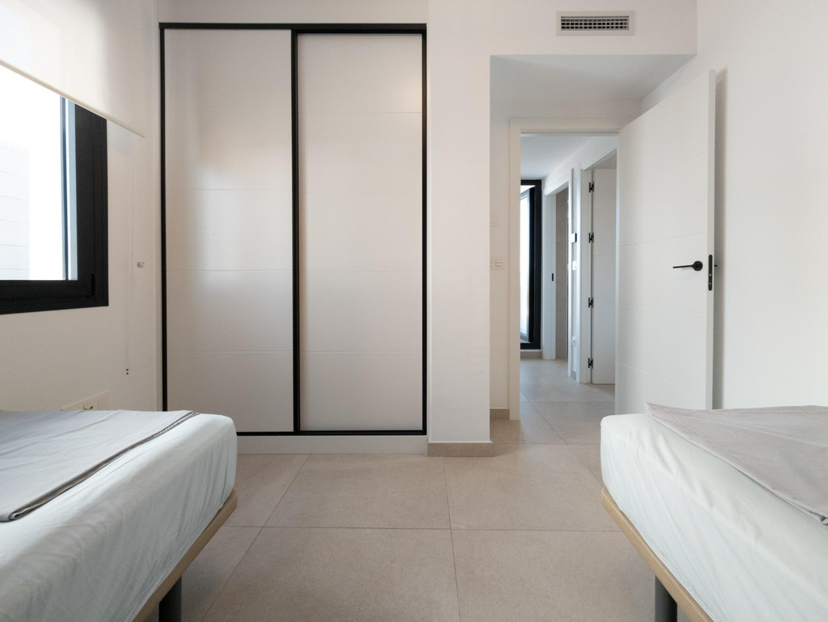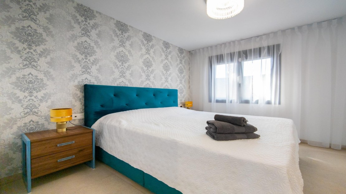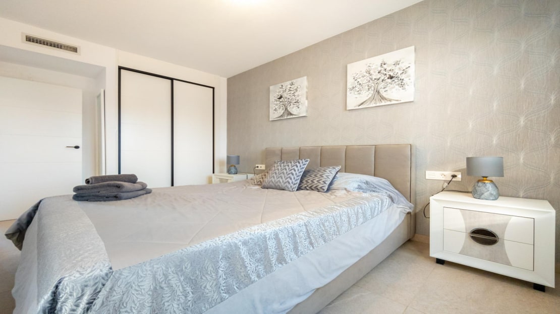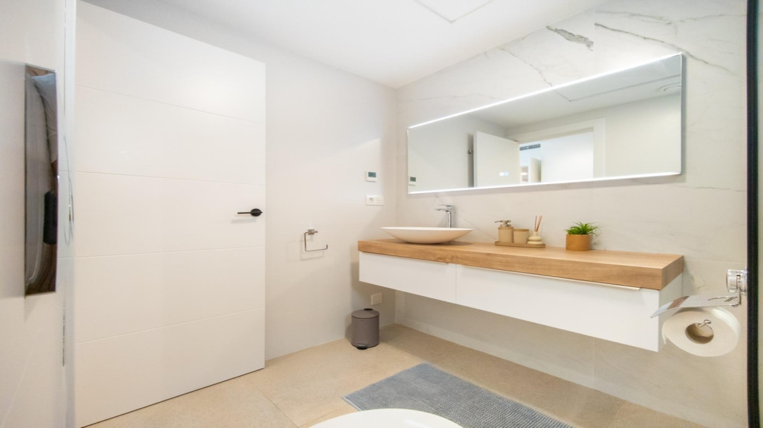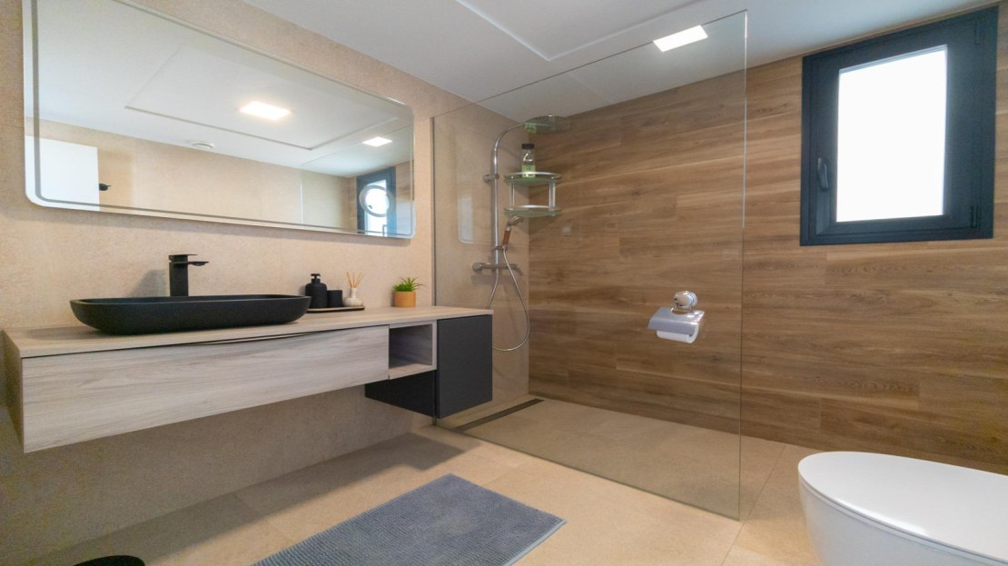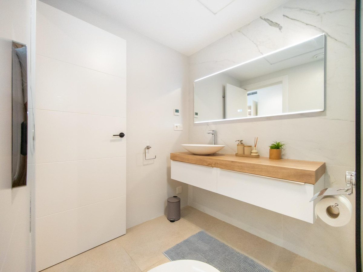 On entering the villa itself you are met with a very spacious and open plan living area with high ceilings and lots of natural sunlight. There is a lounge with patio doors out to the swimming pool, a dining area and fully fitted kitchen.Also on this floor there is a guest cloakroom, and the master bedroom with an en-suite shower and dressing room area with large fitted wardrobes.