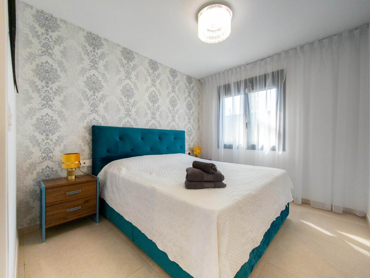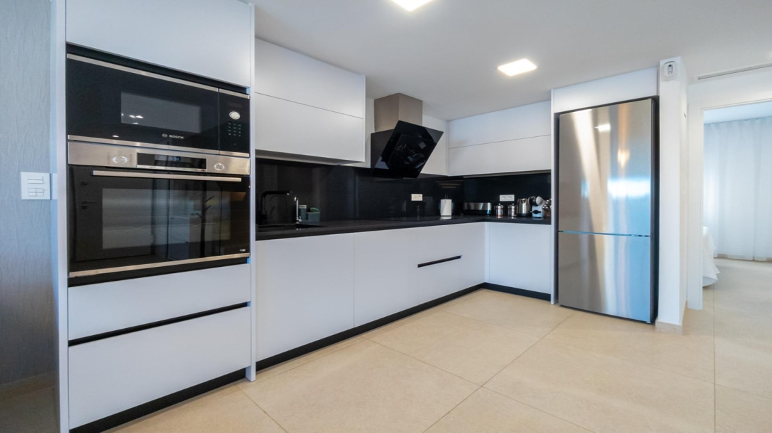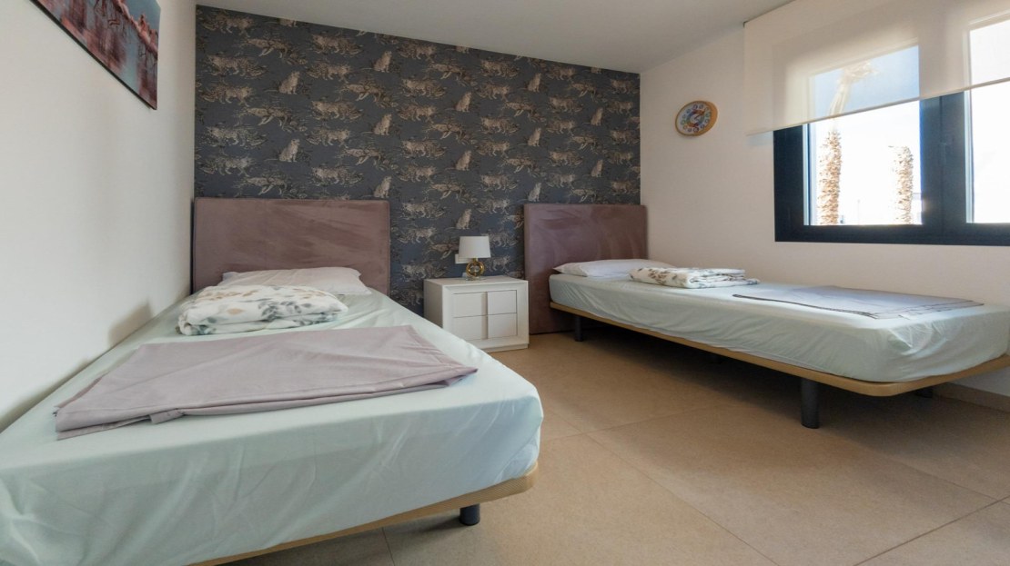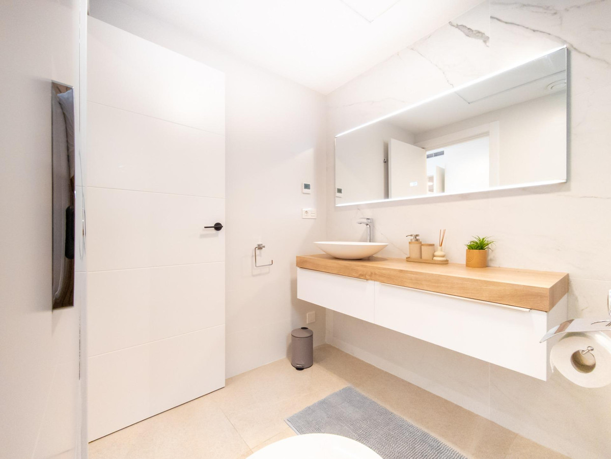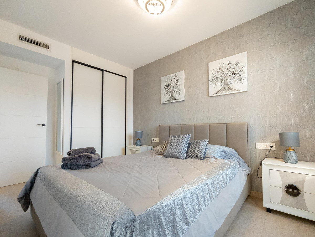 On entering the villa itself you are met with a very spacious and open plan living area with high ceilings and lots of natural sunlight. There is a lounge with patio doors out to the swimming pool, a dining area and fully fitted kitchen.Also on this floor there is a guest cloakroom, and the master bedroom with an en-suite shower and dressing room area with large fitted wardrobes.