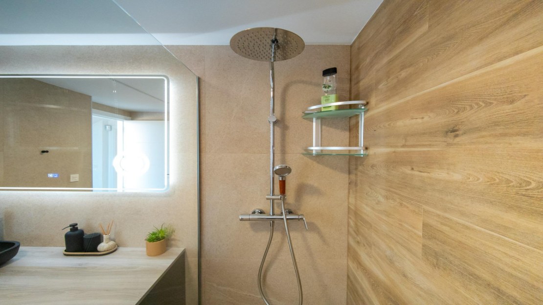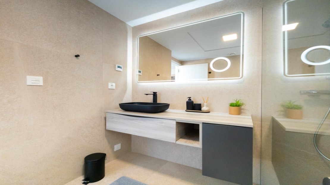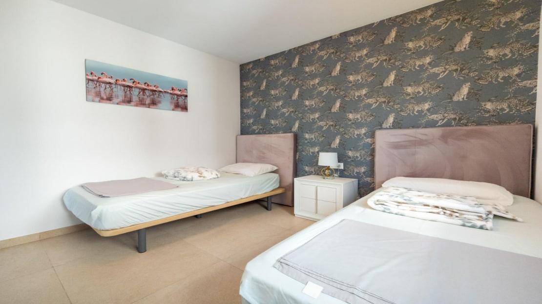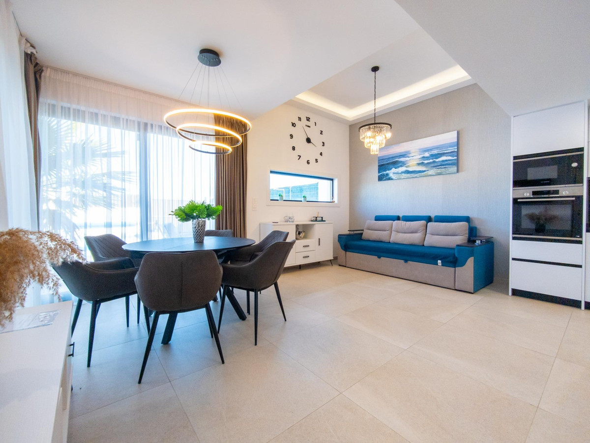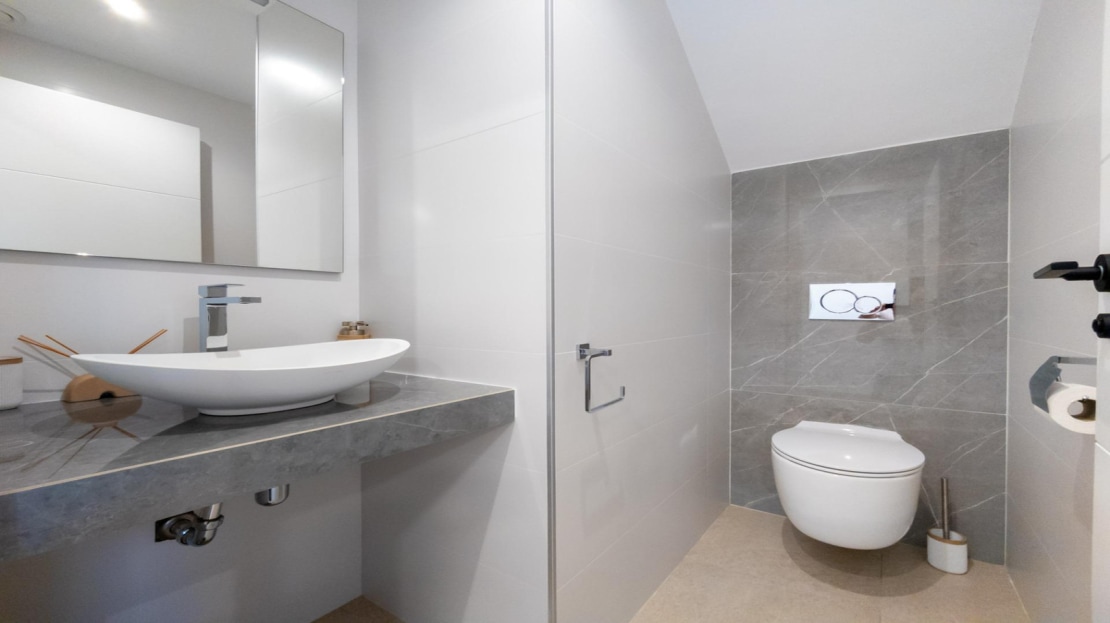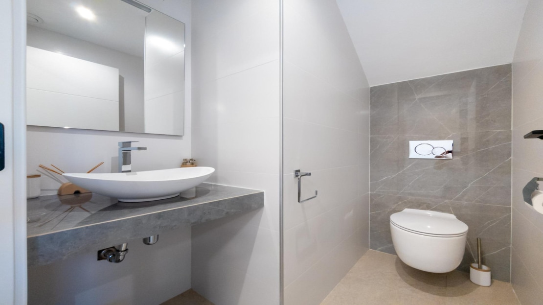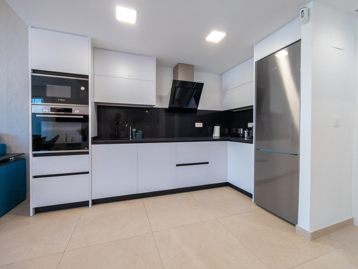 On entering the villa itself you are met with a very spacious and open plan living area with high ceilings and lots of natural sunlight. There is a lounge with patio doors out to the swimming pool, a dining area and fully fitted kitchen.Also on this floor there is a guest cloakroom, and the master bedroom with an en-suite shower and dressing room area with large fitted wardrobes.