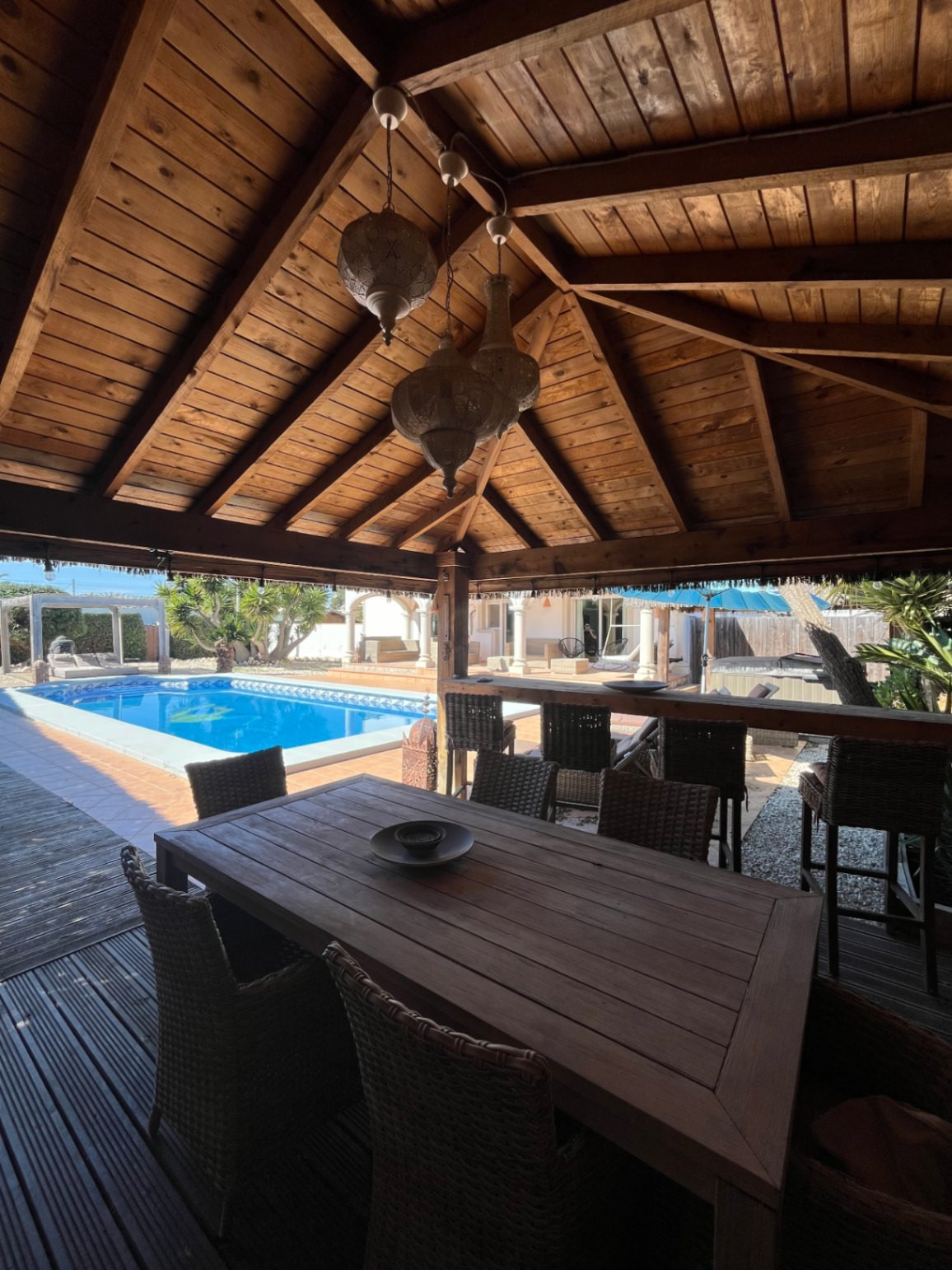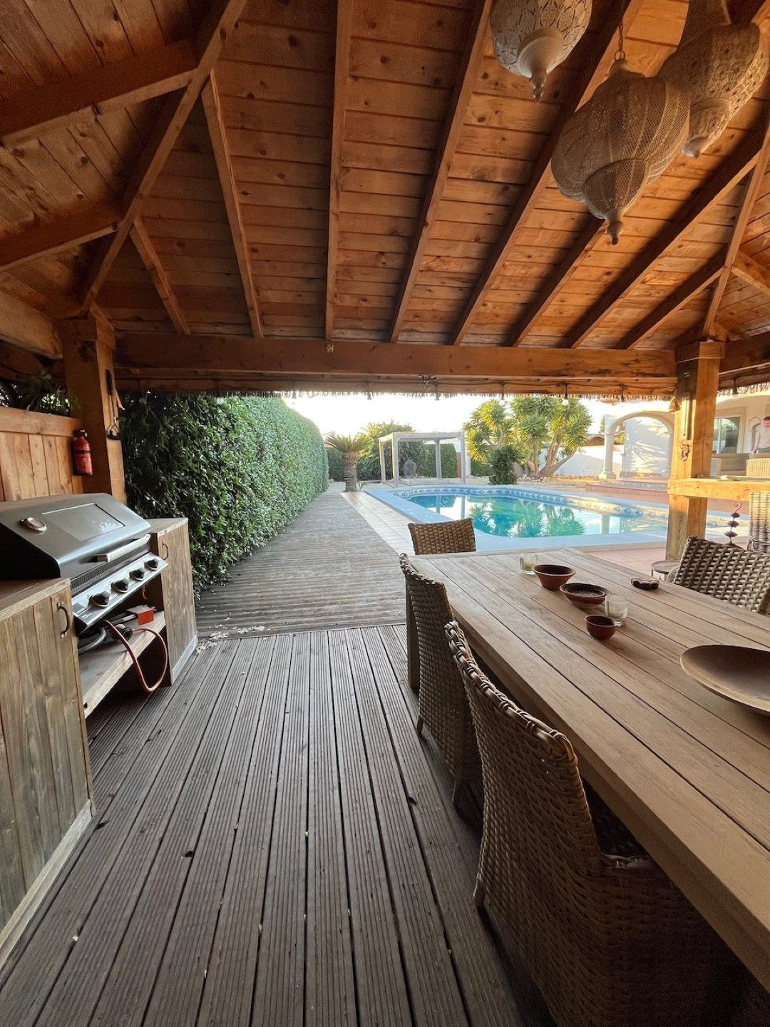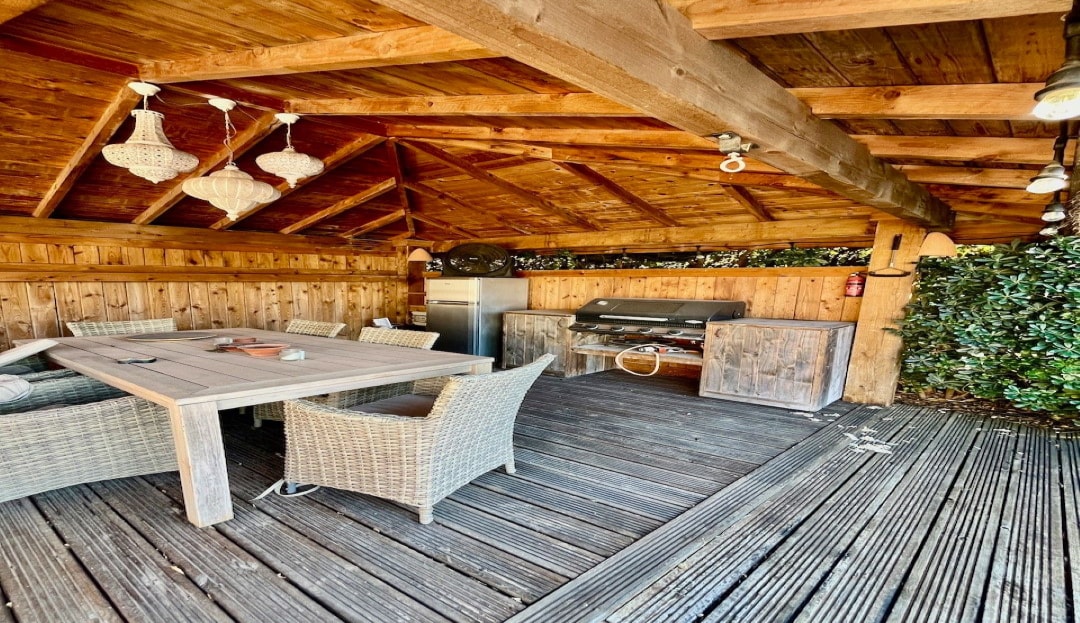 The outdoor space is perfect for entertaining, with a 4x10m south-facing pool seamlessly connected to the living room terrace. The low-maintenance garden leads to an Ibiza-style summer kitchen, shaded by a wooden pergola—ideal for alfresco dining and social gatherings.