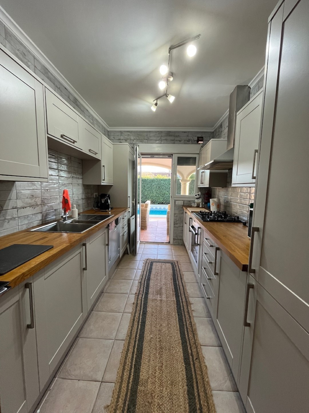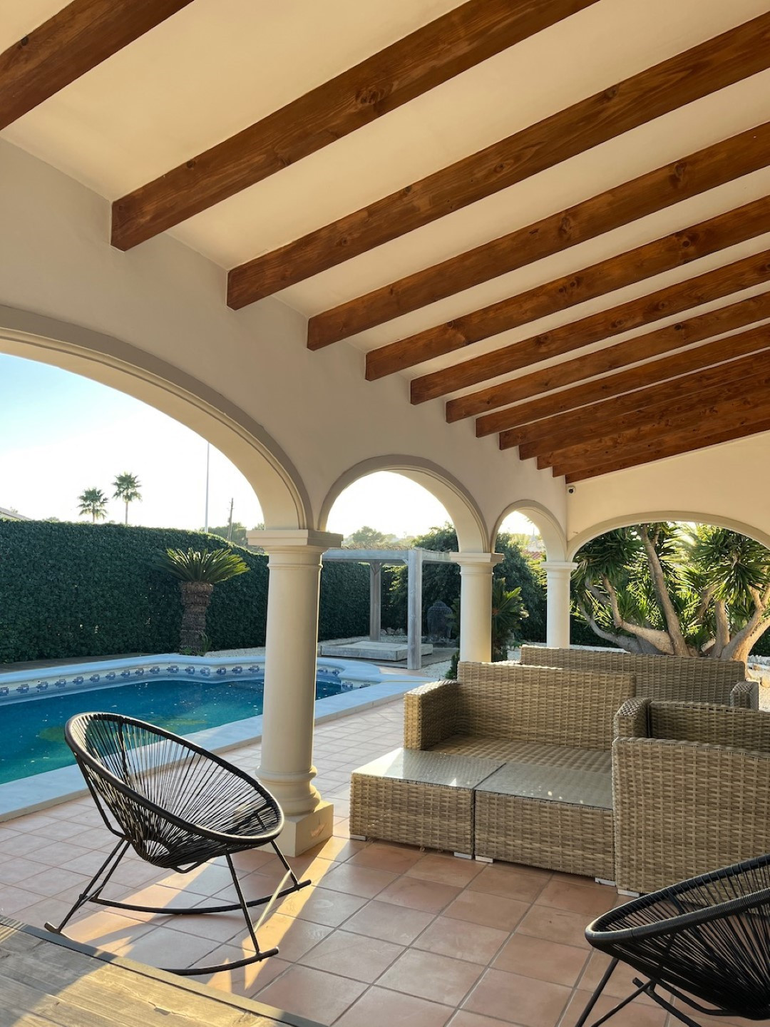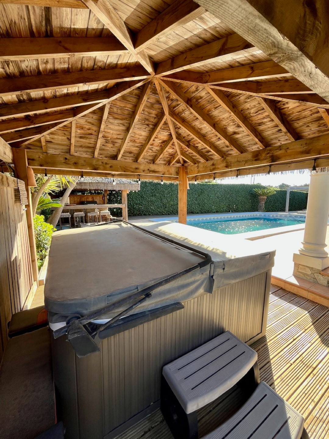 The outdoor space is perfect for entertaining, with a 4x10m south-facing pool seamlessly connected to the living room terrace. The low-maintenance garden leads to an Ibiza-style summer kitchen, shaded by a wooden pergola—ideal for alfresco dining and social gatherings.