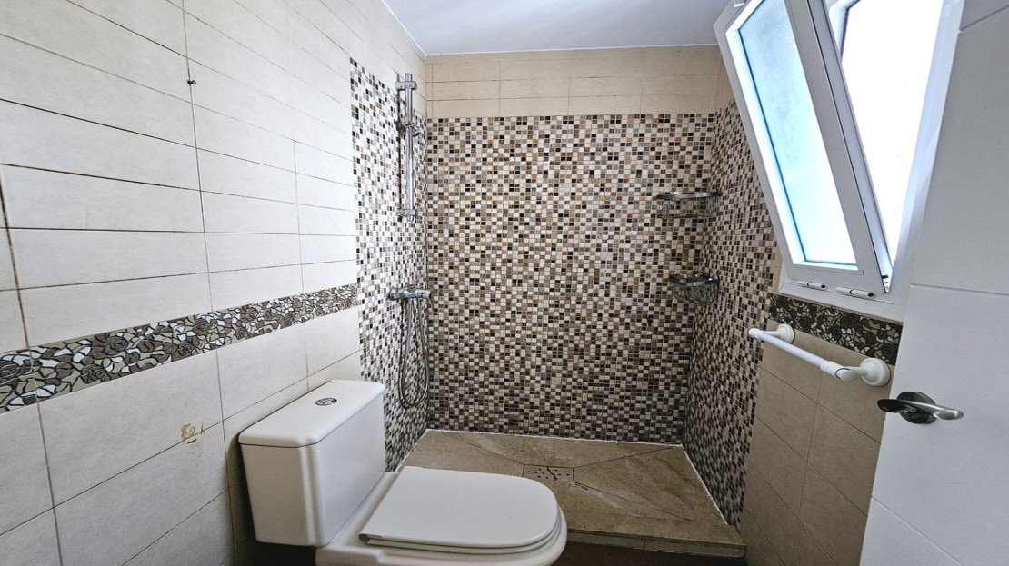 The three bedrooms are downstairs. The master bedroom is extremely large with a shower room and bathtub and has direct access to the pool area. Bedrooms two and three share a full bathroom.