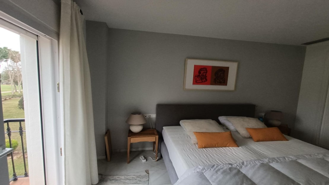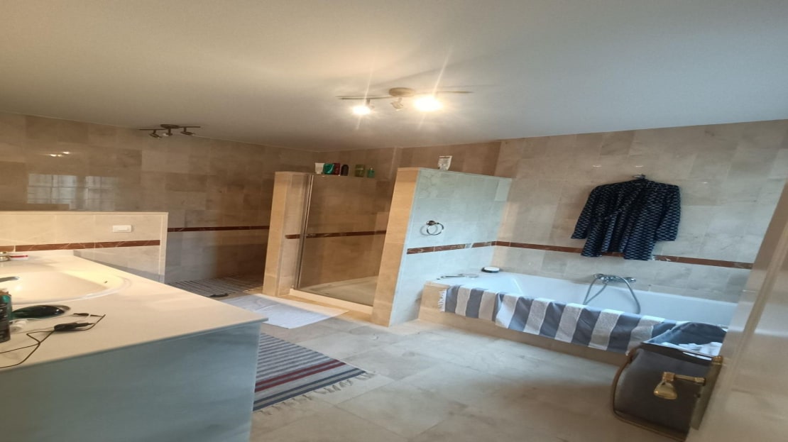 Ascend to the first floor where you’ll discover a luxurious master bedroom suite featuring an ensuite bathroom complete with a relaxing bathtub and an expansive walk-in shower. Enjoy morning coffee on your own terrace while taking in breathtaking views of the lush golf course. A second well-appointed bedroom with its own ensuite bathroom provides privacy and comfort for guests or family members.