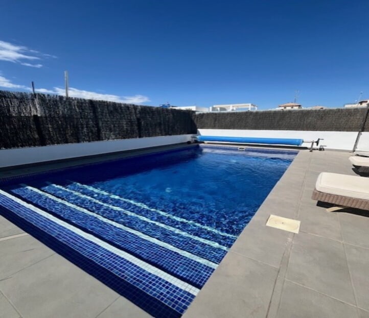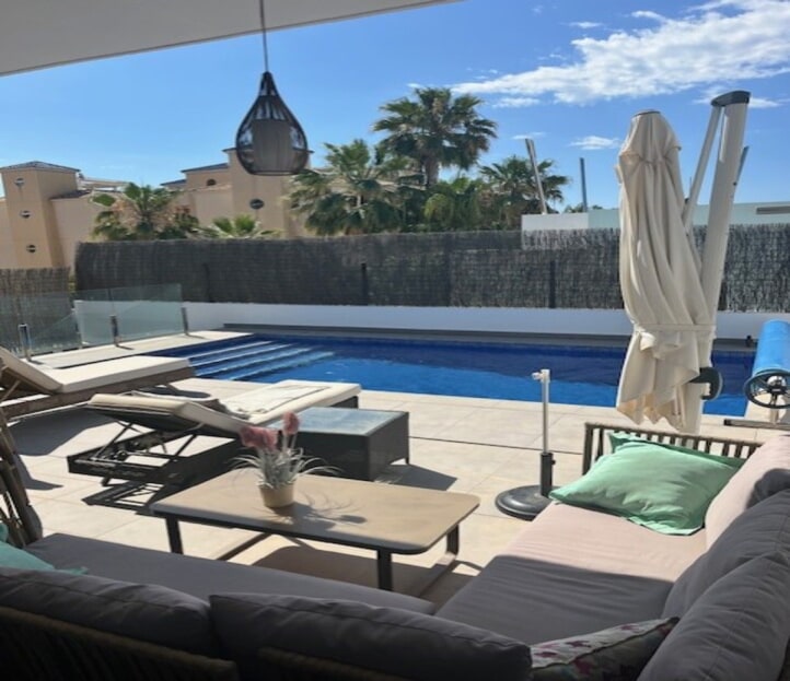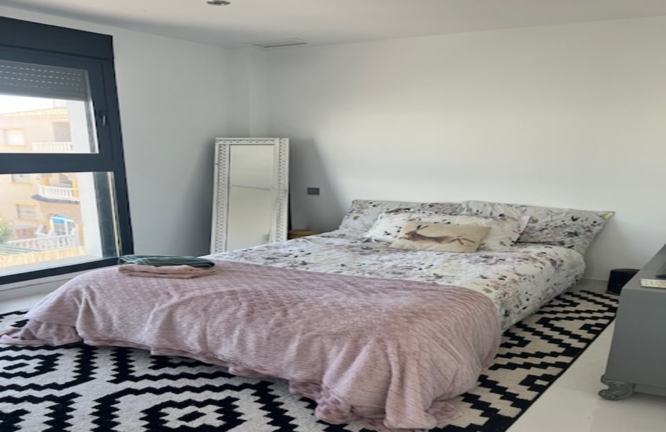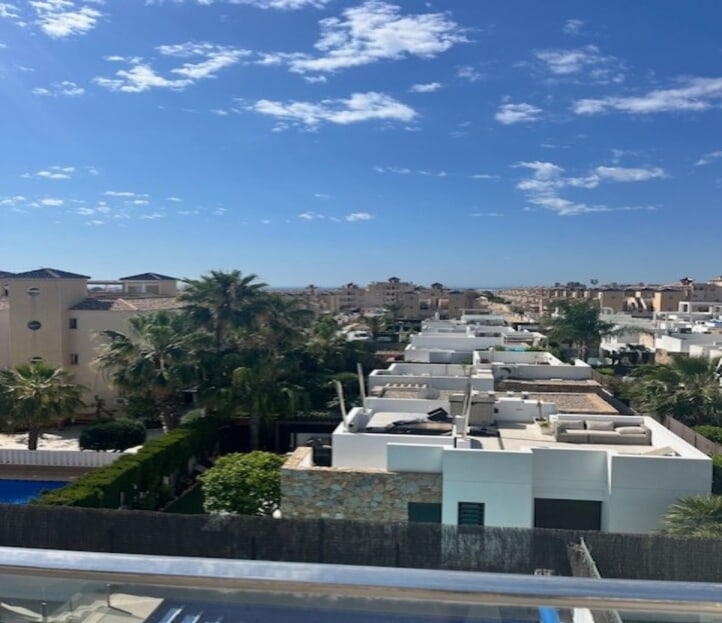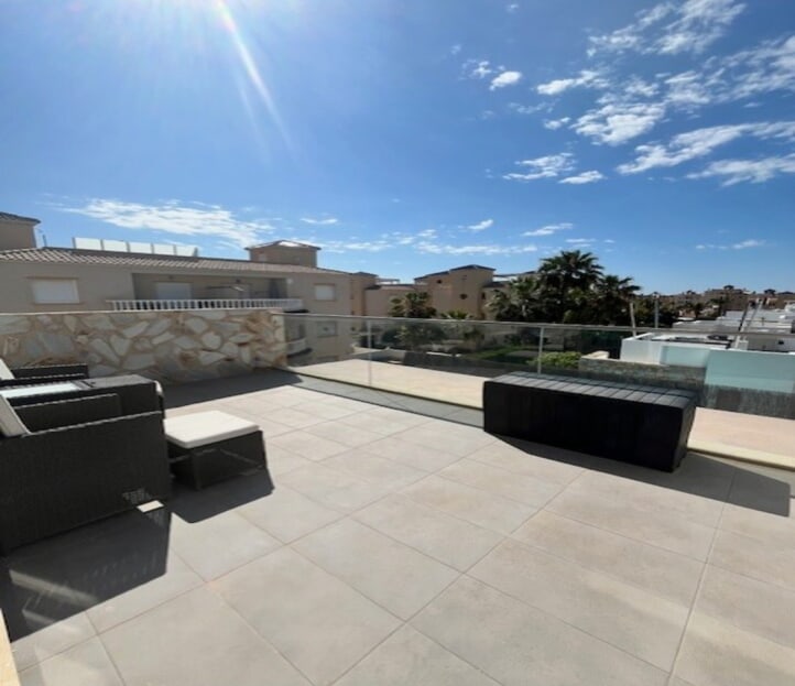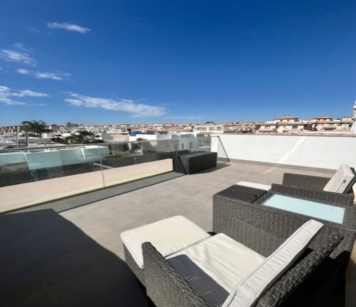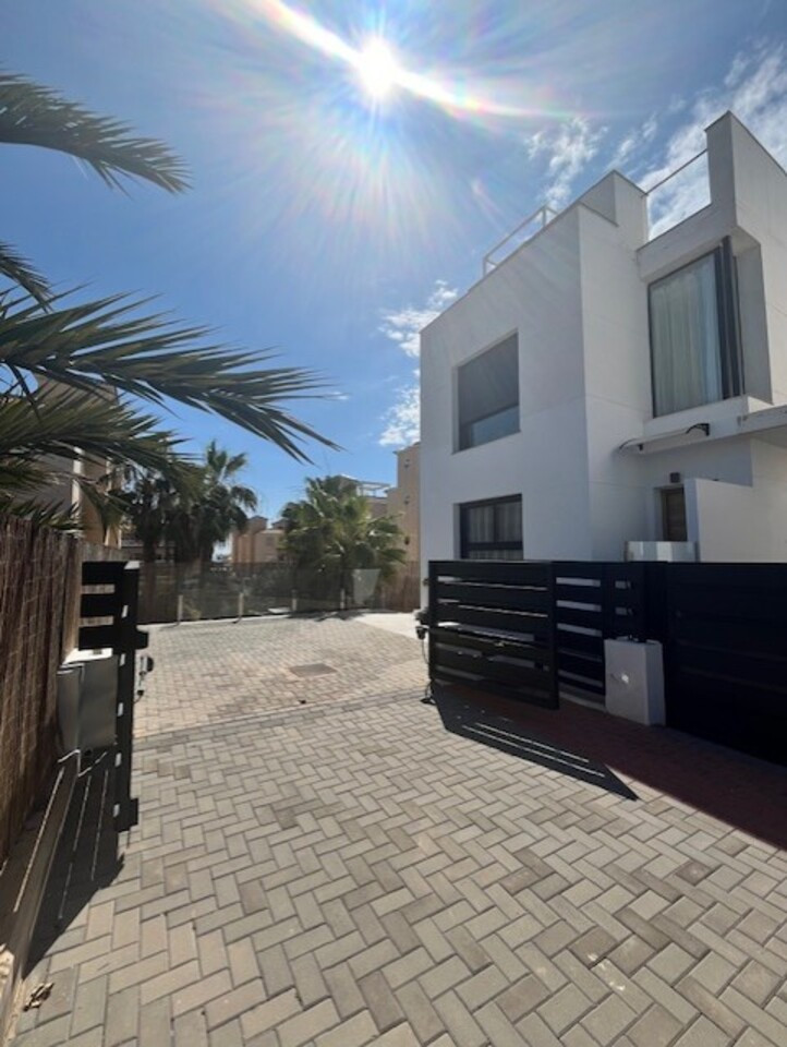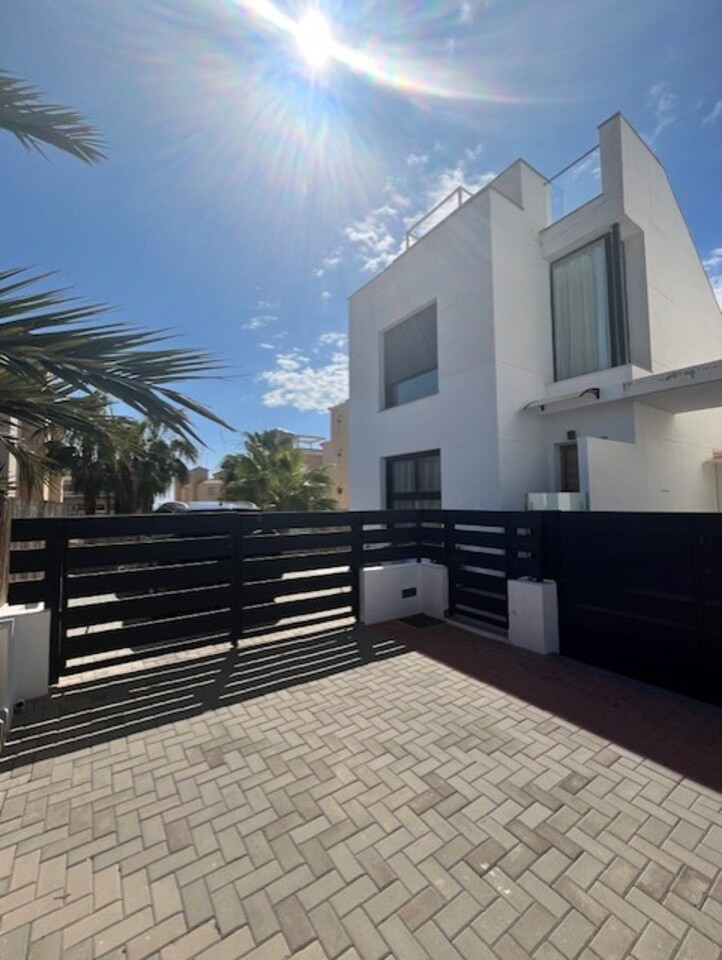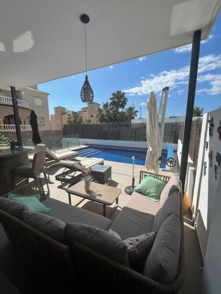 **Stunning 3-Bedroom Detached Villa in Lomas De Cabo Roig – Your Dream Home Awaits!**Welcome to this exquisite 3-bedroom, 3-bathroom detached villa nestled in the sought-after area of Lomas De Cabo Roig. This beautifully presented property is a perfect blend of modern elegance and comfortable living, situated within walking distance to all amenities. As you step inside, you'll be greeted by an inviting entrance hall that leads to a stylish cloakroom featuring underfloor heating. The ground floor boasts a spacious third bedroom complete with built-in wardrobes and its own en-suite shower room, also equipped with underfloor heating for added comfort.The heart of the home is undoubtedly the open-plan kitchen that seamlessly flows into the living and dining areas. Large sliding doors bathe the space in natural light and provide direct access to your sunny south facing patio area. Here, you’ll find your very own private heated pool and jacuzzi, perfect for unwinding after a long day or entertaining friends during those warm summer nights.Venture upstairs to discover two additional bedrooms. The second bedroom features ample built-in wardrobes, while the master suite offers an en-suite bathroom and dressing area that exudes luxury. Sliding doors lead you out onto a generous balcony where you can savor morning coffee or sunset views. A staircase from here takes you up to an expansive solarium boasting breathtaking far-reaching views—an idyllic spot for sunbathing or stargazing.Set on a well-maintained plot adorned with various seating areas and flourishing fruit trees, this villa provides an oasis of tranquility amidst vibrant surroundings. Security is paramount with communal electric gates as well as your own private electric gate leading to parking for one vehicle.This remarkable property comes part-furnished and includes essential white goods in the kitchen along with modern electric blinds throughout—ready for you to move in without delay!Don’t miss out on this incredible opportunity! Schedule your viewing today and experience firsthand what makes this villa so special. Whether you're seeking a permanent residence or a holiday retreat, this stunning home has it all!Your dream home awaits at Lomas De Cabo Roig!