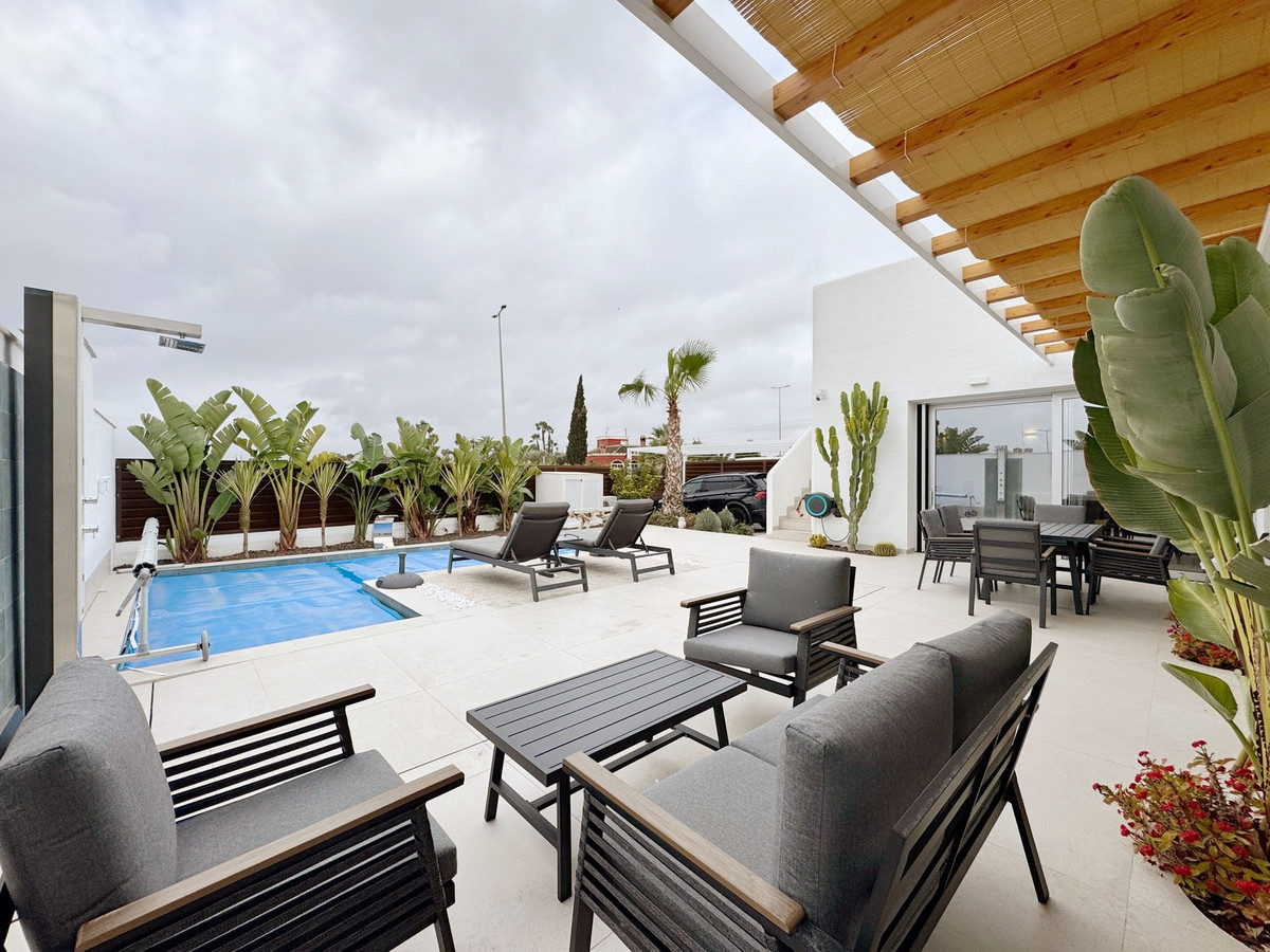 This modern villa is located in the peaceful La Herrada residential area in Los Montesinos. The property offers a built area of 114 m² on a 257 m² plot, all distributed on a single floor with an L-shaped design, optimizing space and ensuring a comfortable and functional layout. It features three bedrooms and two bathrooms, providing spacious and bright rooms for comfortable living.
