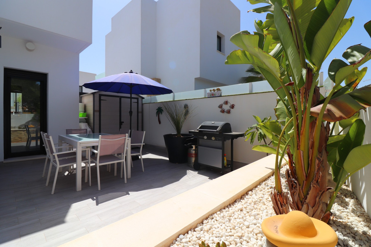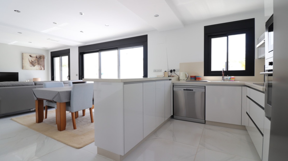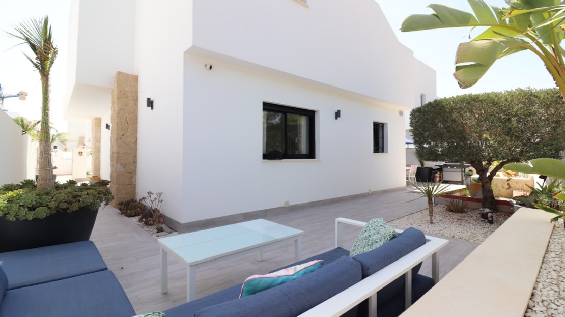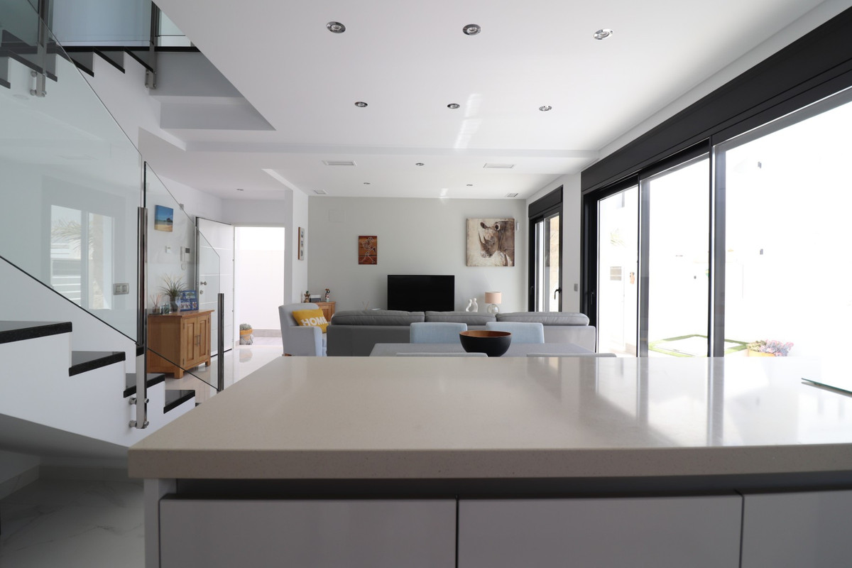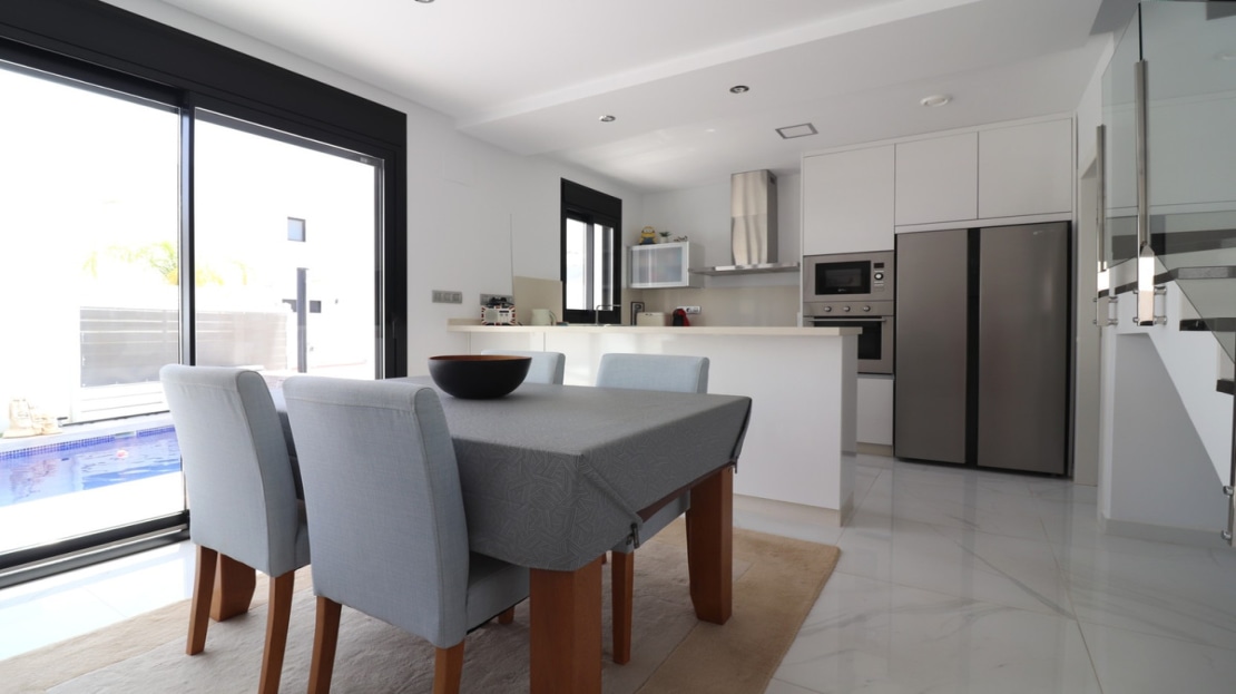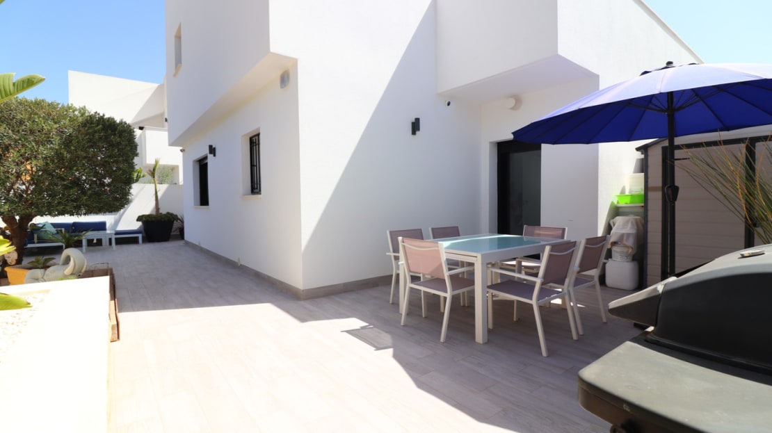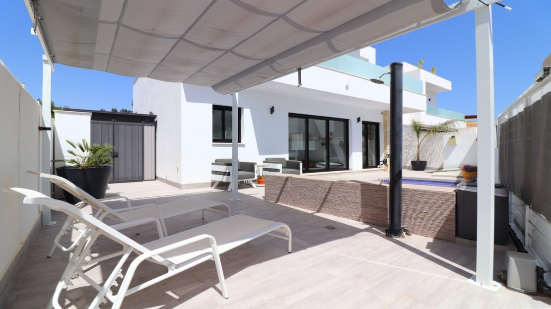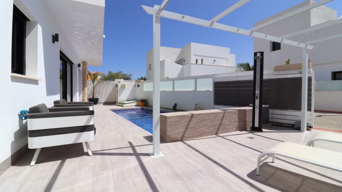 This South Facing, Stunning, 2019 Built, Three Bedroom Detached Villa in La Herrada is located in Los Montesinos. This beautifully designed villa features three spacious bedrooms, two modern bathrooms, and an additional cloakroom. The open plan, fully fitted kitchen is complemented by a separate utility room, offering convenience and ample storage. Air conditioning is installed throughout the property, ensuring comfort in every room. The exterior of the villa boasts a tiled, graveled, and landscaped low maintenance garden, perfect for enjoying the sunny climate. Off road parking is available, and the 5 x 3 meter private swimming pool is ideal for cooling off during the hot summer months. Fitted wardrobes provide plenty of storage space in the bedrooms. This property is ideally located just a one-minute walk from a local bar, restaurant, and supermarket situated within the urbanization itself. A leisurely 15-minute walk will take you into the charming town centre of Los Montesinos. The villa's private rooftop solarium offers stunning lake views, adding to the appeal of this home. The master bedroom includes an en suite bathroom, and the property also features a garden shed for additional storage. The bathrooms benefit from underfloor heating, adding a touch of luxury. The villa is just a 15-minute drive from the beautiful beaches of Guardamar del Segura or Torrevieja, making it an ideal location on the Costa Blanca South.