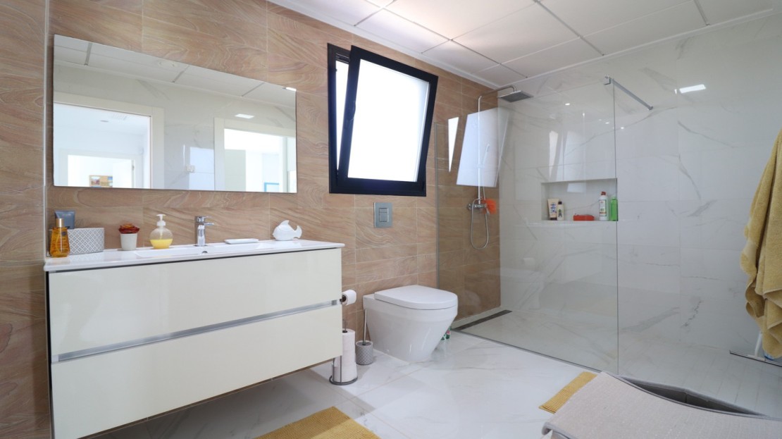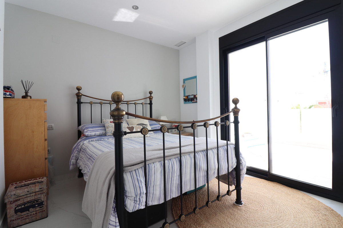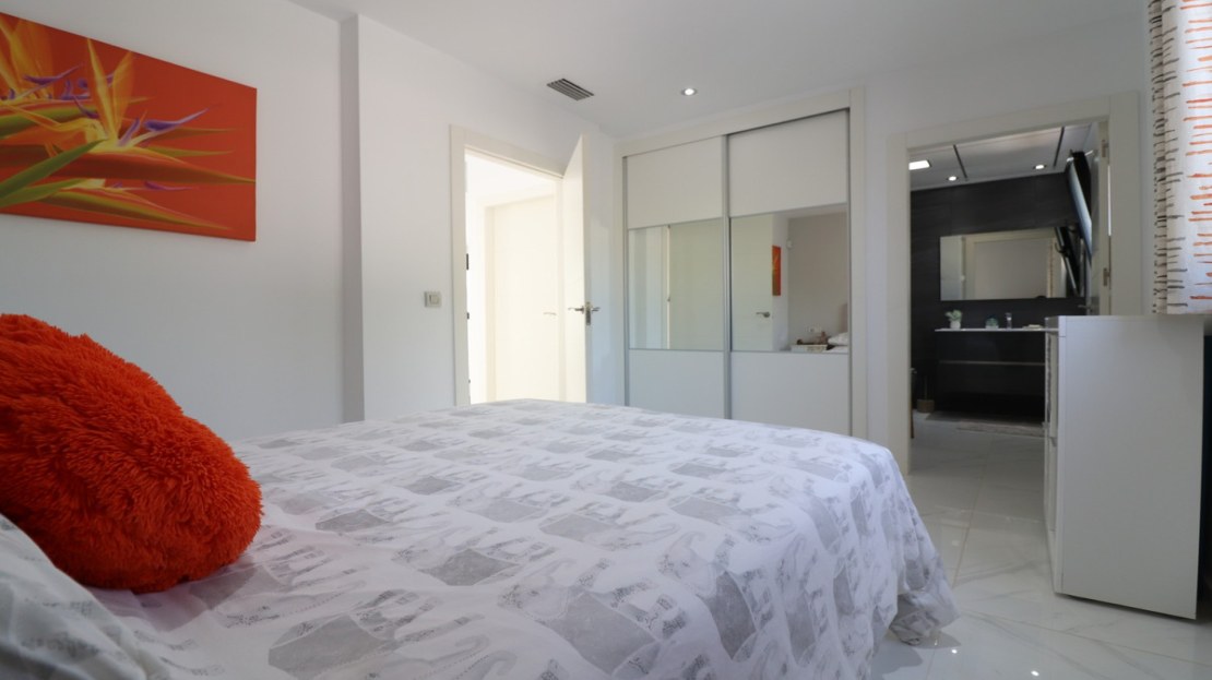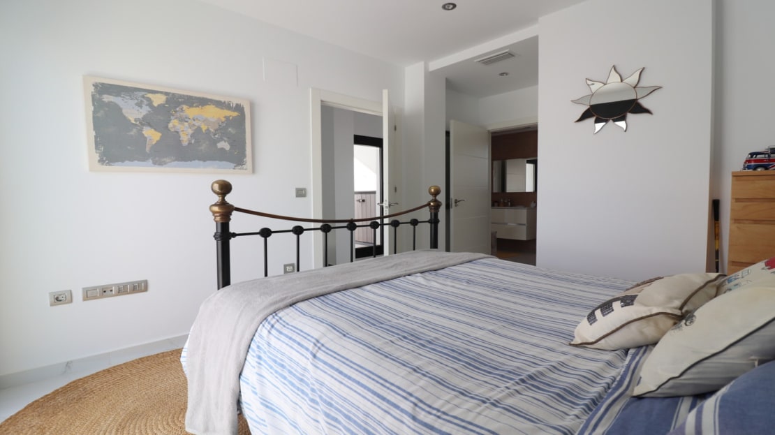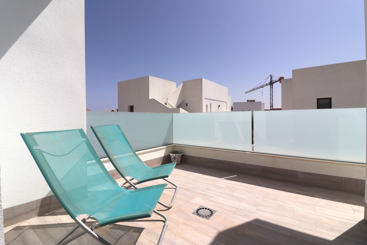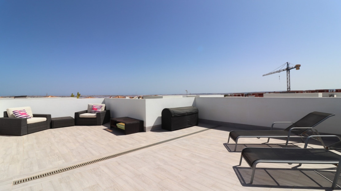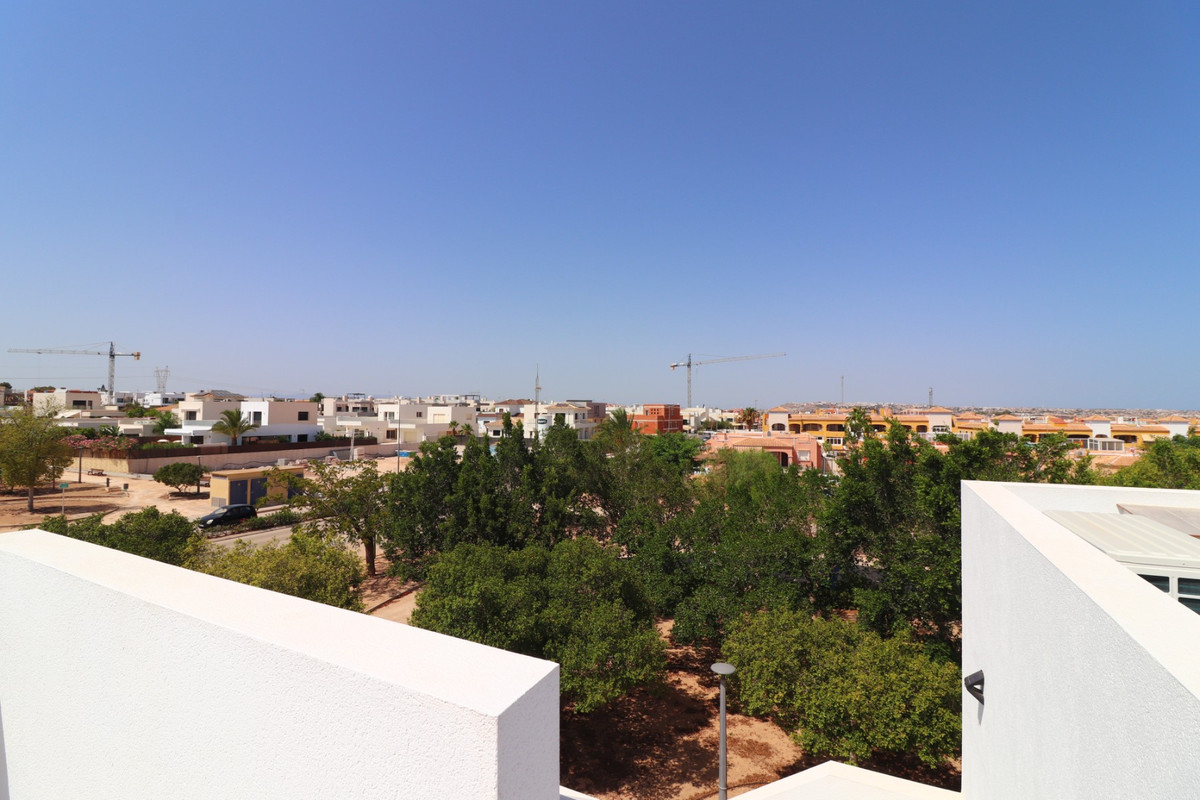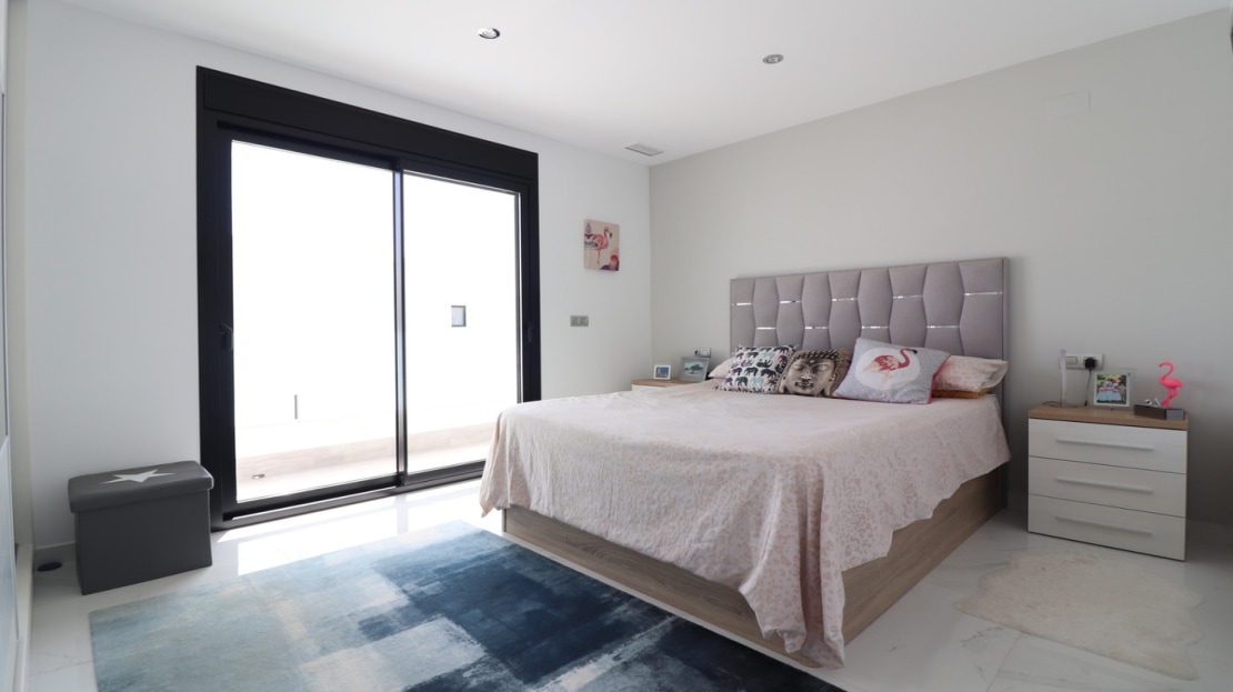This South Facing, Stunning, 2019 Built, Three Bedroom Detached Villa in La Herrada is located in Los Montesinos. This beautifully designed villa features three spacious bedrooms, two modern bathrooms, and an additional cloakroom. The open plan, fully fitted kitchen is complemented by a separate utility room, offering convenience and ample storage. Air conditioning is installed throughout the property, ensuring comfort in every room. The exterior of the villa boasts a tiled, graveled, and landscaped low maintenance garden, perfect for enjoying the sunny climate. Off road parking is available, and the 5 x 3 meter private swimming pool is ideal for cooling off during the hot summer months. Fitted wardrobes provide plenty of storage space in the bedrooms. This property is ideally located just a one-minute walk from a local bar, restaurant, and supermarket situated within the urbanization itself. A leisurely 15-minute walk will take you into the charming town centre of Los Montesinos. The villa's private rooftop solarium offers stunning lake views, adding to the appeal of this home. The master bedroom includes an en suite bathroom, and the property also features a garden shed for additional storage. The bathrooms benefit from underfloor heating, adding a touch of luxury. The villa is just a 15-minute drive from the beautiful beaches of Guardamar del Segura or Torrevieja, making it an ideal location on the Costa Blanca South.