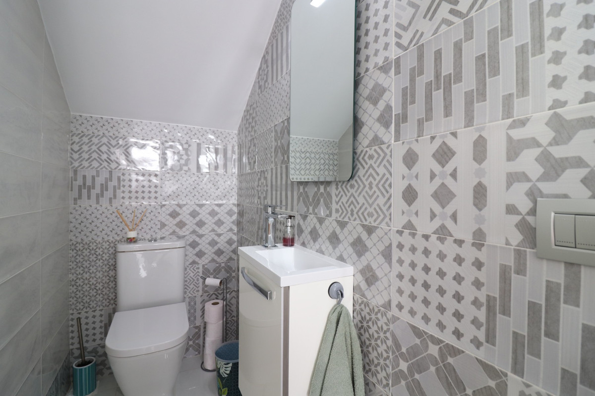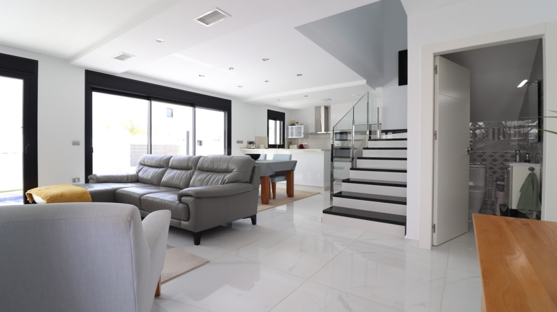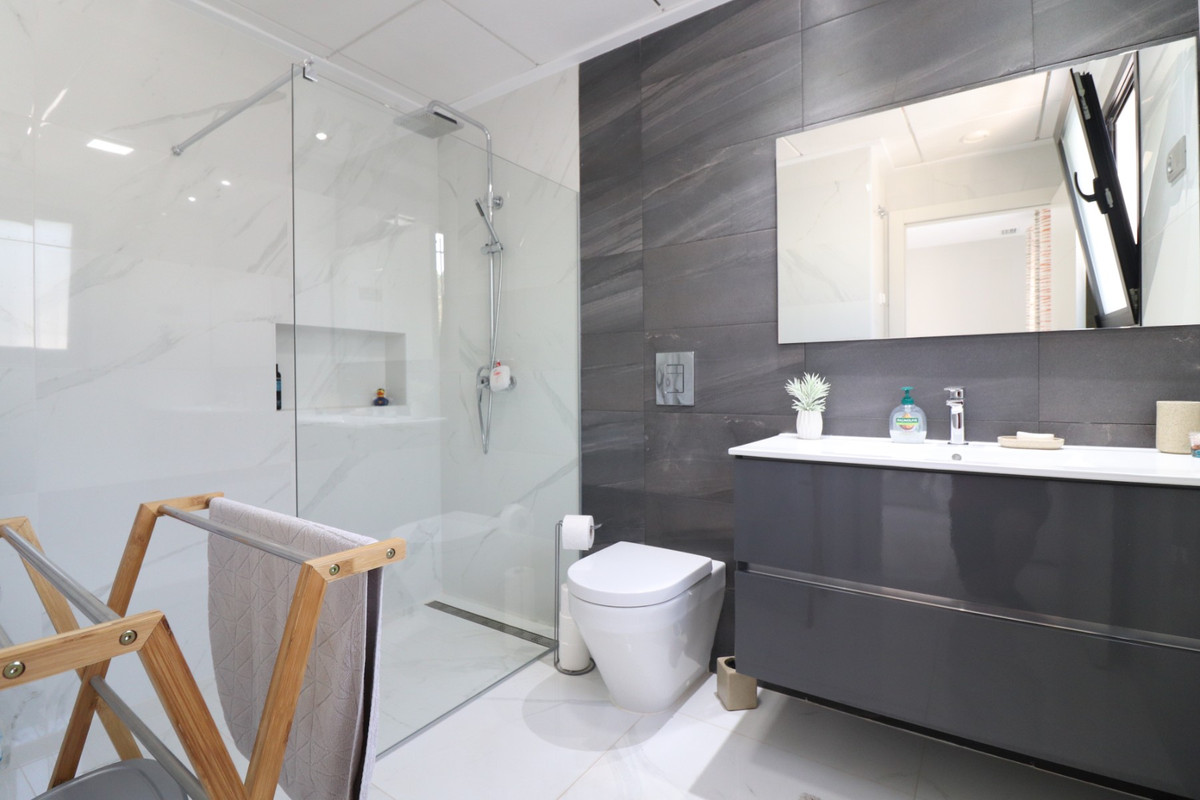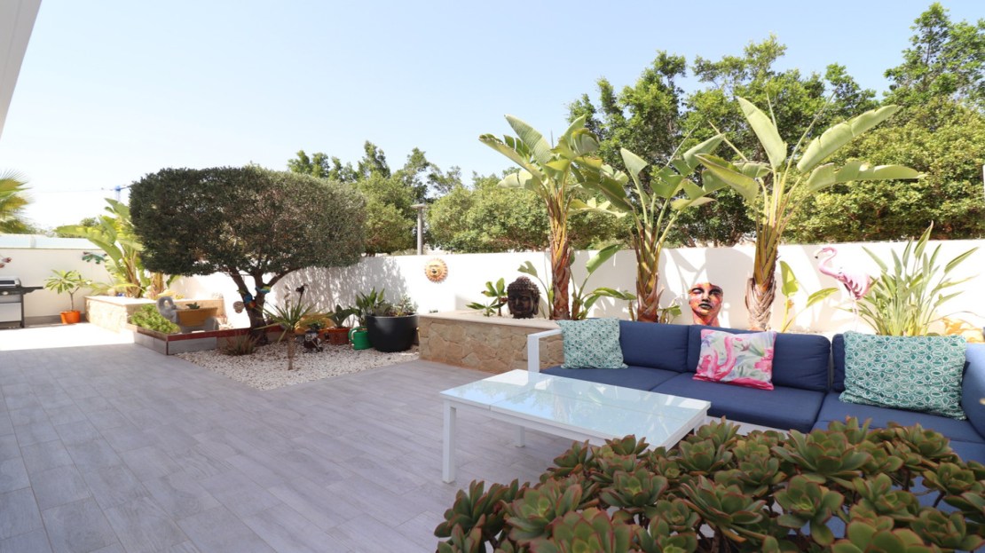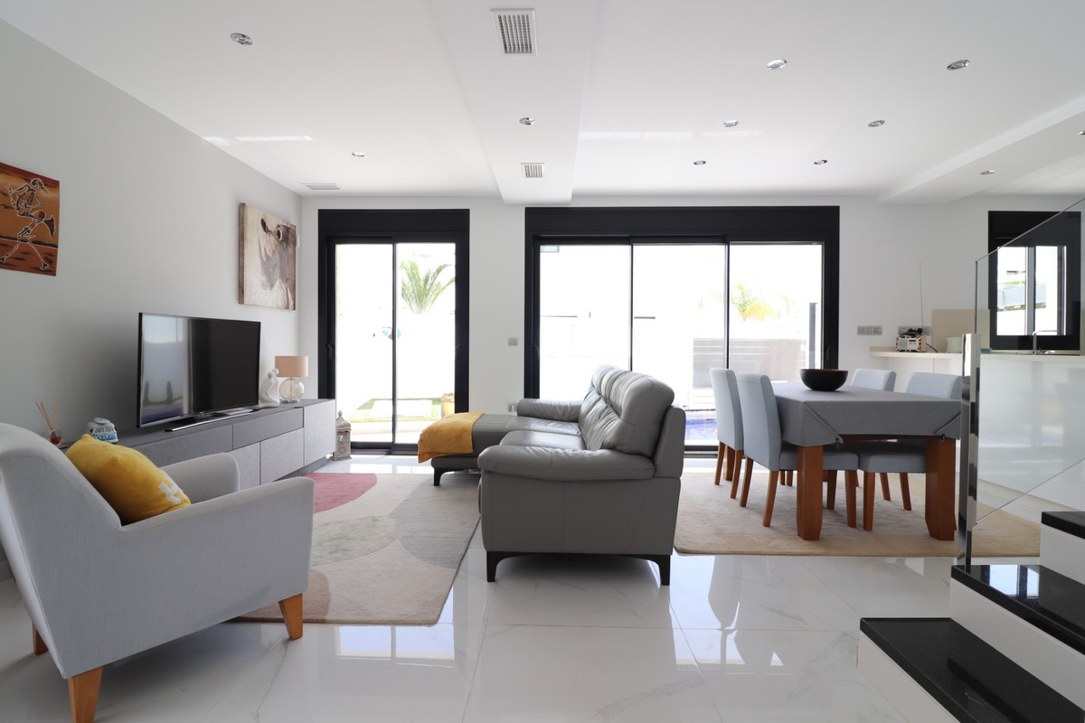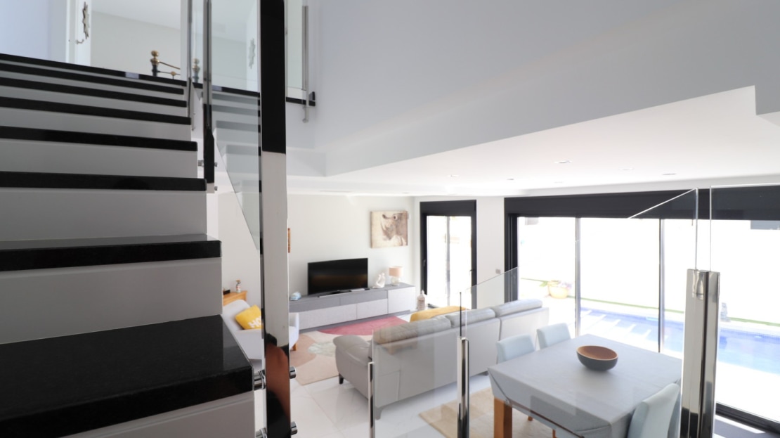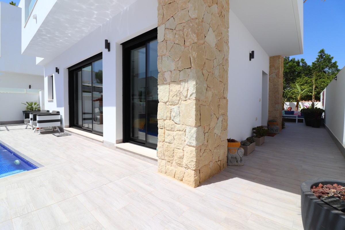This South Facing, Stunning, 2019 Built, Three Bedroom Detached Villa in La Herrada is located in Los Montesinos. This beautifully designed villa features three spacious bedrooms, two modern bathrooms, and an additional cloakroom. The open plan, fully fitted kitchen is complemented by a separate utility room, offering convenience and ample storage. Air conditioning is installed throughout the property, ensuring comfort in every room. The exterior of the villa boasts a tiled, graveled, and landscaped low maintenance garden, perfect for enjoying the sunny climate. Off road parking is available, and the 5 x 3 meter private swimming pool is ideal for cooling off during the hot summer months. Fitted wardrobes provide plenty of storage space in the bedrooms. This property is ideally located just a one-minute walk from a local bar, restaurant, and supermarket situated within the urbanization itself. A leisurely 15-minute walk will take you into the charming town centre of Los Montesinos. The villa's private rooftop solarium offers stunning lake views, adding to the appeal of this home. The master bedroom includes an en suite bathroom, and the property also features a garden shed for additional storage. The bathrooms benefit from underfloor heating, adding a touch of luxury. The villa is just a 15-minute drive from the beautiful beaches of Guardamar del Segura or Torrevieja, making it an ideal location on the Costa Blanca South.