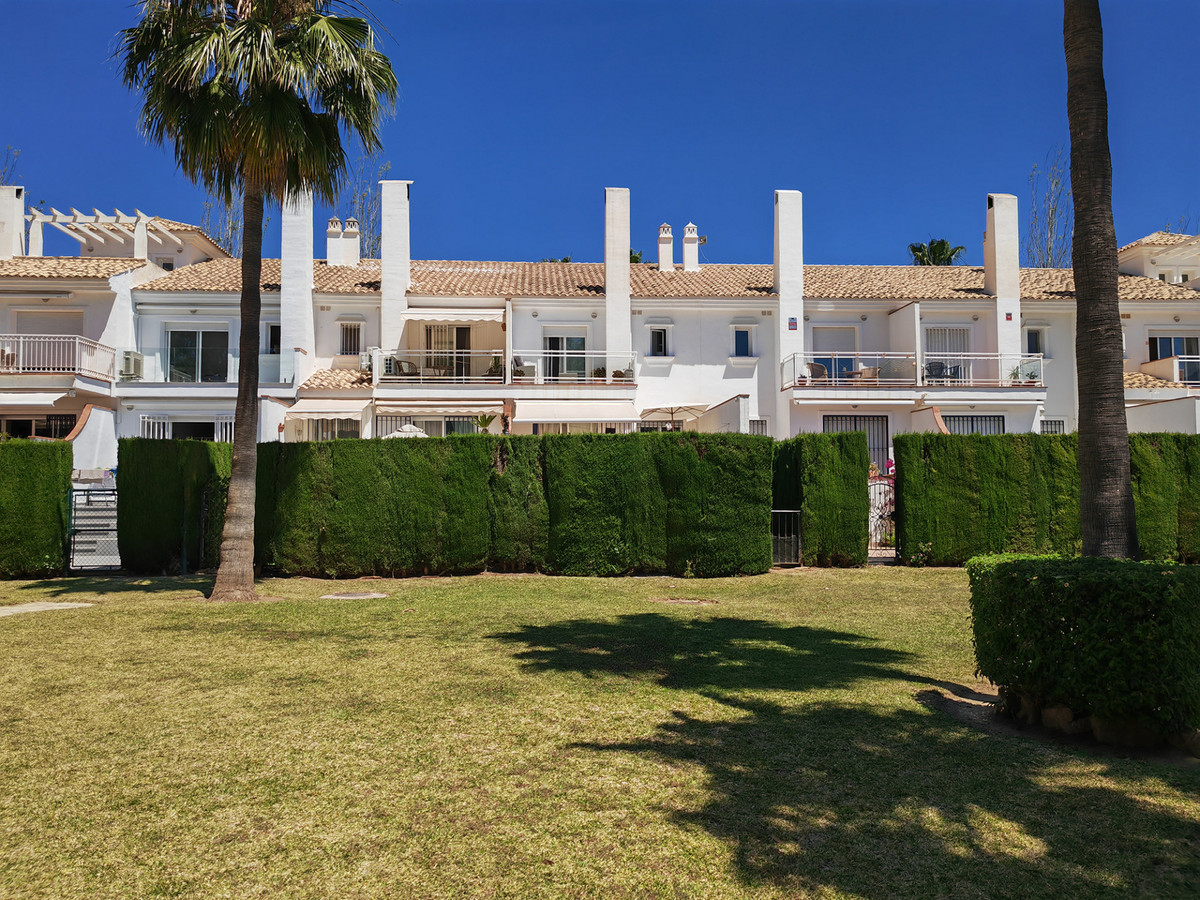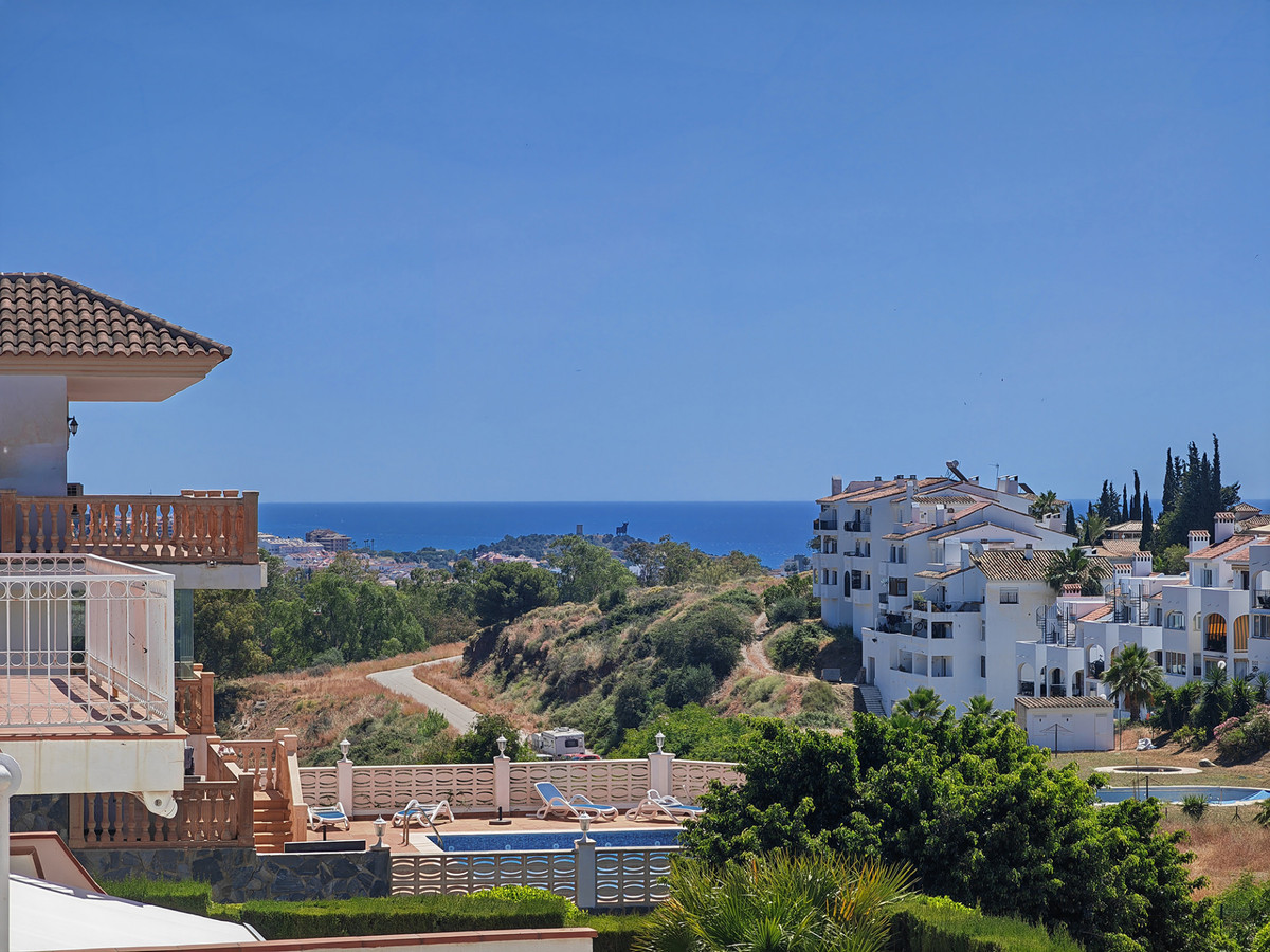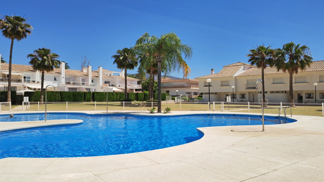 Town House for sale in , Mijas with 3 bedrooms, 2 bathrooms, 1 toilet and with orientation south, with communal swimming pool, private garage (2 parking spaces) and communal garden. Regarding property dimensions, it has 250 m² built and 60 m² plot. Has the following facilities amenities near, air conditioning, central heating, partly furnished, fully fitted kitchen, utility room, fireplace, basement, guest room, barbeque, guest toilet, kitchen equipped, sea view, mountain view, laundry room, internet – wi-fi, covered terrace, fitted wardrobes, gated community, garden view, uncovered terrace, glass doors, balcony, good condition, close to town, close to schools, surveillance cameras and pets allowed.