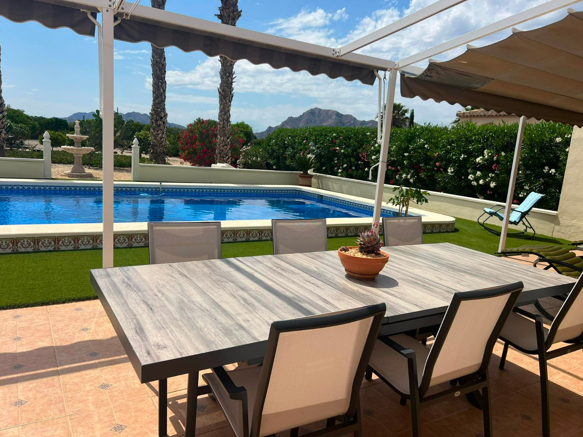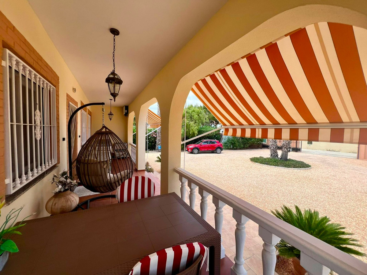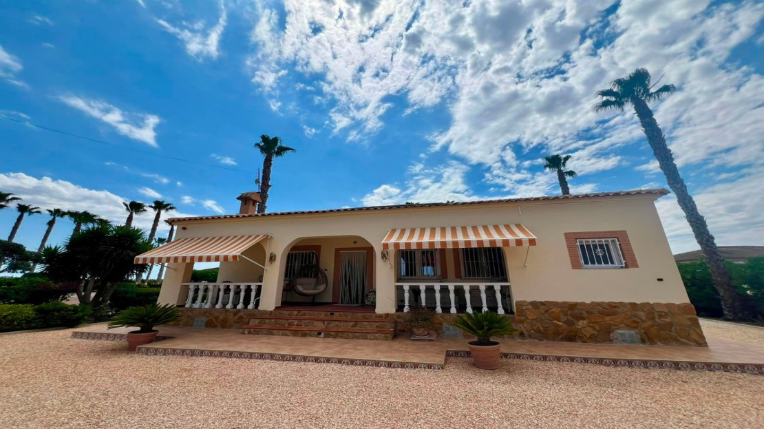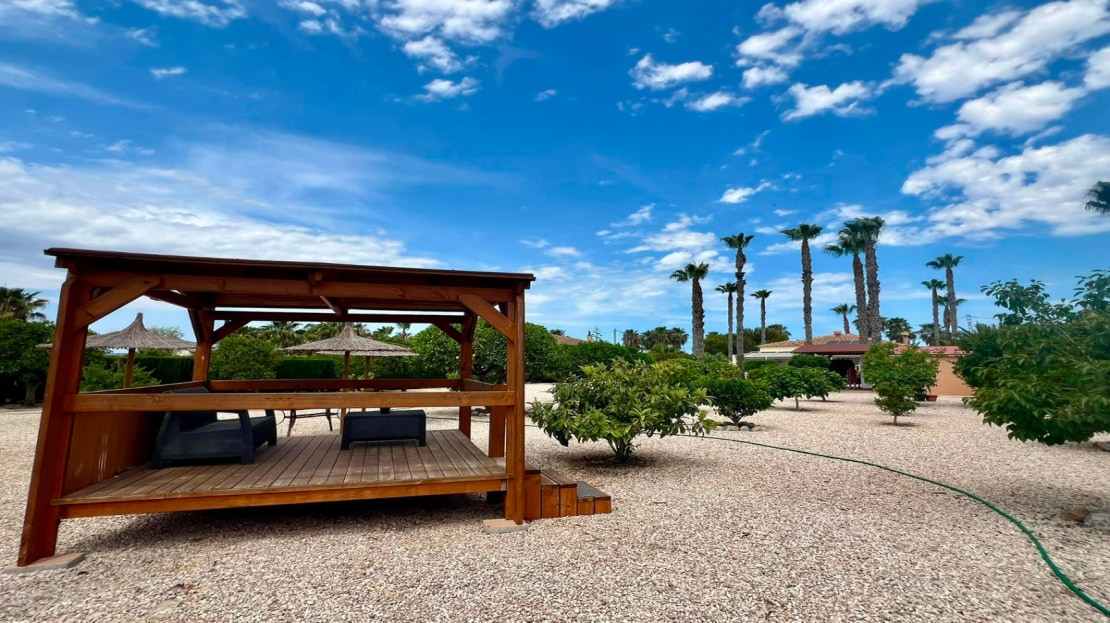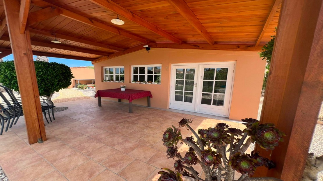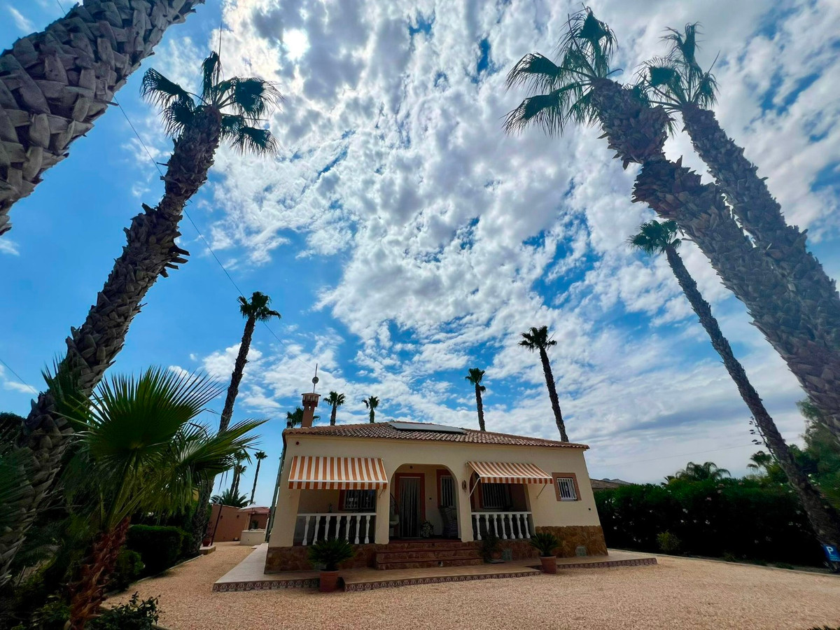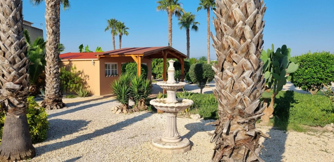 Beautiful property located in the countryside of San Bartolome , but only a 5-minute drive to amenities , supermarkets in Almoradi.The property has been renovated/modernised but still gives the 'finca' feeling. You drive into the fully fenced plot with a carport on the left and landscaped with several palm trees. A few steps lead up to the covered terrace where you can enjoy the morning sun. And so you enter the spacious living/dining room with fireplace and American kitchen with separate laundry room. The kitchen gives access to the rear terrace. Then on the right you will find the master bedroom with built-in wardrobe and ensuite bathroom. There is a separate bathroom , and another very spacious bedroom with built-in wardrobes, this was originally 2 bedrooms. This also gives access to the terrace with retractable awning. Here you will then find the beautifully landscaped pool where you can enjoy the sun , silence and view of the mountains. Further into the garden , which is laid with gravel for easy maintenance but with several fruit trees , you will find another storage room and a 'casita' annex with living room/breakfast area/bedroom and separate bathroom. The house has many extras : solar panels , infrared heating , air conditioning in all rooms , new windows , water deposit of 12000L.Centrally located between Rafal , Benejuzar and Almoradi , 20 minutes' drive to the beautiful sandy beaches of Guardamar and 45 minutes to Alicante airport.