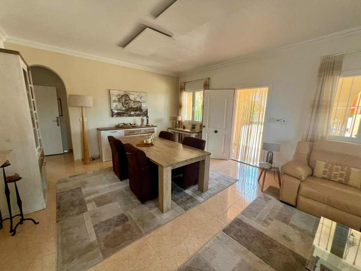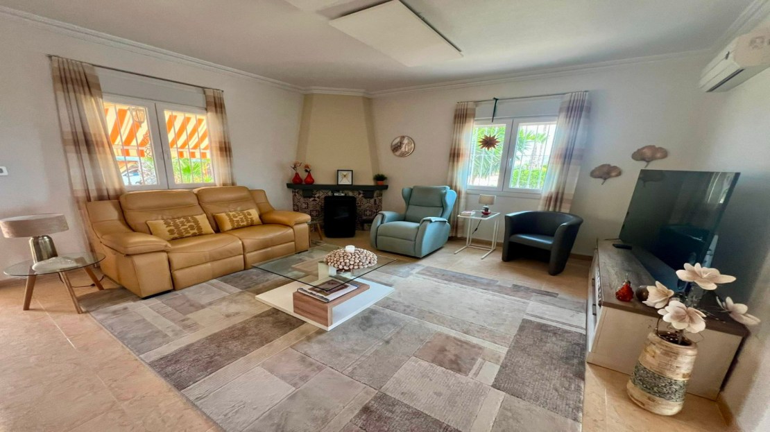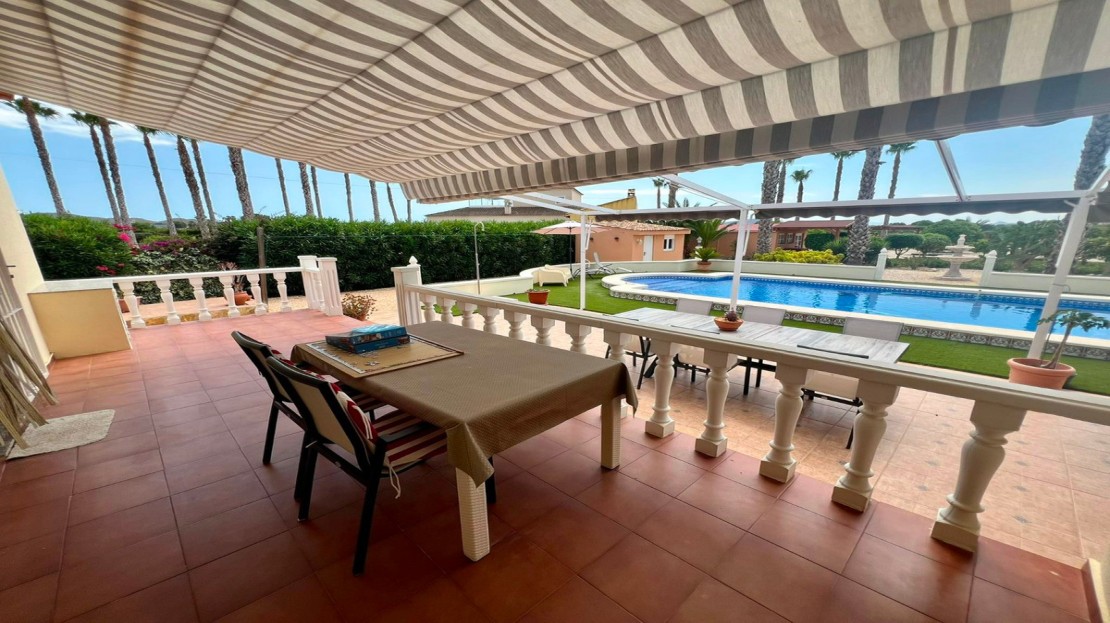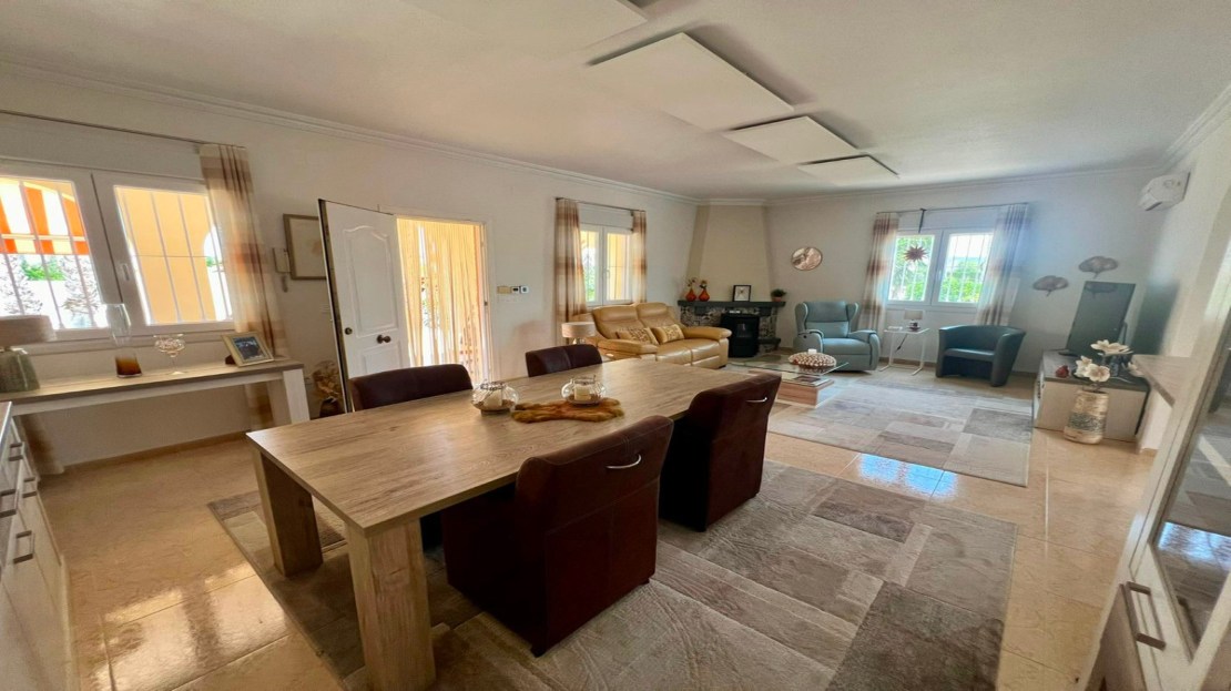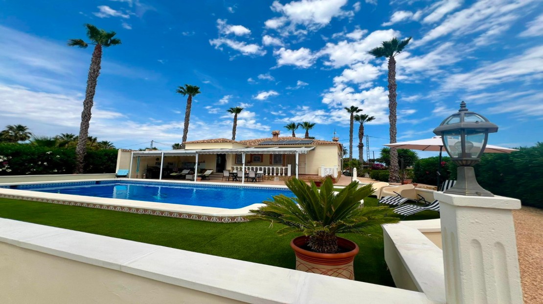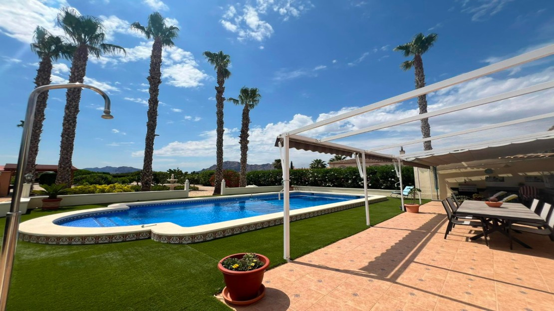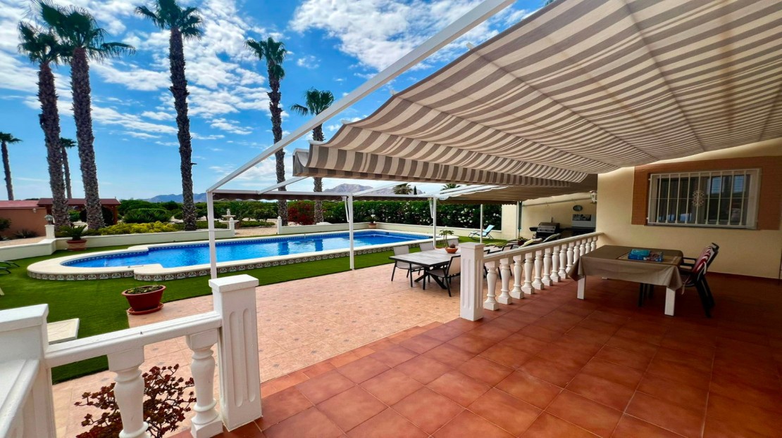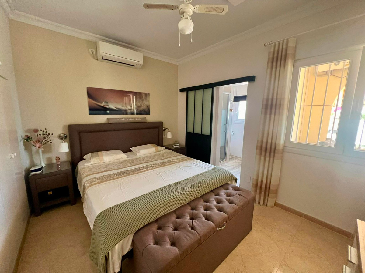 Beautiful property located in the countryside of San Bartolome , but only a 5-minute drive to amenities , supermarkets in Almoradi.The property has been renovated/modernised but still gives the 'finca' feeling. You drive into the fully fenced plot with a carport on the left and landscaped with several palm trees. A few steps lead up to the covered terrace where you can enjoy the morning sun. And so you enter the spacious living/dining room with fireplace and American kitchen with separate laundry room. The kitchen gives access to the rear terrace. Then on the right you will find the master bedroom with built-in wardrobe and ensuite bathroom. There is a separate bathroom , and another very spacious bedroom with built-in wardrobes, this was originally 2 bedrooms. This also gives access to the terrace with retractable awning. Here you will then find the beautifully landscaped pool where you can enjoy the sun , silence and view of the mountains. Further into the garden , which is laid with gravel for easy maintenance but with several fruit trees , you will find another storage room and a 'casita' annex with living room/breakfast area/bedroom and separate bathroom. The house has many extras : solar panels , infrared heating , air conditioning in all rooms , new windows , water deposit of 12000L.Centrally located between Rafal , Benejuzar and Almoradi , 20 minutes' drive to the beautiful sandy beaches of Guardamar and 45 minutes to Alicante airport.