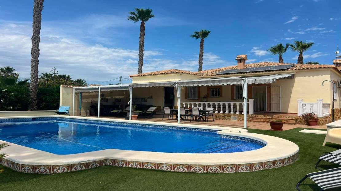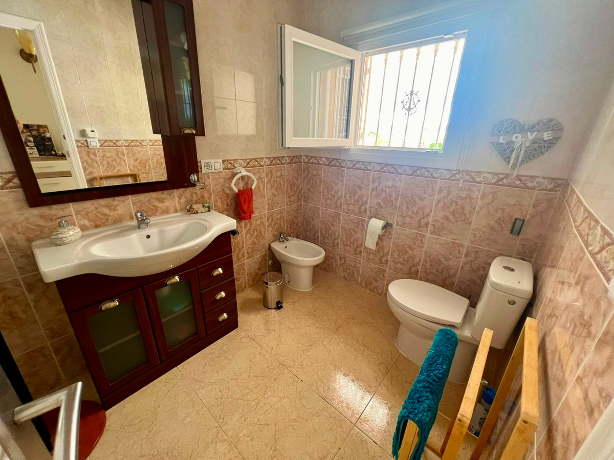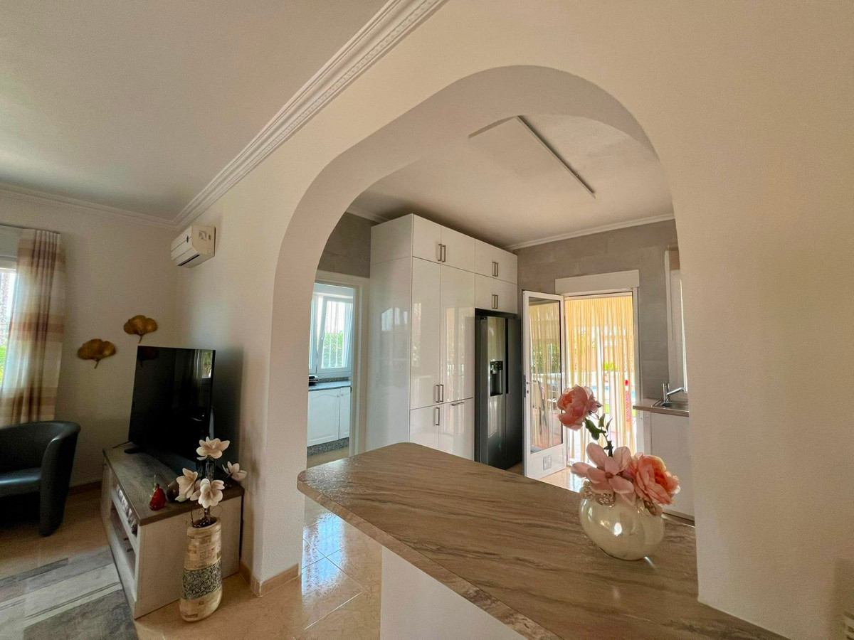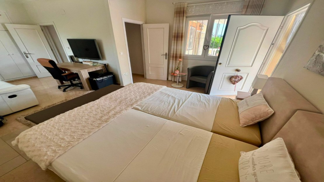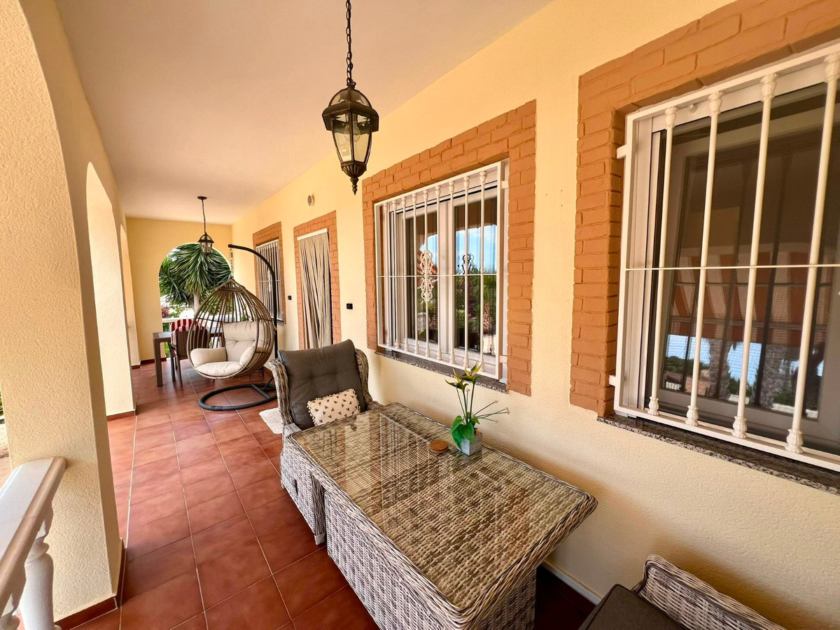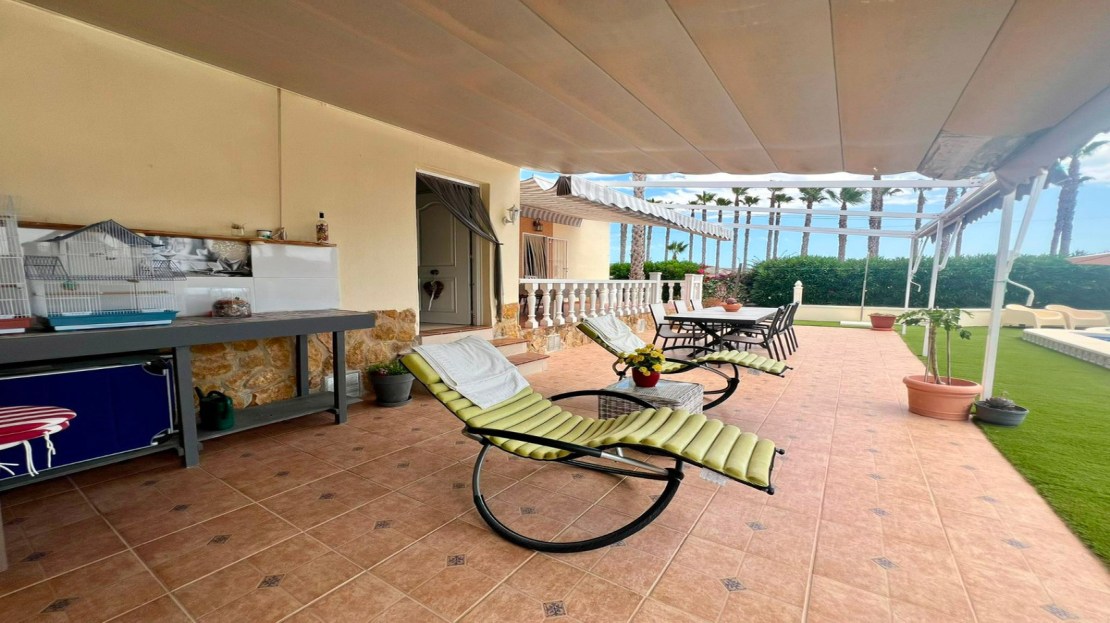 Beautiful property located in the countryside of San Bartolome , but only a 5-minute drive to amenities , supermarkets in Almoradi.The property has been renovated/modernised but still gives the 'finca' feeling. You drive into the fully fenced plot with a carport on the left and landscaped with several palm trees. A few steps lead up to the covered terrace where you can enjoy the morning sun. And so you enter the spacious living/dining room with fireplace and American kitchen with separate laundry room. The kitchen gives access to the rear terrace. Then on the right you will find the master bedroom with built-in wardrobe and ensuite bathroom. There is a separate bathroom , and another very spacious bedroom with built-in wardrobes, this was originally 2 bedrooms. This also gives access to the terrace with retractable awning. Here you will then find the beautifully landscaped pool where you can enjoy the sun , silence and view of the mountains. Further into the garden , which is laid with gravel for easy maintenance but with several fruit trees , you will find another storage room and a 'casita' annex with living room/breakfast area/bedroom and separate bathroom. The house has many extras : solar panels , infrared heating , air conditioning in all rooms , new windows , water deposit of 12000L.Centrally located between Rafal , Benejuzar and Almoradi , 20 minutes' drive to the beautiful sandy beaches of Guardamar and 45 minutes to Alicante airport.
