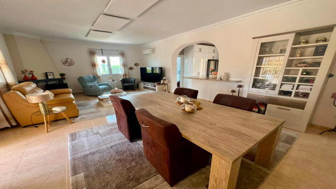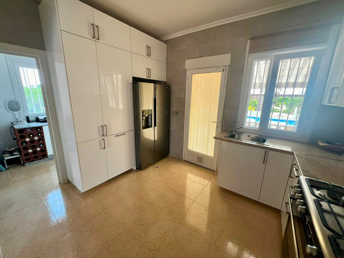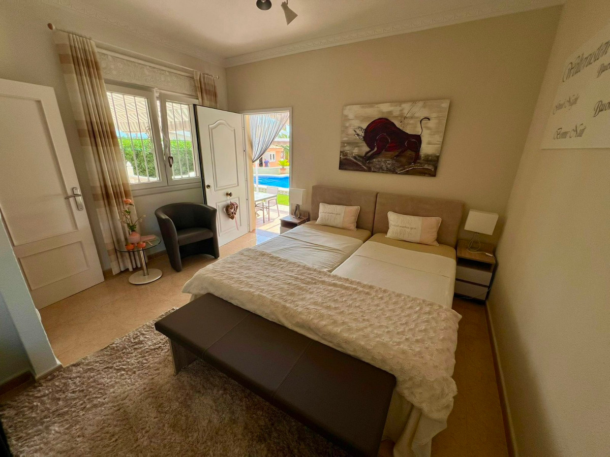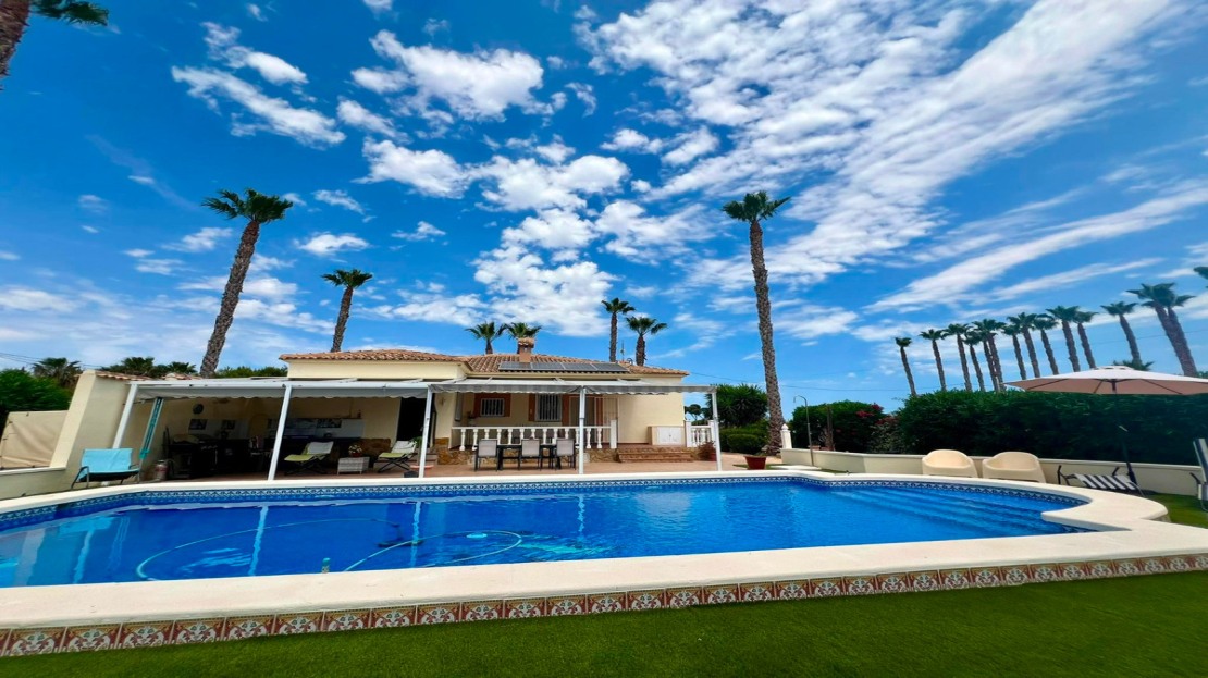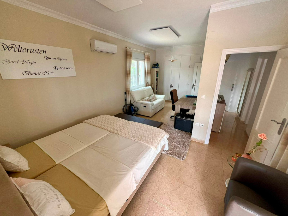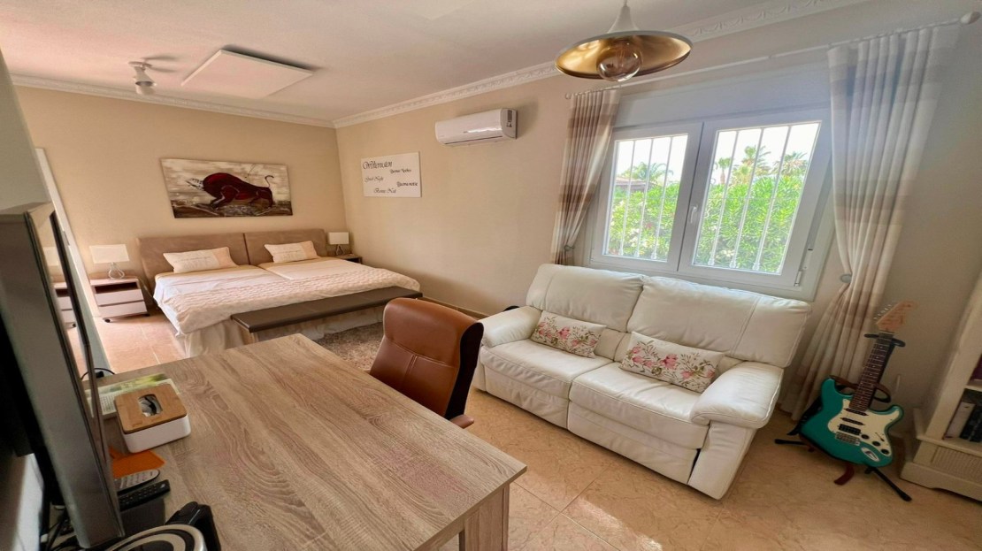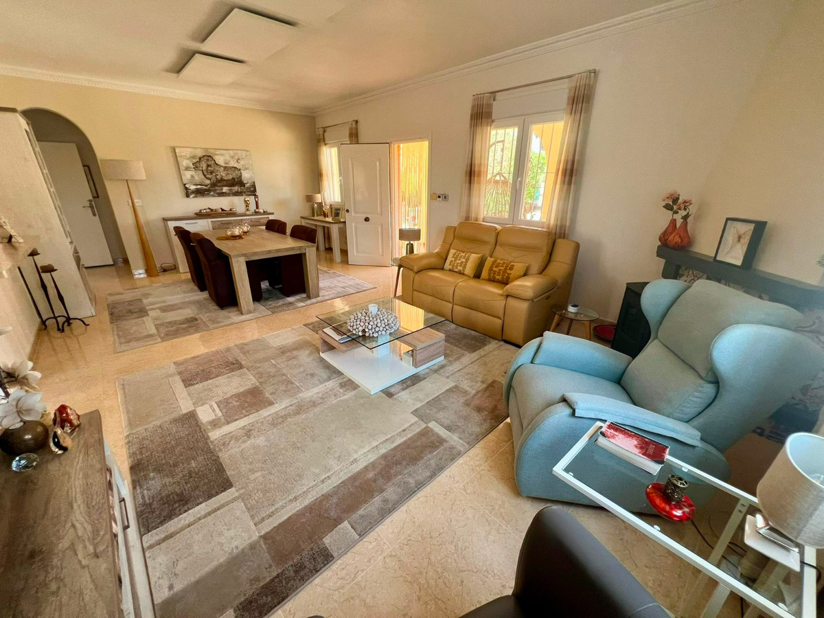 Beautiful property located in the countryside of San Bartolome , but only a 5-minute drive to amenities , supermarkets in Almoradi.The property has been renovated/modernised but still gives the 'finca' feeling. You drive into the fully fenced plot with a carport on the left and landscaped with several palm trees. A few steps lead up to the covered terrace where you can enjoy the morning sun. And so you enter the spacious living/dining room with fireplace and American kitchen with separate laundry room. The kitchen gives access to the rear terrace. Then on the right you will find the master bedroom with built-in wardrobe and ensuite bathroom. There is a separate bathroom , and another very spacious bedroom with built-in wardrobes, this was originally 2 bedrooms. This also gives access to the terrace with retractable awning. Here you will then find the beautifully landscaped pool where you can enjoy the sun , silence and view of the mountains. Further into the garden , which is laid with gravel for easy maintenance but with several fruit trees , you will find another storage room and a 'casita' annex with living room/breakfast area/bedroom and separate bathroom. The house has many extras : solar panels , infrared heating , air conditioning in all rooms , new windows , water deposit of 12000L.Centrally located between Rafal , Benejuzar and Almoradi , 20 minutes' drive to the beautiful sandy beaches of Guardamar and 45 minutes to Alicante airport.