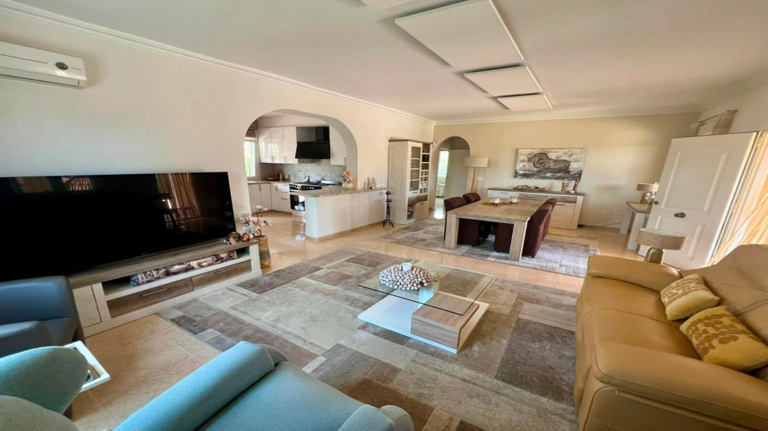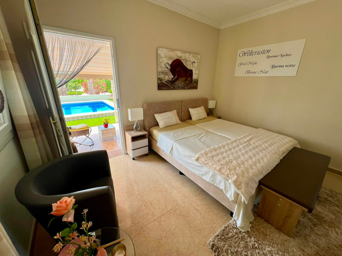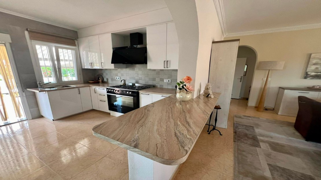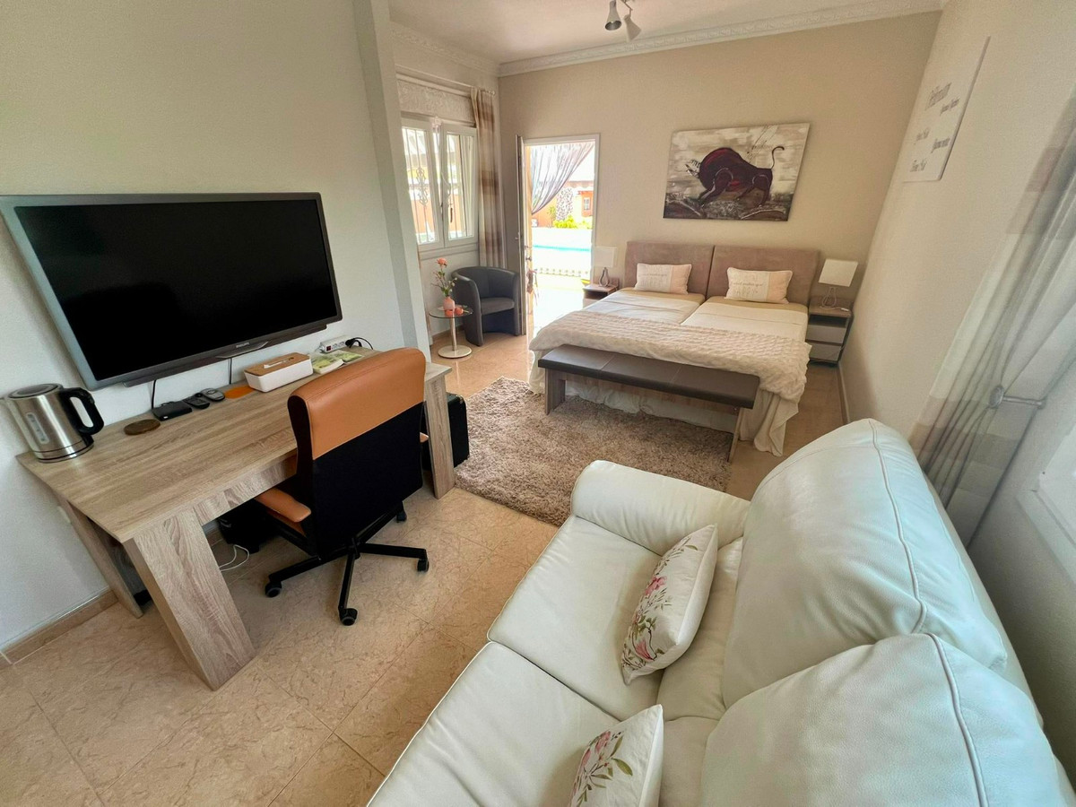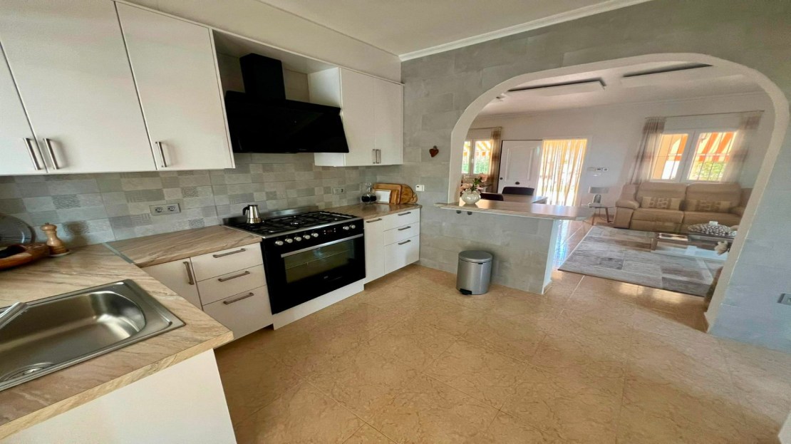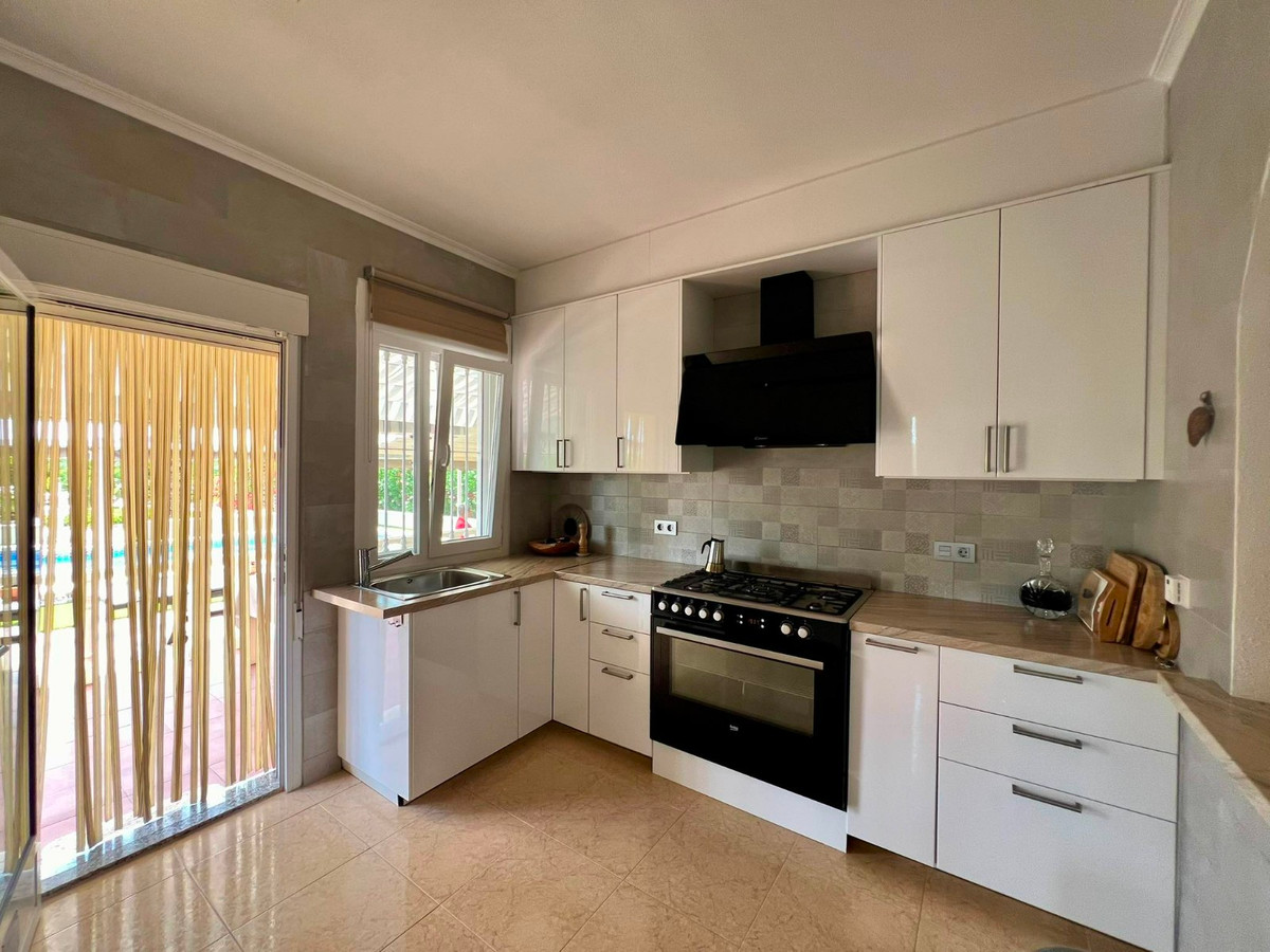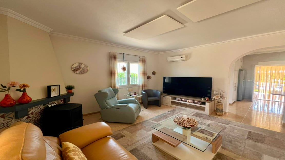 Beautiful property located in the countryside of San Bartolome , but only a 5-minute drive to amenities , supermarkets in Almoradi.The property has been renovated/modernised but still gives the 'finca' feeling. You drive into the fully fenced plot with a carport on the left and landscaped with several palm trees. A few steps lead up to the covered terrace where you can enjoy the morning sun. And so you enter the spacious living/dining room with fireplace and American kitchen with separate laundry room. The kitchen gives access to the rear terrace. Then on the right you will find the master bedroom with built-in wardrobe and ensuite bathroom. There is a separate bathroom , and another very spacious bedroom with built-in wardrobes, this was originally 2 bedrooms. This also gives access to the terrace with retractable awning. Here you will then find the beautifully landscaped pool where you can enjoy the sun , silence and view of the mountains. Further into the garden , which is laid with gravel for easy maintenance but with several fruit trees , you will find another storage room and a 'casita' annex with living room/breakfast area/bedroom and separate bathroom. The house has many extras : solar panels , infrared heating , air conditioning in all rooms , new windows , water deposit of 12000L.Centrally located between Rafal , Benejuzar and Almoradi , 20 minutes' drive to the beautiful sandy beaches of Guardamar and 45 minutes to Alicante airport.