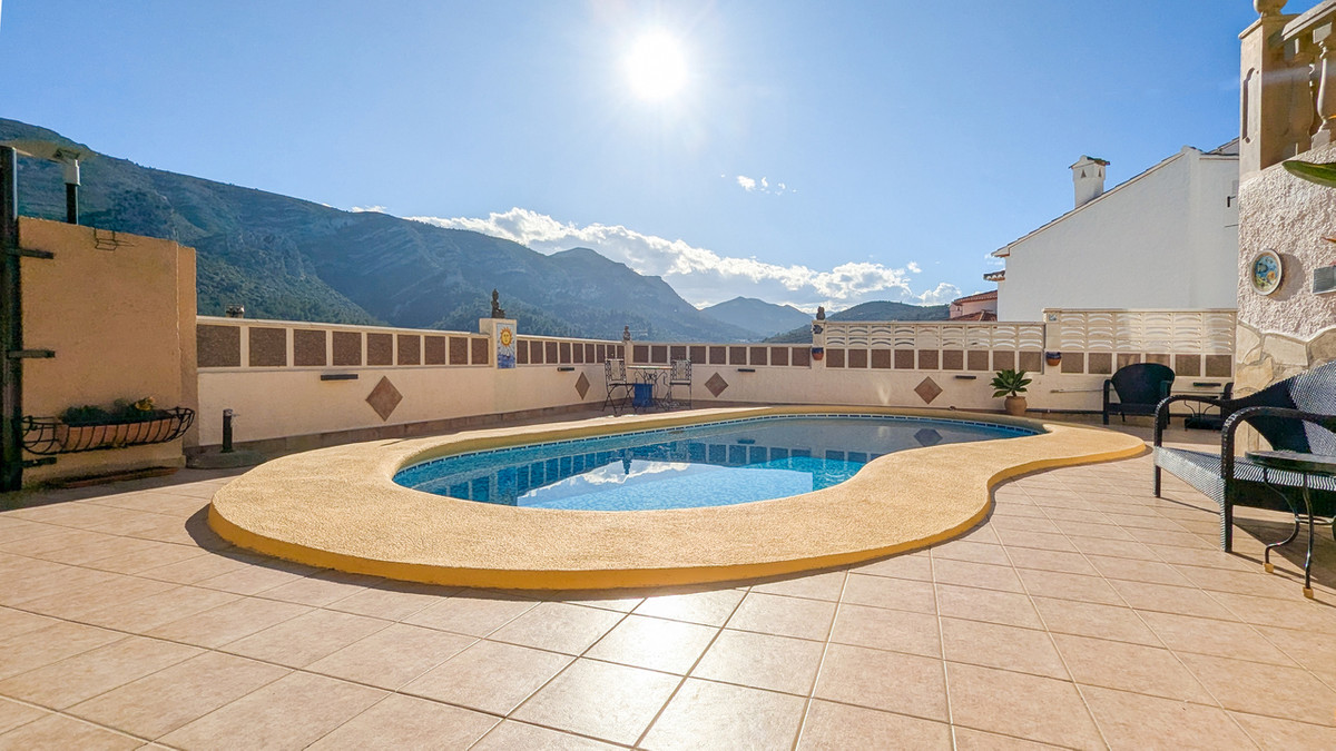 We are pleased to offer this well maintained 2/3 bedroom 2 bath villa close to the popular town of Pedreguer which is about 20/25 minutes from both Denia and Javea.The property is accessed via electric sliding gates that open to a carport, from where a few steps take us to the pool terrace which features an 8×4 kidney pool which gets the sun all day and which offers superb mountain views. The property is surrounded by low maintenance gardens with various sitting areas to take advantage of the sun or shade as you choose, and there is a BBQ area to fully enjoy outdoor living to the full.A few steps take us to the entrance of the property with a double glazed south facing enclosed patio which gets winter sun for the majority of the day, and which also offers the mountain views. You then go through to the beautiful open plan living area comprising a large living room, with a modern dining kitchen with a central island opening to one side, and a dining room to another. There are currently two double bedrooms which are both ensuite and both have built in wardrobes. The dining room was a third bedroom, and this can easily be converted back for extra sleeping space.There is hot/cold air conditioning throughout, there are 5 electric radiators, and the living room has a gas fire fitted in the fireplace. The hot water is heated by a gas boiler. and the property is fitted with 16 solar panels for maximum efficiency.There is an underbuild, currently used for all important storage. A visit to the property is highly recommended to appreciate all the benefits this property offers, and we look forward to hearing from you soon.