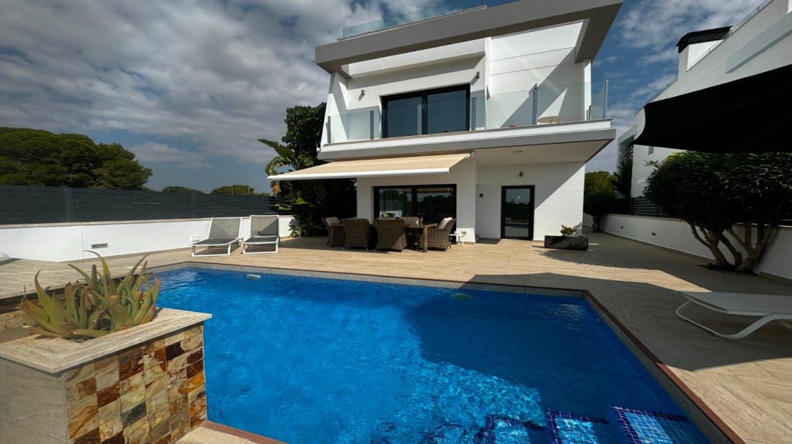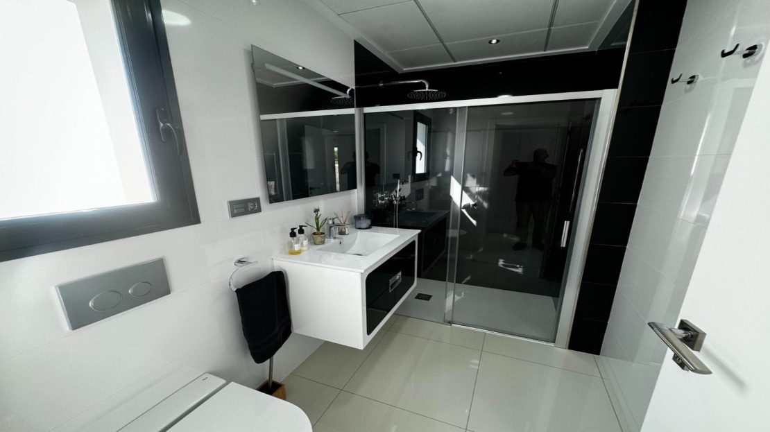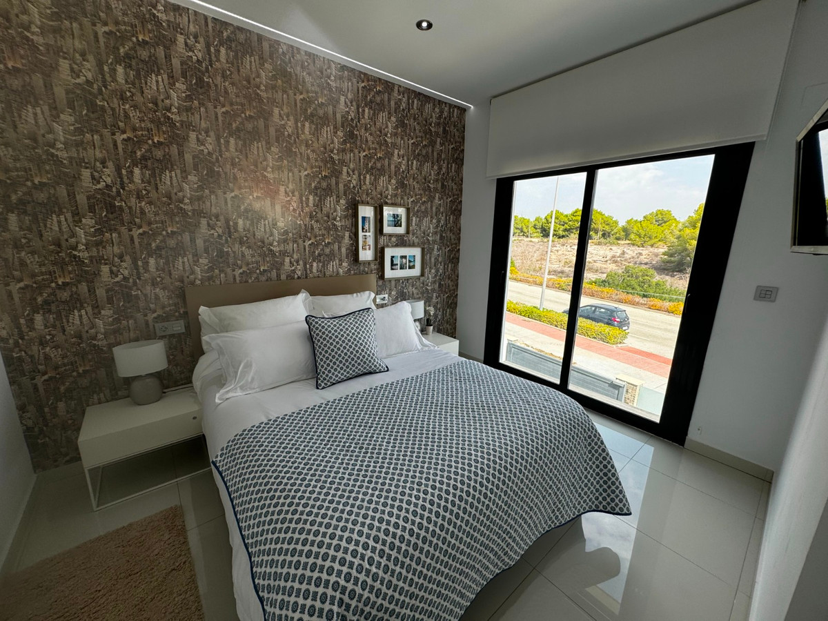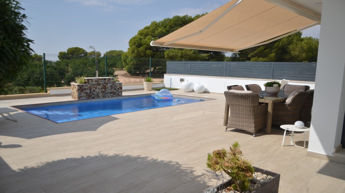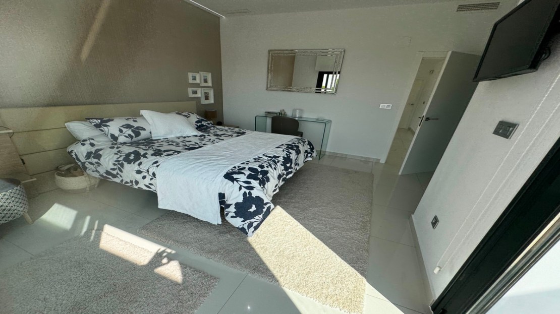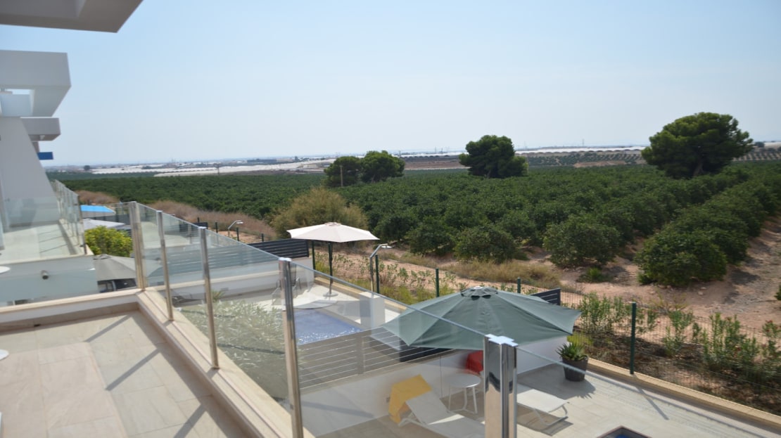 A luxurius villa with beautiful views across the orange fields and views towards the sea. This modern villa is very spacious and has three bedrooms with three bathrooms, a large private pool and is very private. The property is located on the Lo Romero Golf course and has 360 degree views of the sea, golf, mountains and the various orchards. The villa has air conditioning with airzone, underfloor heating in the bathrooms and electric shutters, with the high ceilings and the South facing orientation this is a very light and airy villa and is perfect for anyone looking for views and peace and quiet.