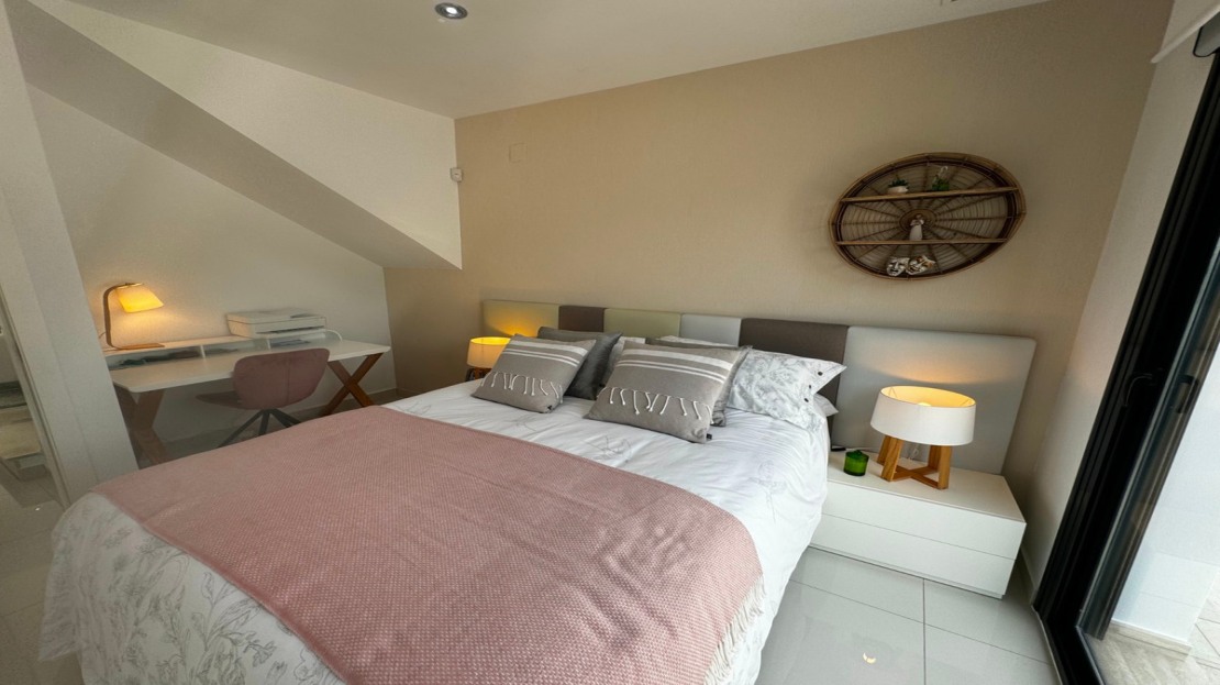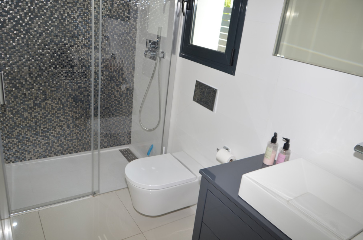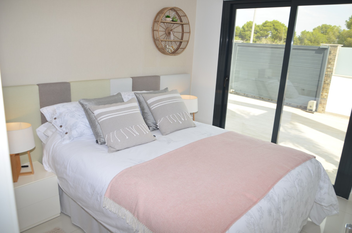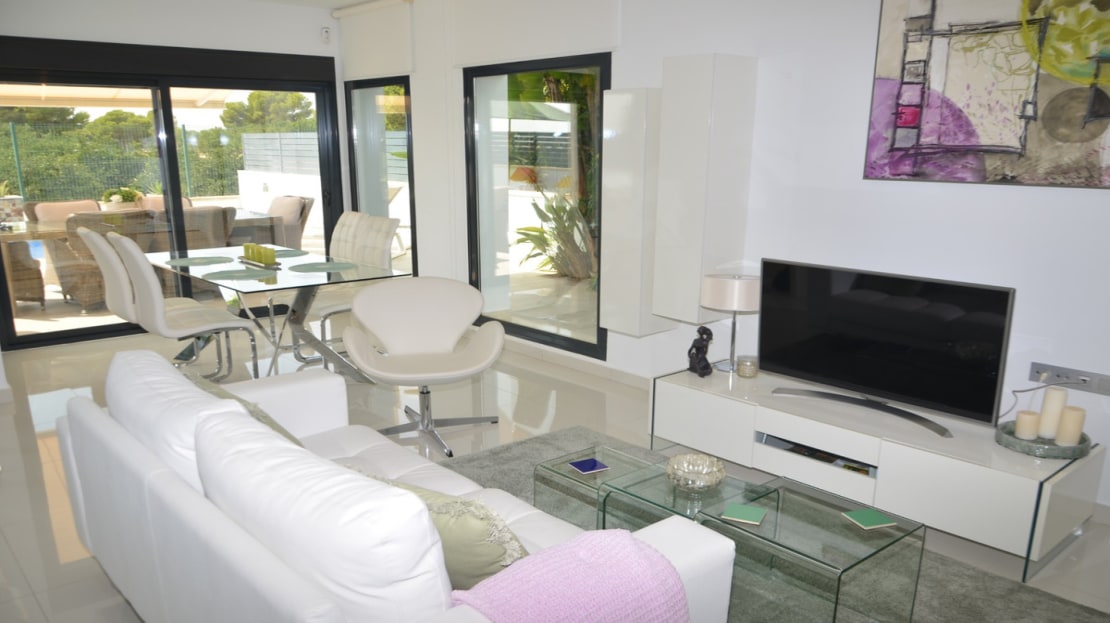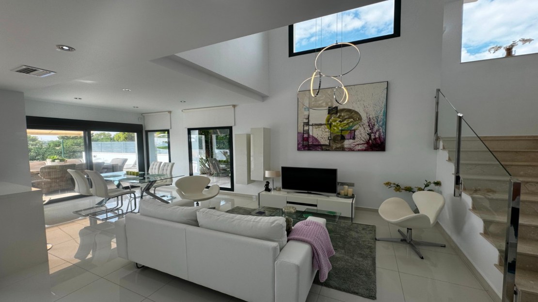 A luxurius villa with beautiful views across the orange fields and views towards the sea. This modern villa is very spacious and has three bedrooms with three bathrooms, a large private pool and is very private. The property is located on the Lo Romero Golf course and has 360 degree views of the sea, golf, mountains and the various orchards. The villa has air conditioning with airzone, underfloor heating in the bathrooms and electric shutters, with the high ceilings and the South facing orientation this is a very light and airy villa and is perfect for anyone looking for views and peace and quiet.
