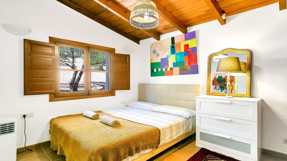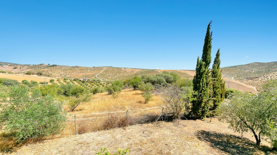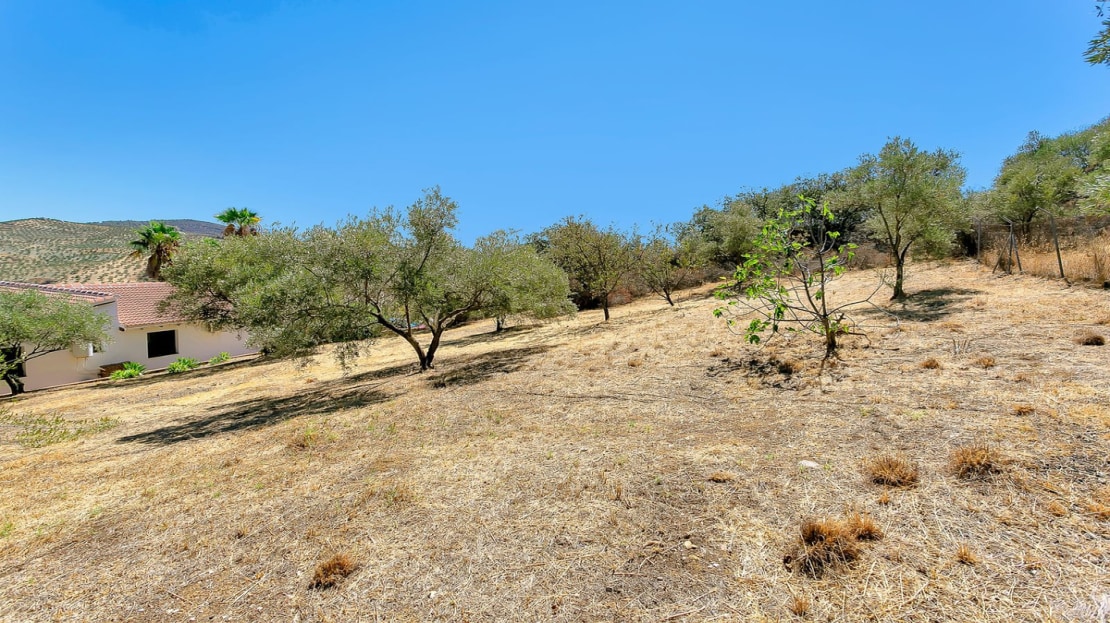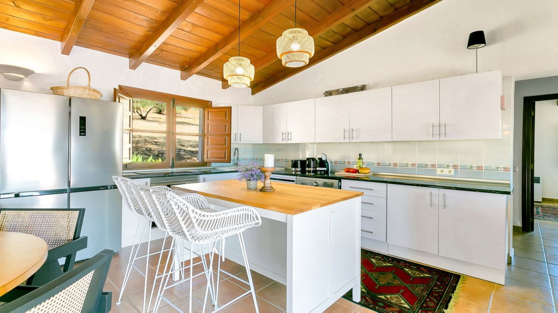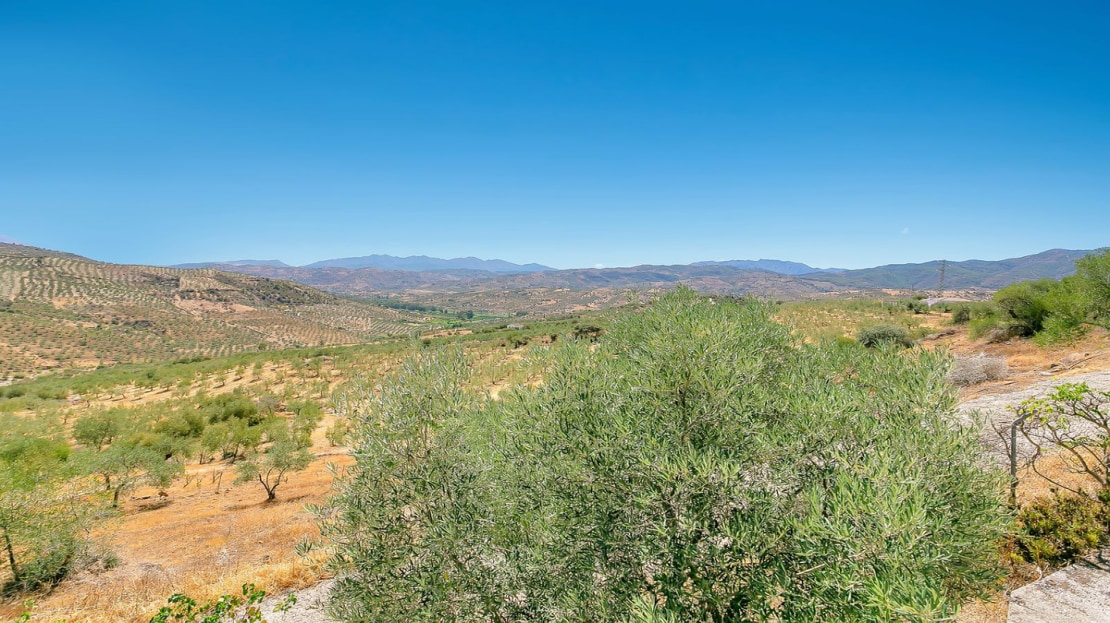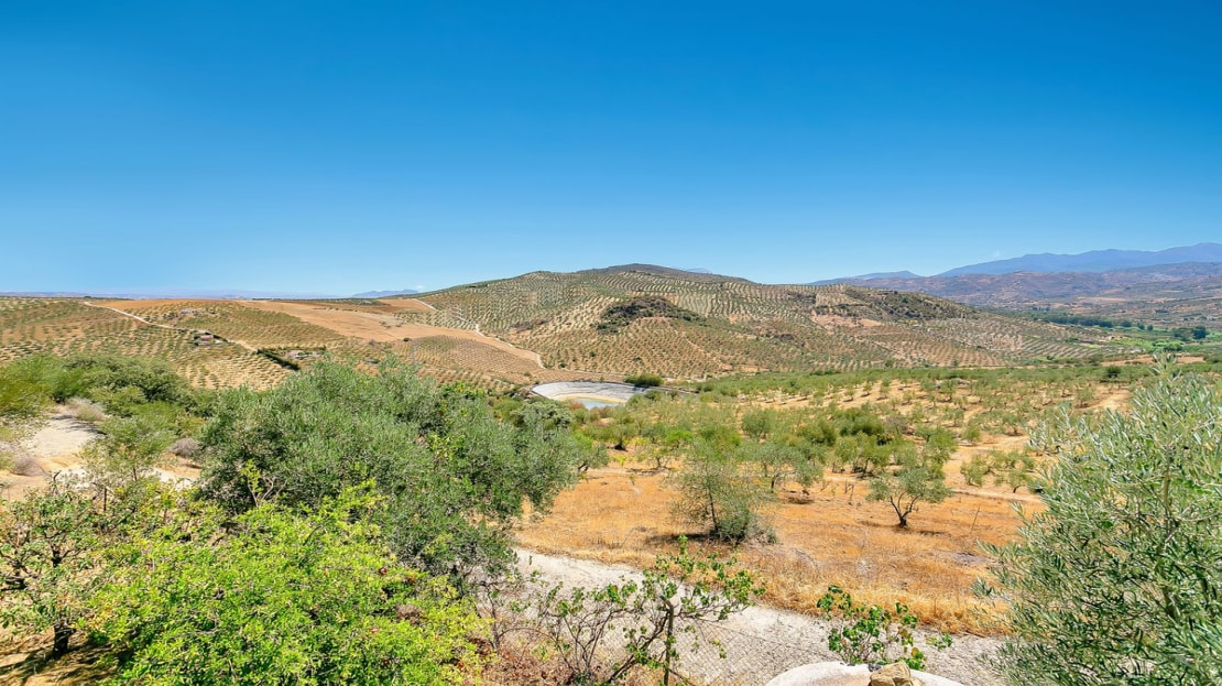 In front of the finca, a covered terrace provides an ideal spot for relaxation and al fresco dining, overlooking the pool and expansive landscape. This area also connects to an outdoor BBQ space, perfect for entertaining. The pool area is fully tiled, and the property sits on a generous plot of land, perfect for creating your own garden or cultivating fruit and vegetables. On the plot, you’ll already find a variety of fruit and nut trees, including orange, pepper, almond, apple, and pomegranate trees, as well as 26 olive trees and grapes.