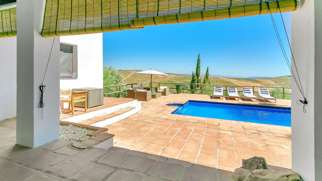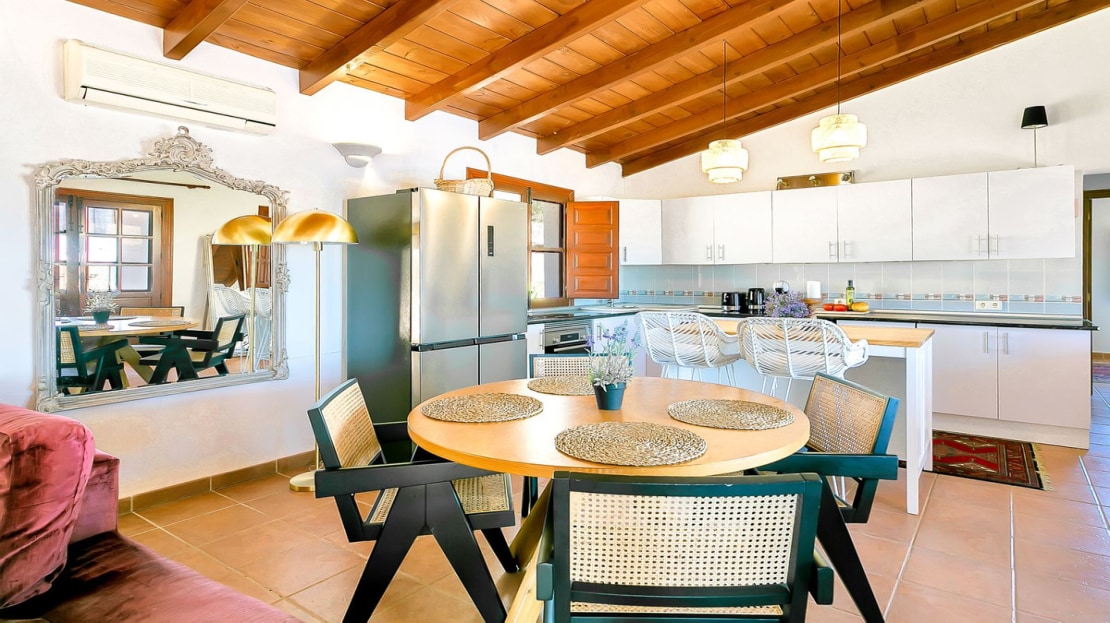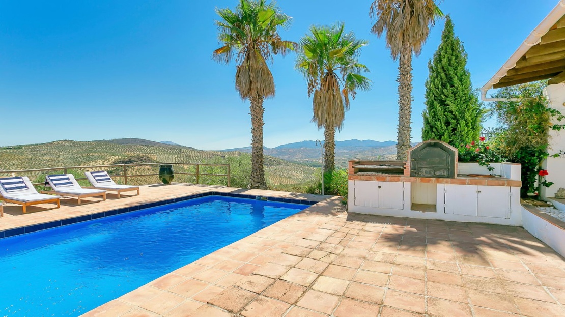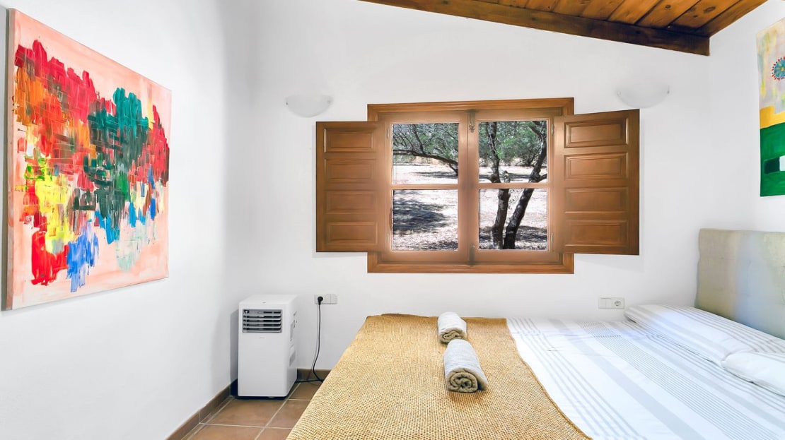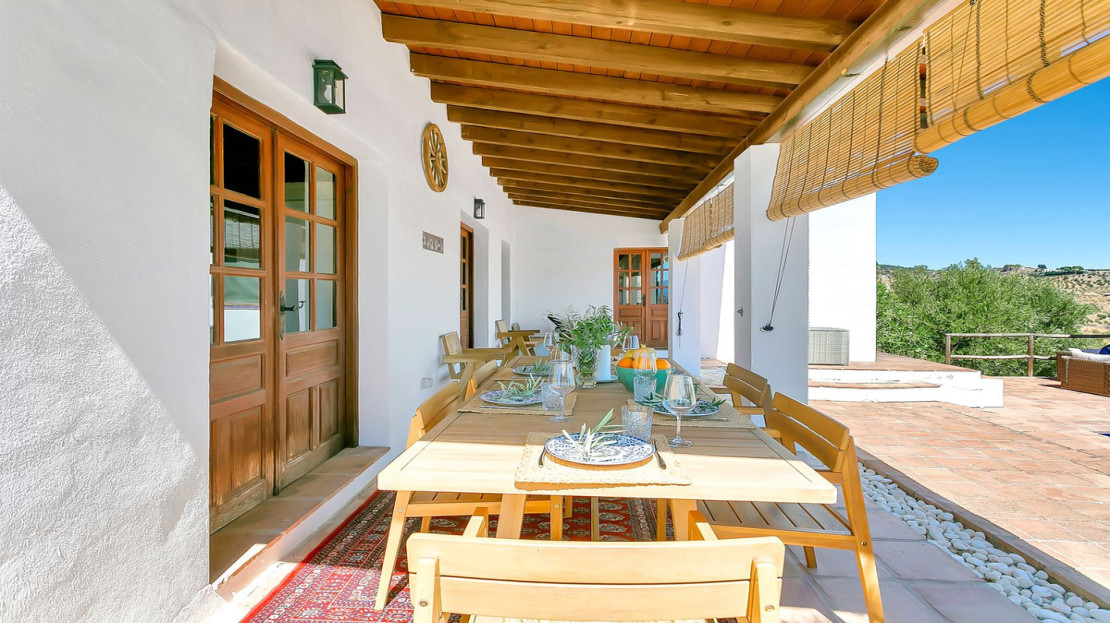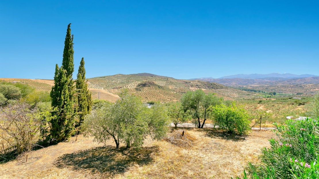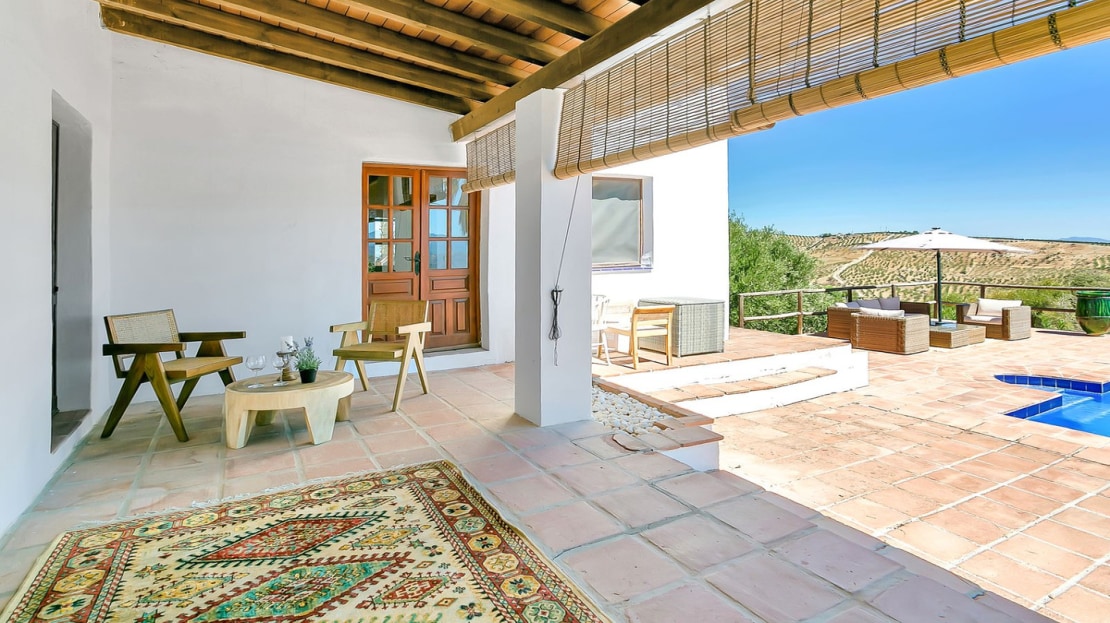 In front of the finca, a covered terrace provides an ideal spot for relaxation and al fresco dining, overlooking the pool and expansive landscape. This area also connects to an outdoor BBQ space, perfect for entertaining. The pool area is fully tiled, and the property sits on a generous plot of land, perfect for creating your own garden or cultivating fruit and vegetables. On the plot, you’ll already find a variety of fruit and nut trees, including orange, pepper, almond, apple, and pomegranate trees, as well as 26 olive trees and grapes.
