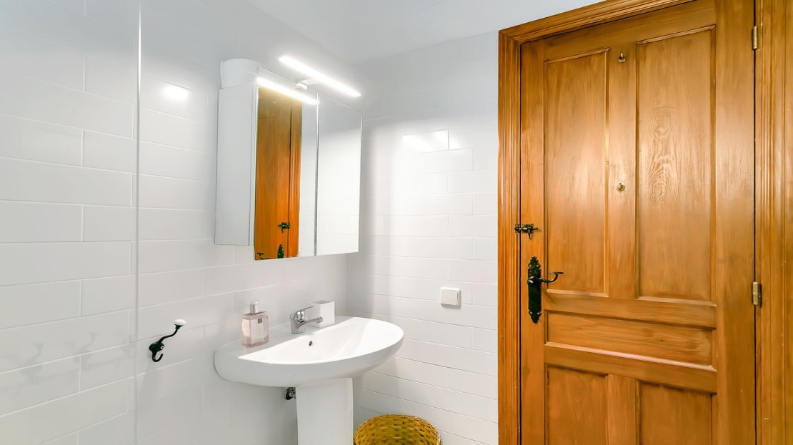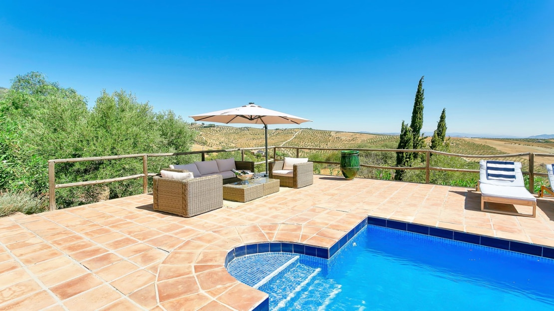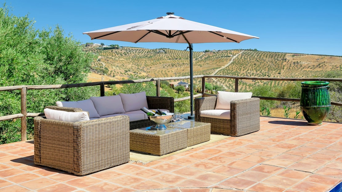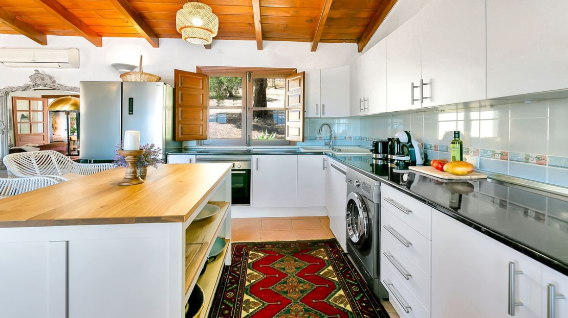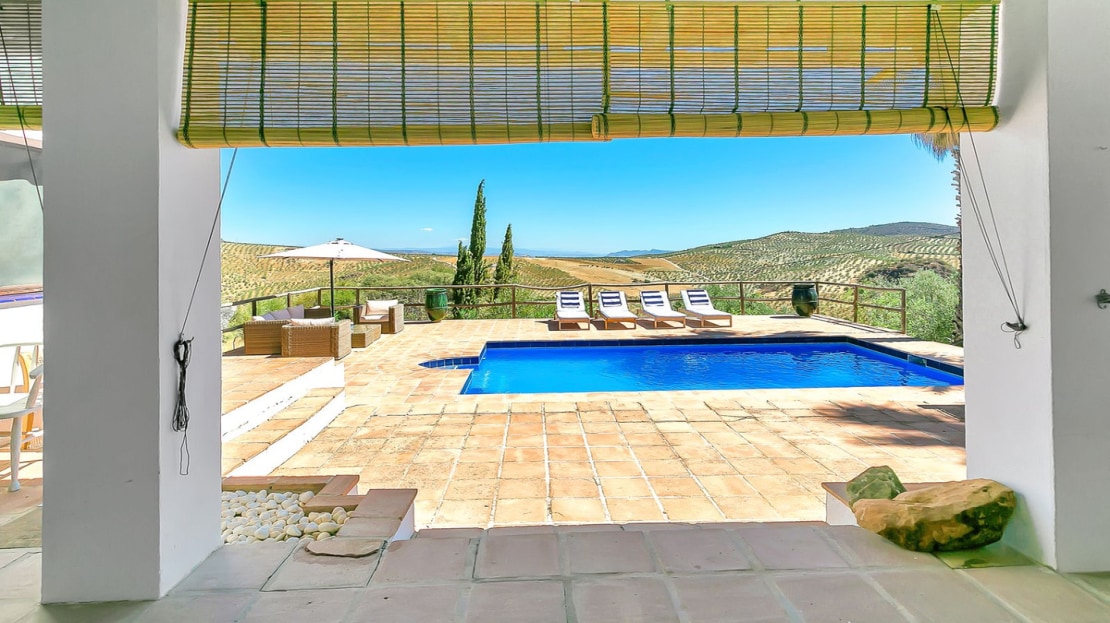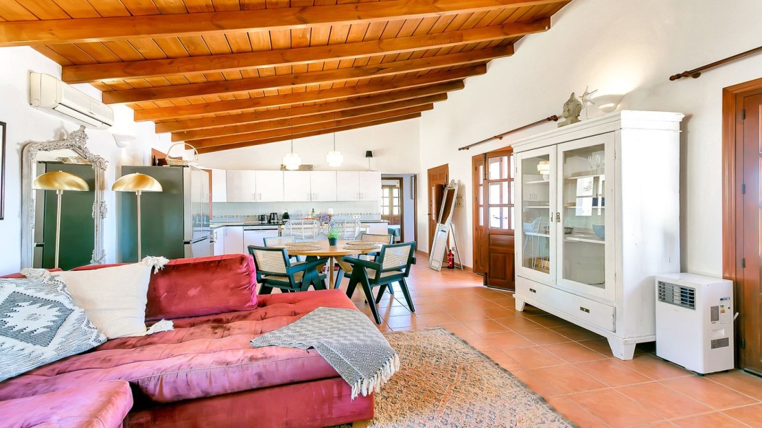 In front of the finca, a covered terrace provides an ideal spot for relaxation and al fresco dining, overlooking the pool and expansive landscape. This area also connects to an outdoor BBQ space, perfect for entertaining. The pool area is fully tiled, and the property sits on a generous plot of land, perfect for creating your own garden or cultivating fruit and vegetables. On the plot, you’ll already find a variety of fruit and nut trees, including orange, pepper, almond, apple, and pomegranate trees, as well as 26 olive trees and grapes.