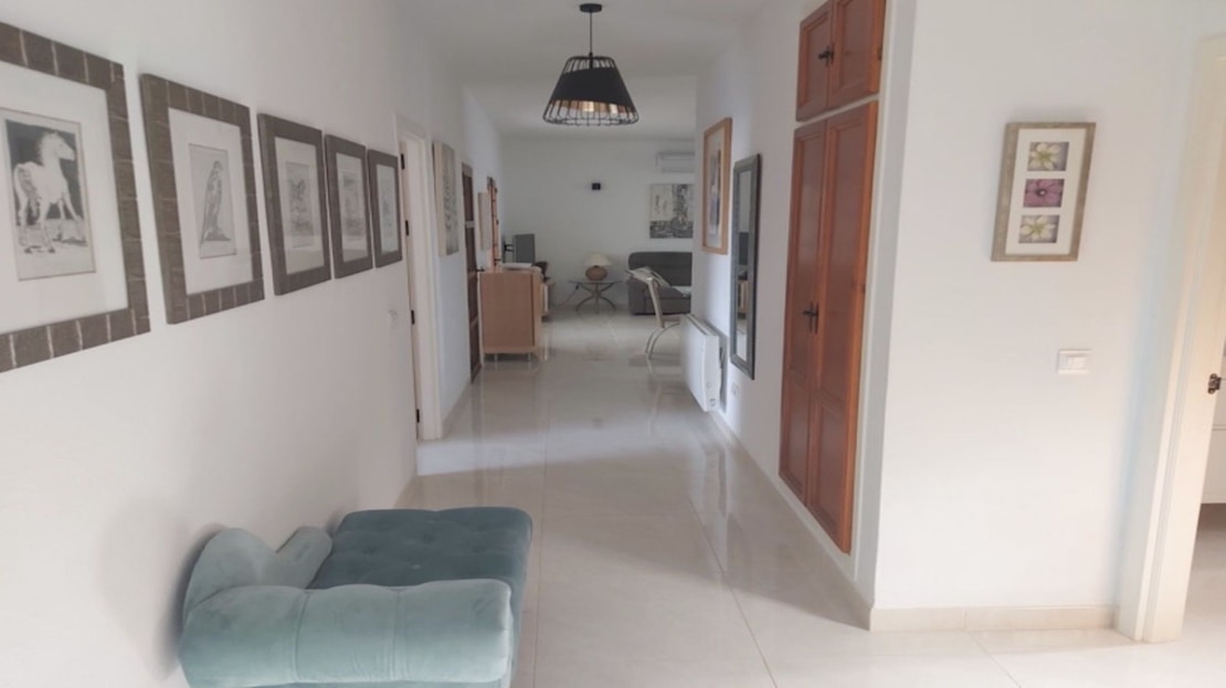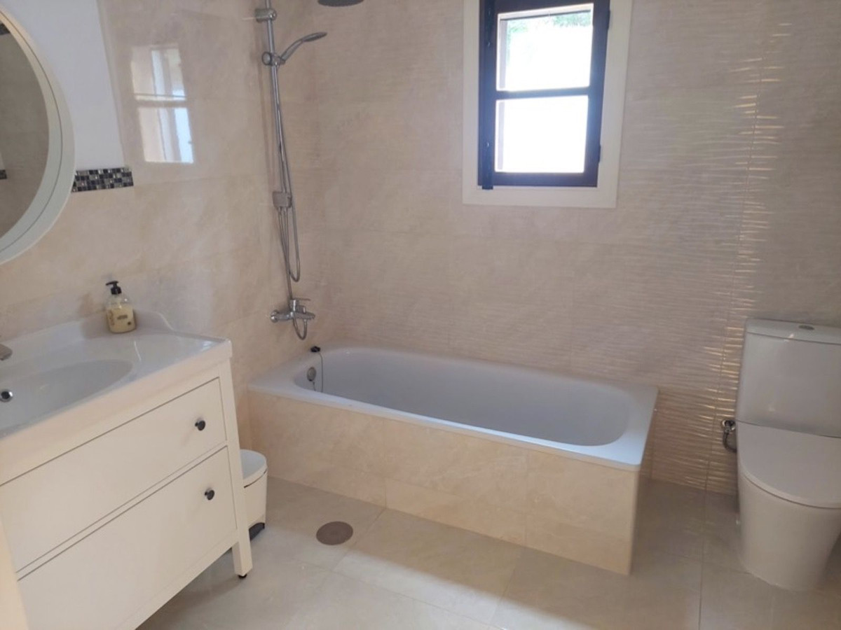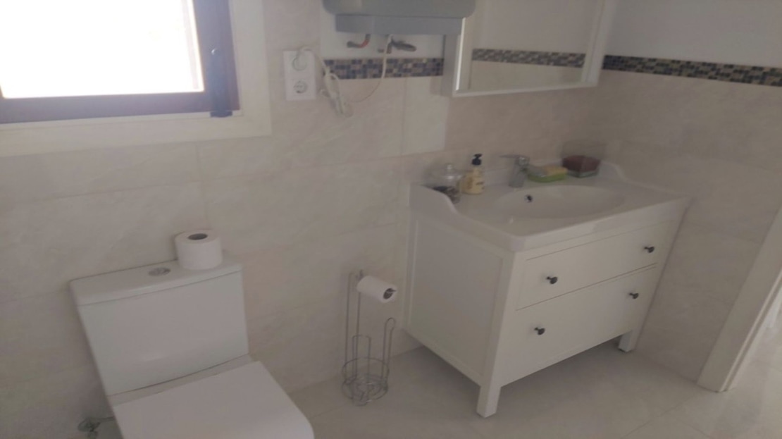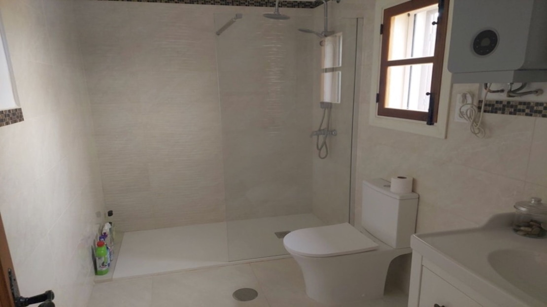 The attractive, wide hallway leads to the family bathroom and the 3 double bedrooms. There is more than sufficient built-in wardrobe space and the master bedroom has a full ensuite shower- room. Both the bathrooms are newly-fitted throughout with new wall tiling. The whole floor of the house is also newly tiled in “Travertine” porcelain.