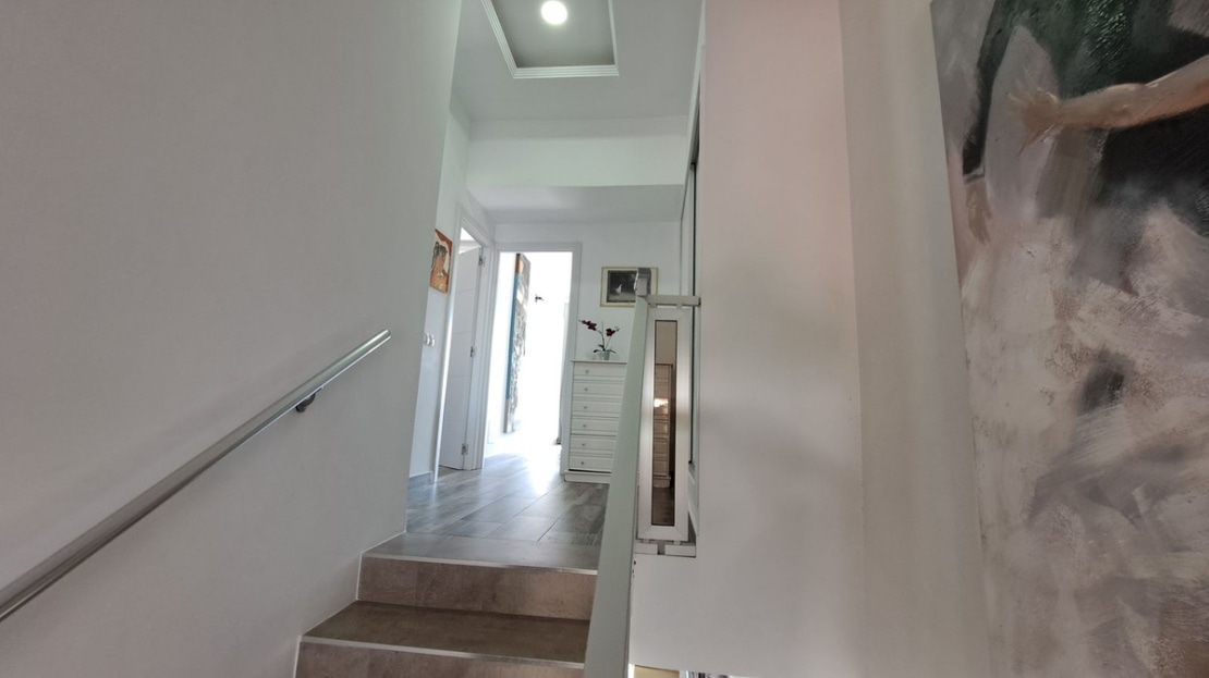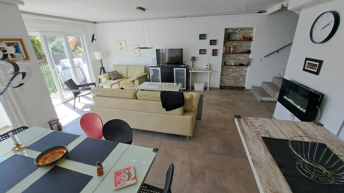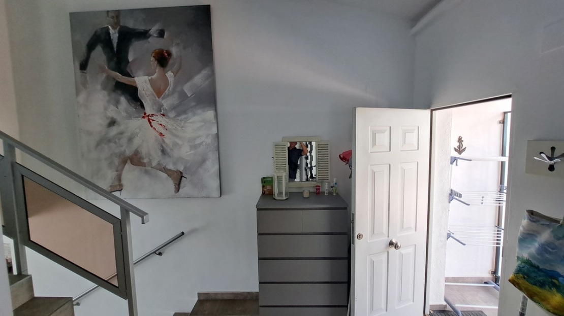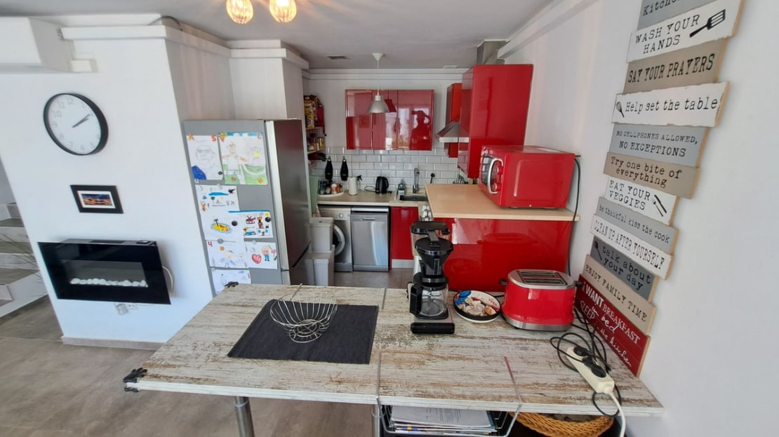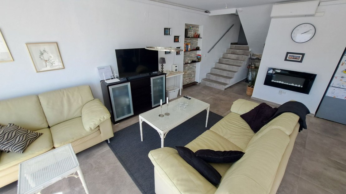 The property is on 3 levels. On ground level you will find the large lounge area with working fire place, dining area, a fully fitted kitchen, and terrace area, on the second level is the entrance of the property with the secundary bedroom and one bathroom, on the third level of the property is the master bedroom with onsuite bathroom and fitted wardrobe, also the third bedroom.