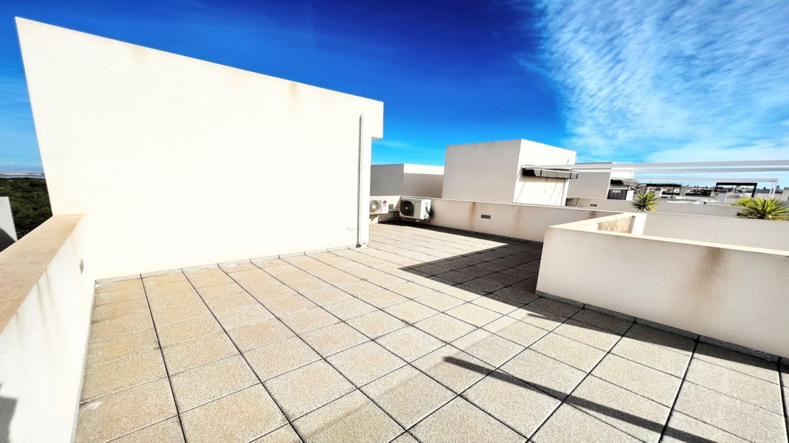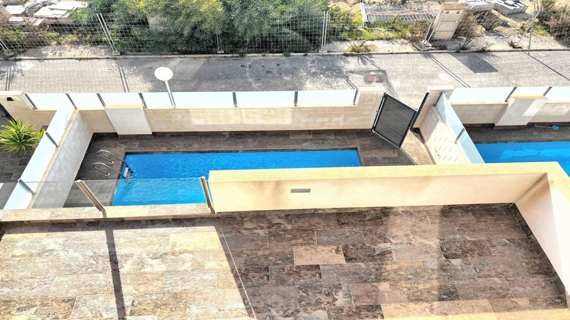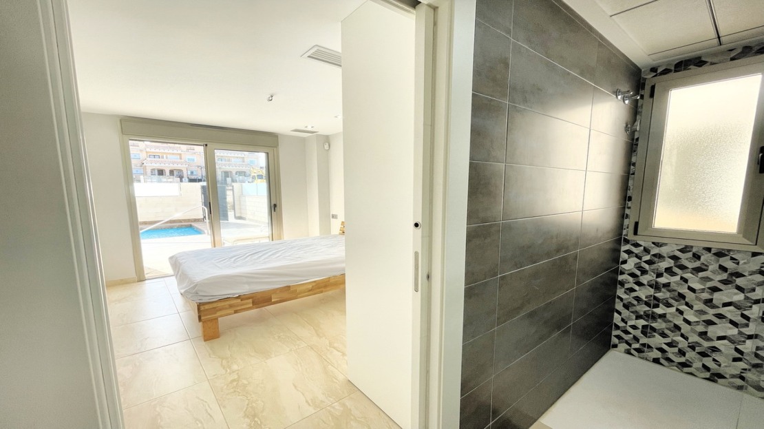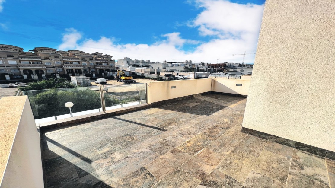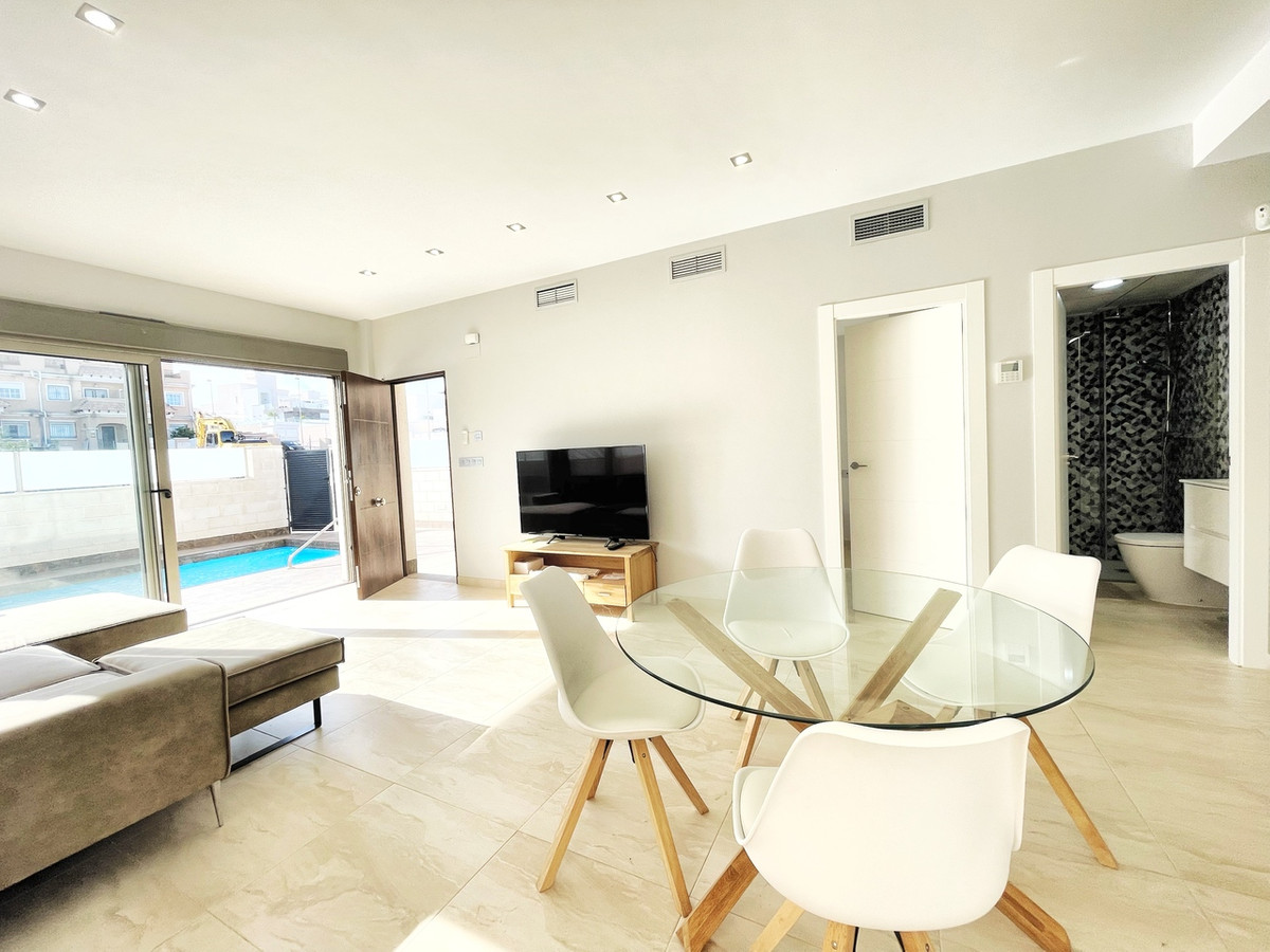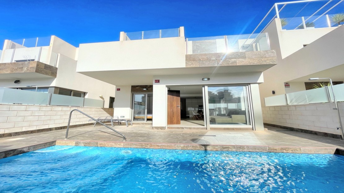 Beautiful detached villa, recently built in a popular, growing area with close proximity to supermarkets, restaurants, shops and numerous world class golf courses. Built over two levels this modern 3 bedroom, 3 bathroom villa is set on a 121m2 plot with a 3×6 private swimming pool, secluded terrace accessed from the upper level along with the stunning solarium boasting panoramic views across the pine forest and pink salt-lake. The property has an open plan living and dining room with an American style kitchen and breakfast bar. The lower level of the villa also has a guest bedroom and bathroom along with a utility room and storage cupboard. On the upper level of the villa you will find 2 big bedrooms both with en-suite bathrooms and access to the sun terrace. The property is sold with many extras including air-conditioning. Viewing recommended.