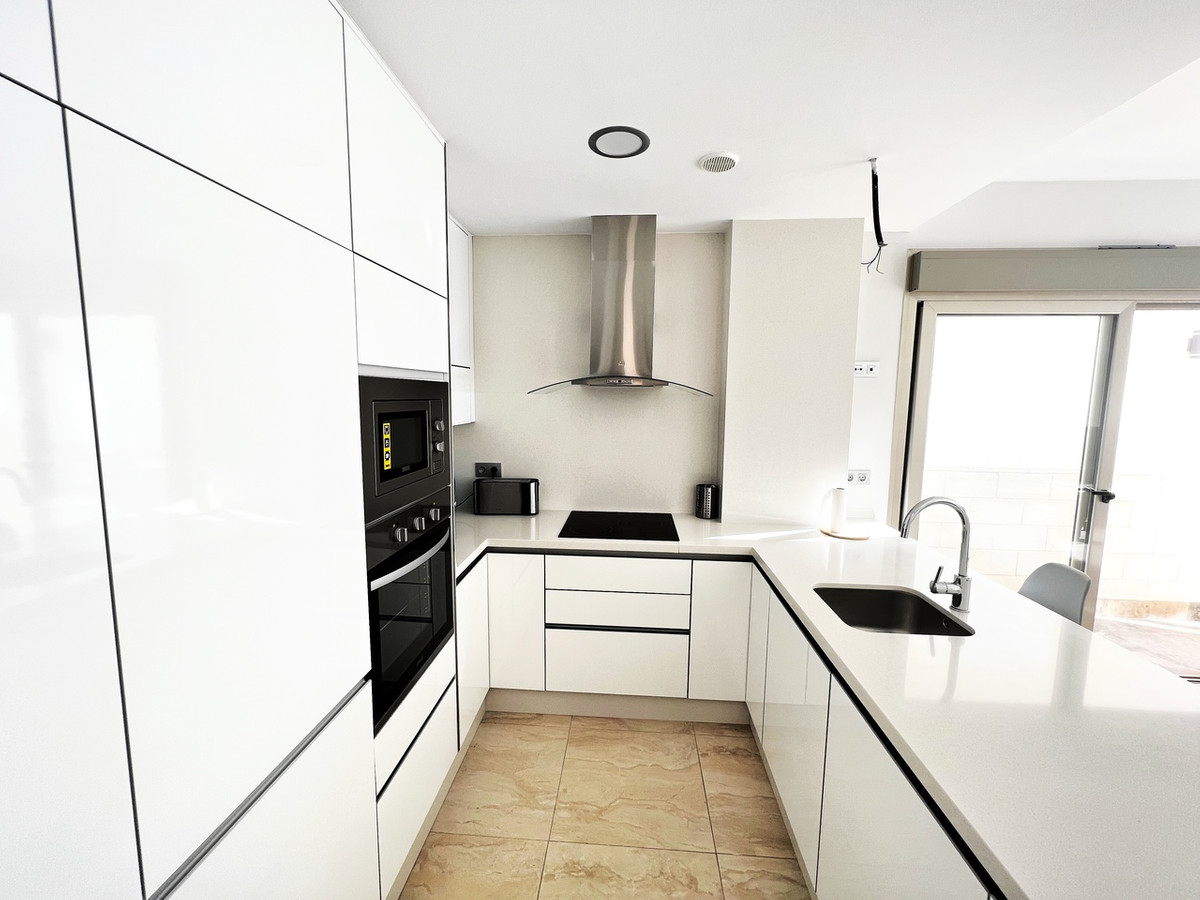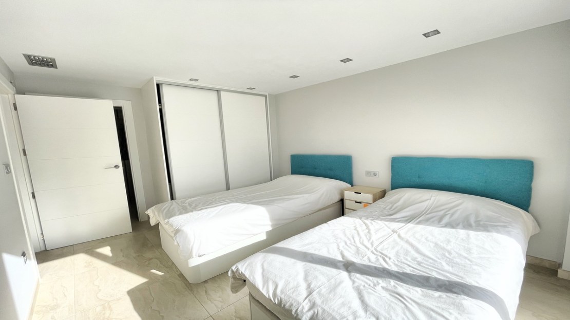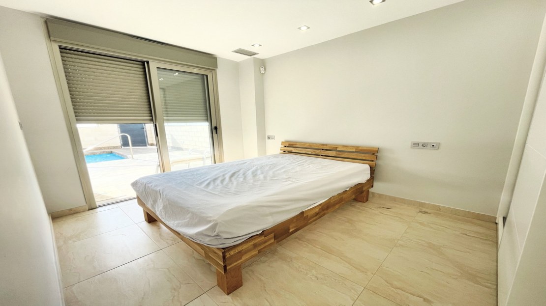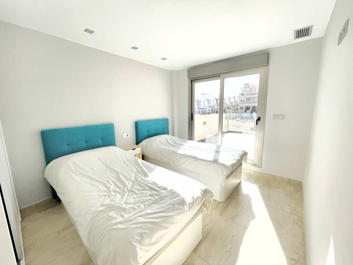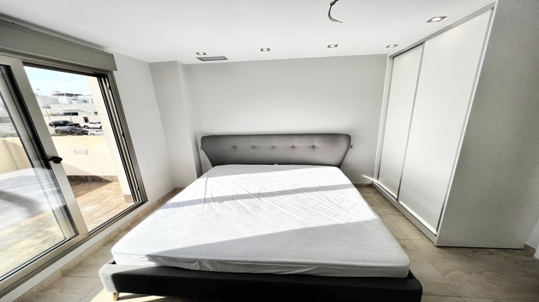 Beautiful detached villa, recently built in a popular, growing area with close proximity to supermarkets, restaurants, shops and numerous world class golf courses. Built over two levels this modern 3 bedroom, 3 bathroom villa is set on a 121m2 plot with a 3×6 private swimming pool, secluded terrace accessed from the upper level along with the stunning solarium boasting panoramic views across the pine forest and pink salt-lake. The property has an open plan living and dining room with an American style kitchen and breakfast bar. The lower level of the villa also has a guest bedroom and bathroom along with a utility room and storage cupboard. On the upper level of the villa you will find 2 big bedrooms both with en-suite bathrooms and access to the sun terrace. The property is sold with many extras including air-conditioning. Viewing recommended.