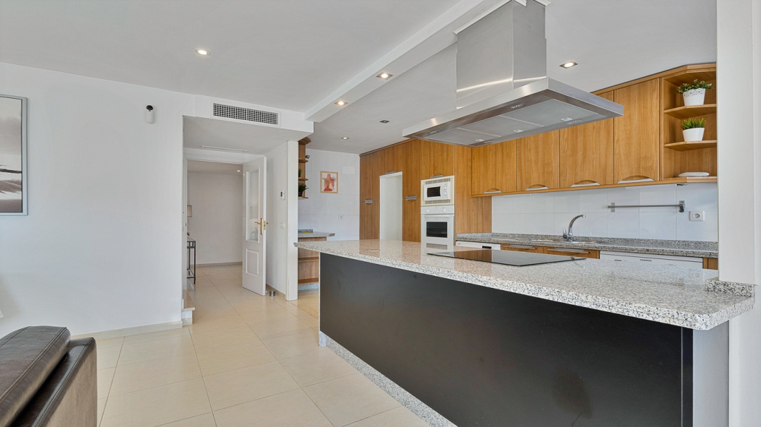 Upon entering the lower level, you are welcomed by an elegant hall that opens into a spacious living-dining area with a modern open kitchen equipped with a functional island. The open and bright layout allows daily life to flow seamlessly onto the generous pergola-covered terrace, ideal for outdoor dining and relaxing moments with a view. The double-glazed doors provide both insulation and natural light, offering direct terrace access from the living room and kitchen.