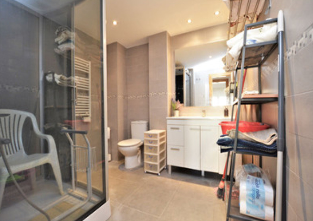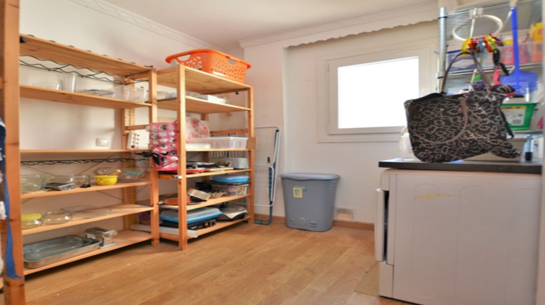 The luminous apartment features a large living and dining area, a separate fully equipped kitchen, and four bedrooms. The master suite provides a private retreat with its en-suite bathroom and dressing room, while three additional bedrooms share a bathroom. The convenience of storage space and a laundry room, along with elevator access to the apartment, enhances practicality.