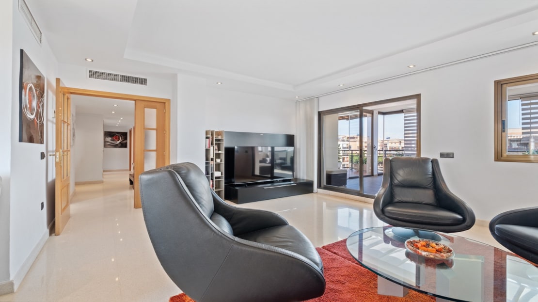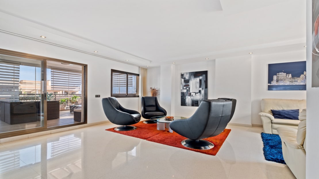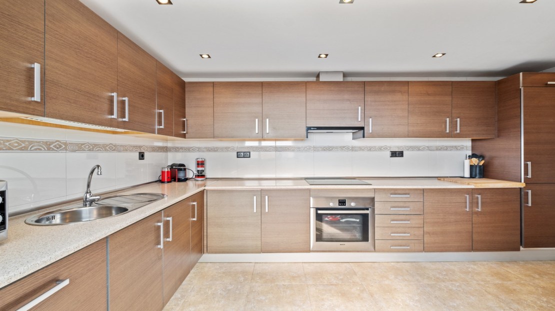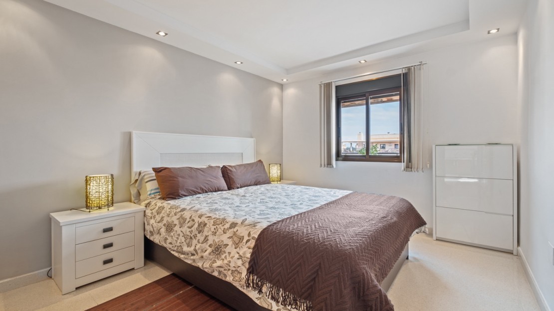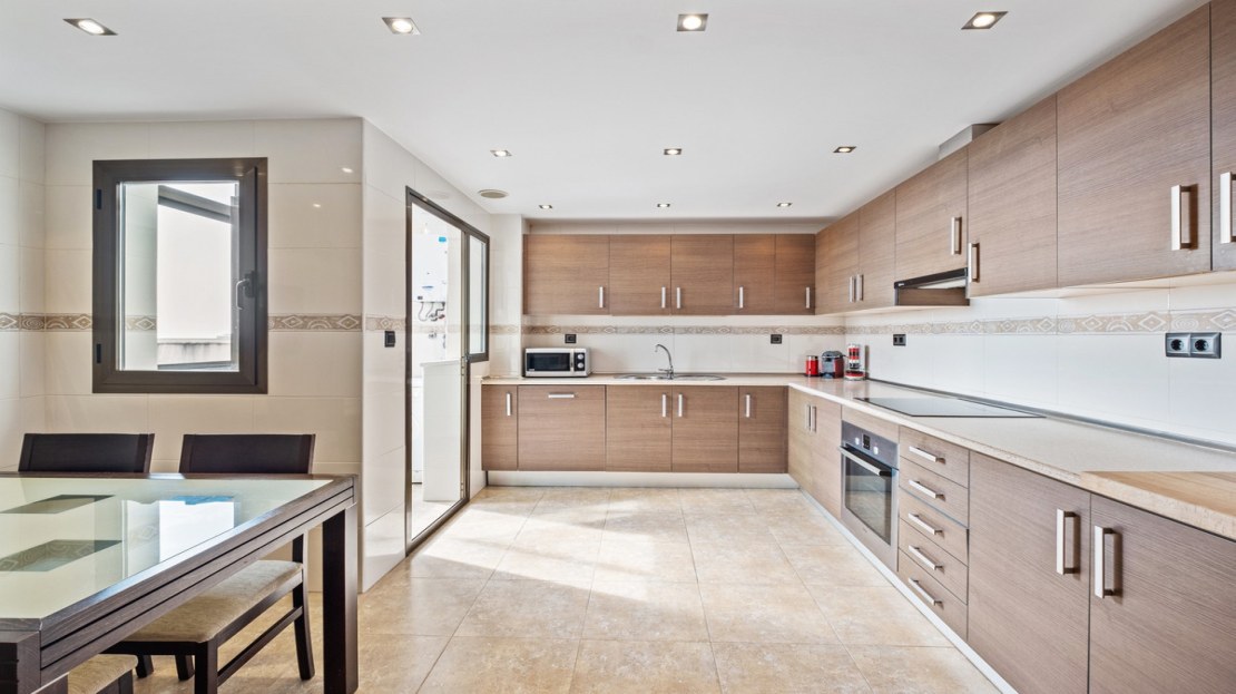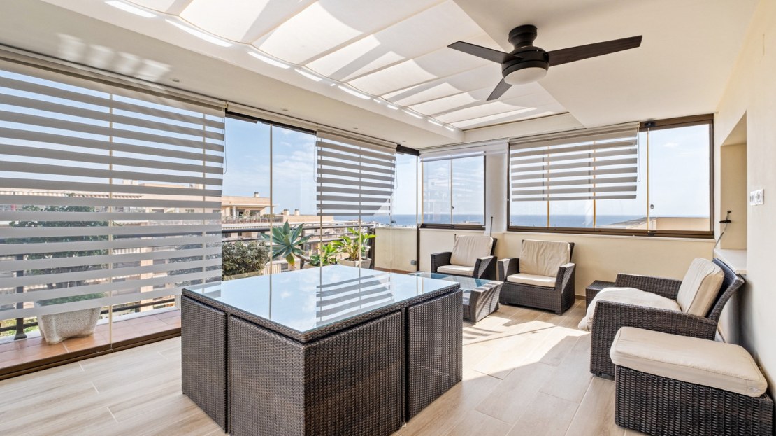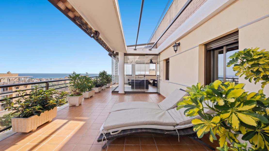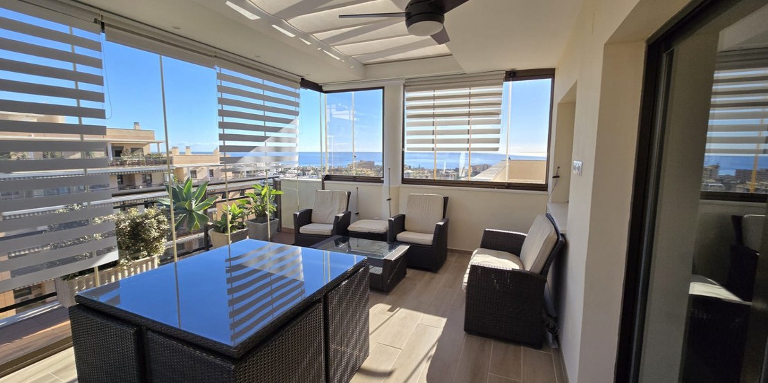 This spacious home offers 141 m² distributed across 4 double bedrooms, all exterior, and 2 bathrooms. The independent kitchen, featuring a laundry area, is like new. The bright and spacious living-dining room opens onto a huge 70 m² terrace, perfect for enjoying the Mediterranean climate. Half of the terrace is enclosed with Lumon glass, creating a cozy space to use year-round, with spectacular sea views.