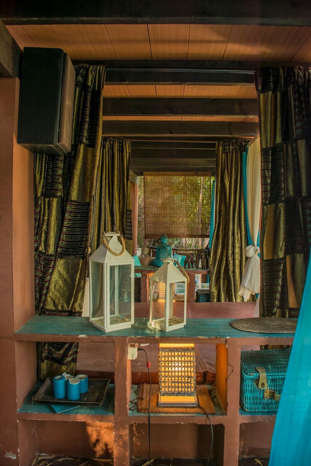 A spacious terrace with shaded areas and a serene garden reminiscent of exotic Bali.
