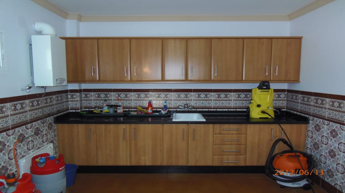 A fully equipped kitchen with appliances and cabinets. It is fully furnished, offering closets in the 4 bedrooms with beds.