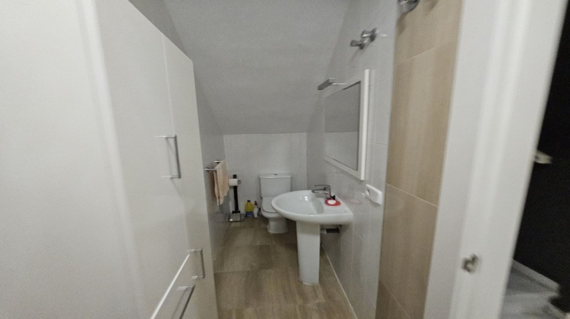 From the front door, up the stairs to the next level there are 3 bedrooms and 2 bathrooms. The master bedroom, which is very large with fitted wardrobes and has a full en suite bathroom, also has sea views from its terrace. The other 2 good sized bedrooms share a large full bathroom.