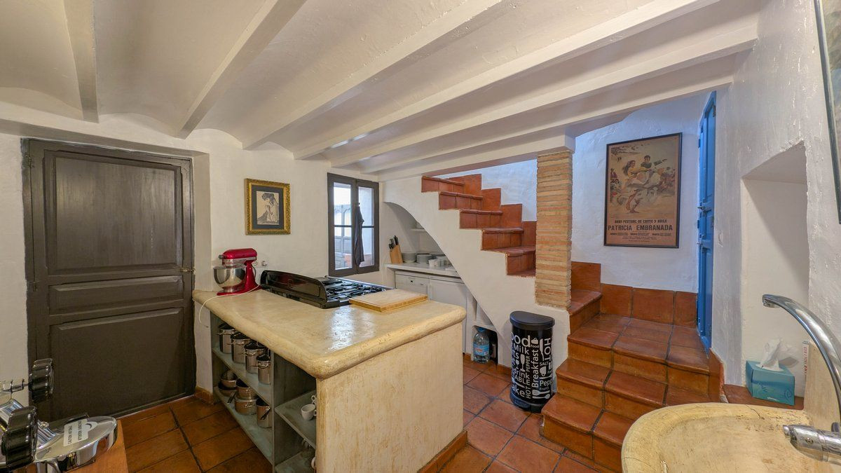 The house features an additional living-dining room, also equipped with a fireplace, offering a versatile space for enjoying time with family or friends. The summer kitchen, with an integrated barbecue, opens onto an interior patio adorned with greenery, providing a tranquil and charming retreat. There is also a second functional kitchen, adding convenience and flexibility to the home’s layout.