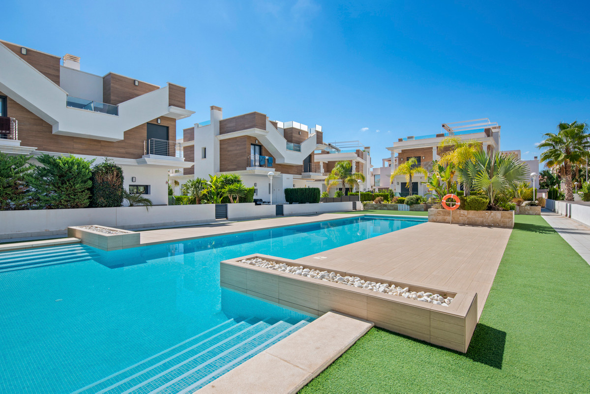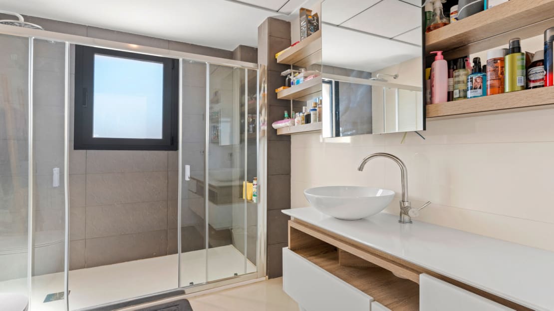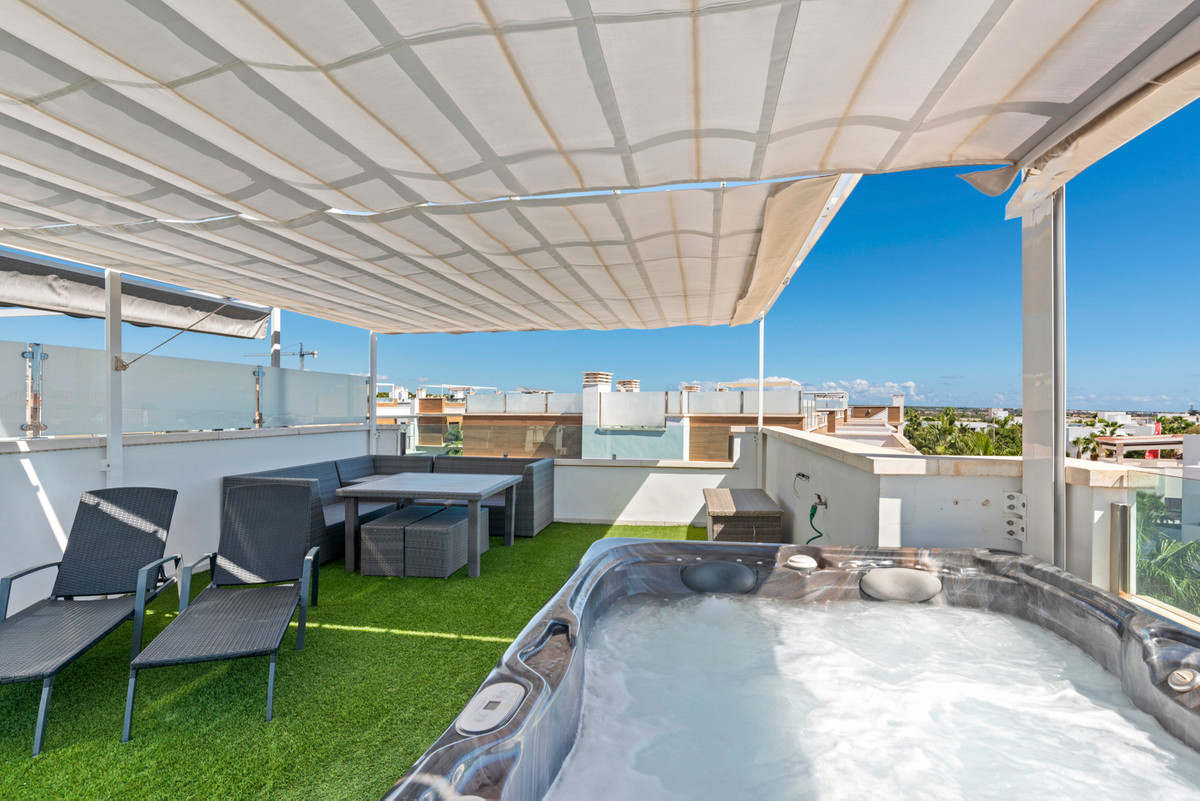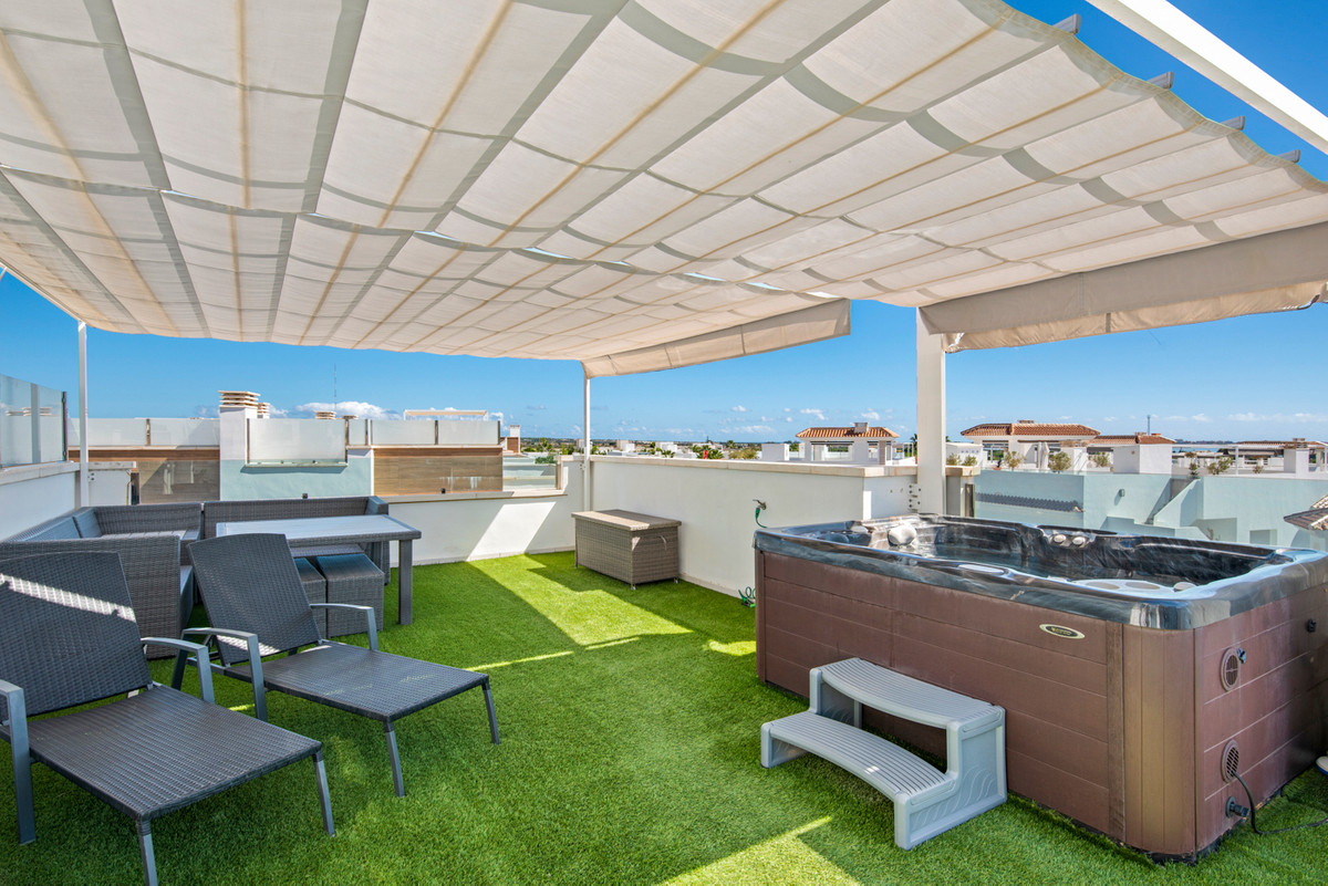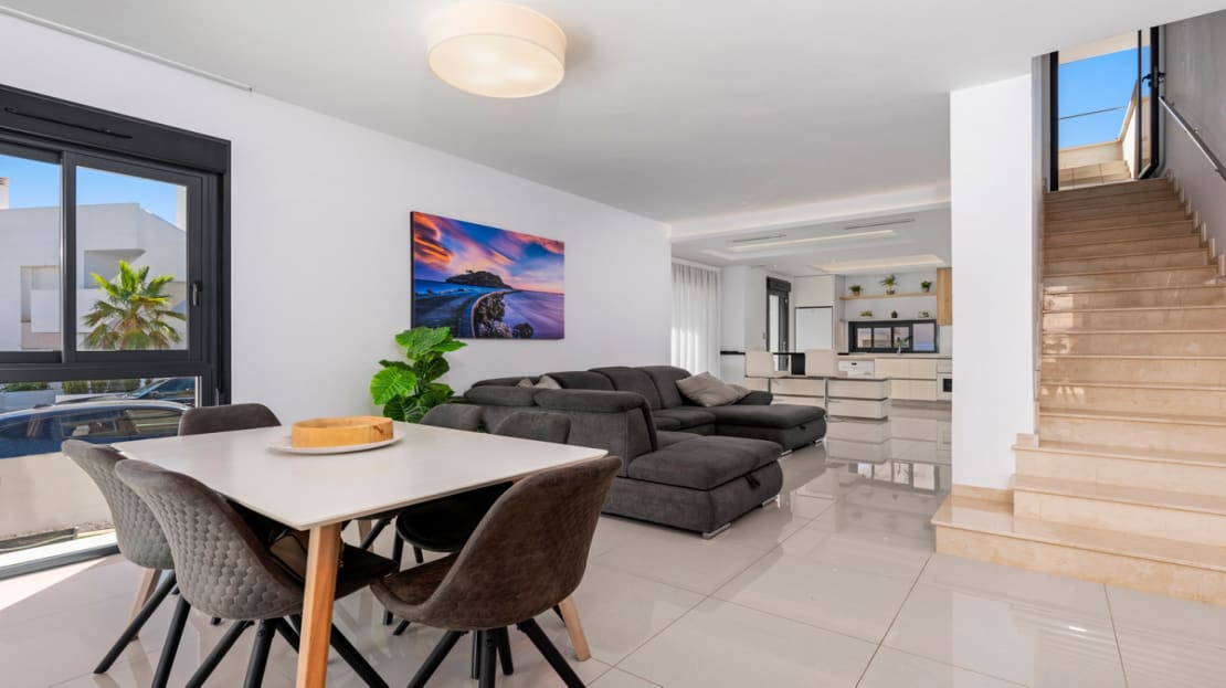 This property, built in 2017, is perfectly located in the popular Riva complex in Ciudad Quesada. On the ground floor there is a bathroom and a large living room with an open kitchen. On the underground floor there are two bedrooms with en-suite bathrooms and built-in wardrobes. On the first floor we find the main room, which has an en-suite bathroom and has access to a 5m2 balcony. On this floor we also find another room with access to a balcony and built-in wardrobes. The house also has a 5m2 solarium with a jacuzzi and incredible views of the surroundings and common areas. The solarium has an outdoor shower, artificial grass and awnings.